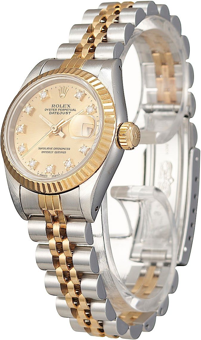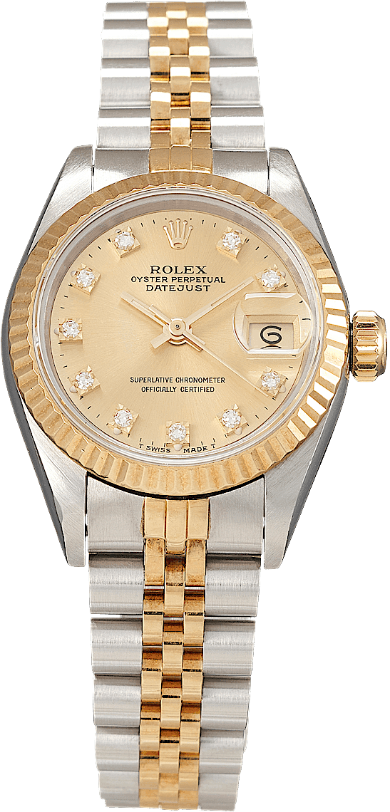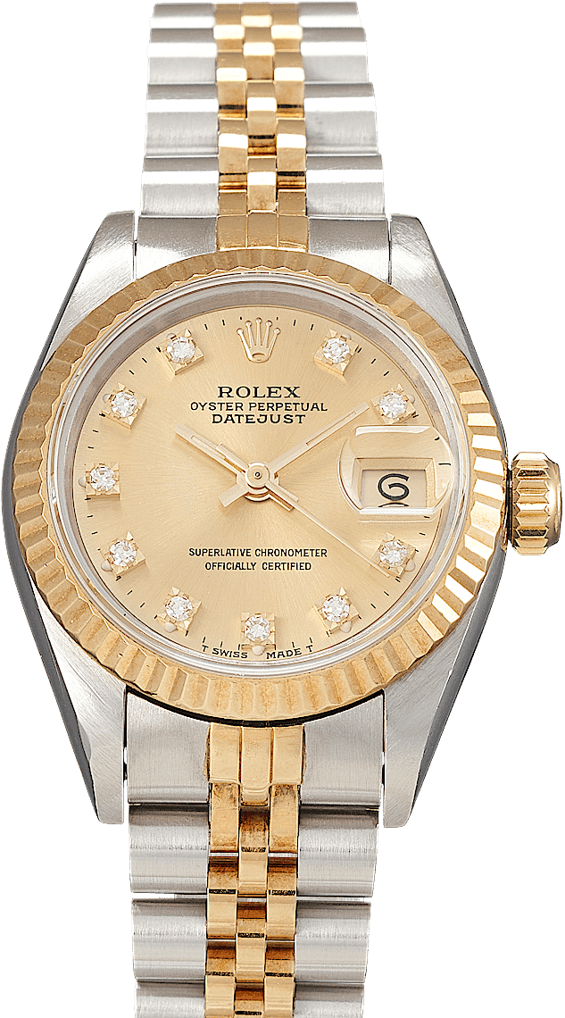 Rolex Lady-Datejust, Reference: 69173, Gender: Female, Size: 26mm, Dial color: Champagne, Strap material: Stainless Steel Yellow Gold, Movement: Automatic, Condition: The luxury watch is older than 20 years. timepiece has been worn and may have visible signs of usage ageing. movement inspected the case polished. An inspection by our certified watchmakers guarantees its authenticity. Please note that water resistance vintage watches not guaranteed., Documents: Chronext Certificate
