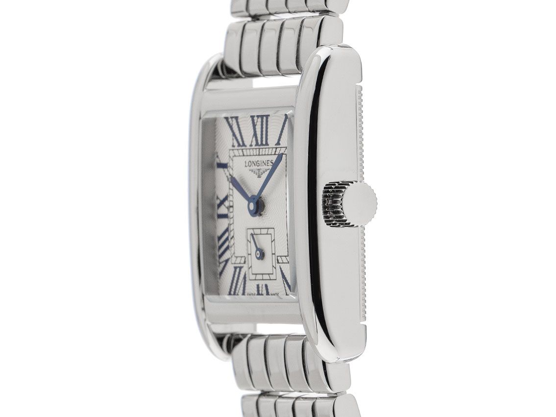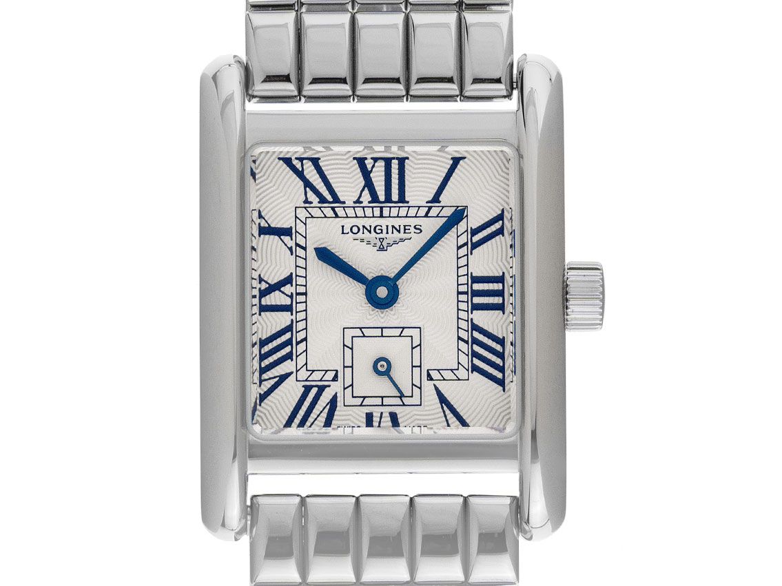 Boîtier en acier inoxydable poli, rectangulaire, dimensions du boîtier sans couronne (L x l x H) 29 x 21,5 x 6,7 mm. Lunette en acier inoxydable lisse et polie. Bracelet en acier inoxydable poli, fermoir déployant à double sécurité caché en acier inoxydable avec logo du fabricant. Cadran argenté avec effet Fliquet, chiffres romains bleuis et aiguilles bleuis. Mouvement à quartz, calibre Longines L178. Affichage des heures et des minutes par aiguilles centrales, petite seconde avec stop-seconde pour un réglage précis de l'heure à 6 heures. Verre saphir résistant aux rayures. Couronne cannelée. Fond en acier inoxydable gravé. Poids de la montre avec bracelet 73 g, longueur du bracelet avec boîtier 175 mm. Numéro de référence : L5.200.4.71.6, ID : ST580629480925H-2050, numéro d'article : 10000082336. Boîte Longines originale avec carton d'emballage et papiers de garantie de septembre 2025, Full Set. Non porté. Délai de livraison immédiat.