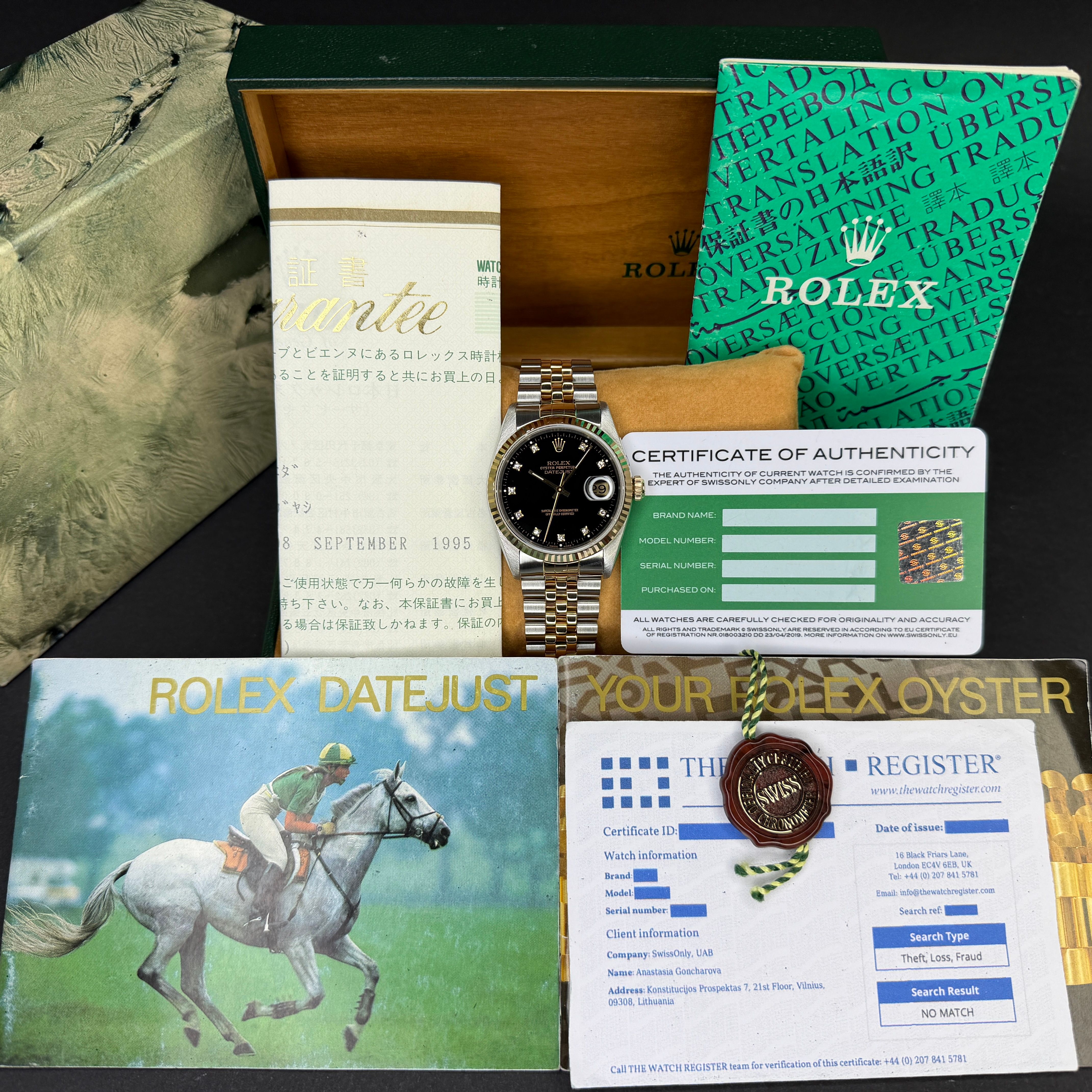 Rolex Datejust, 16233, 36mm, 1991, Two-Tone, Black Small Diamond dial, Fullset, 1y warranty