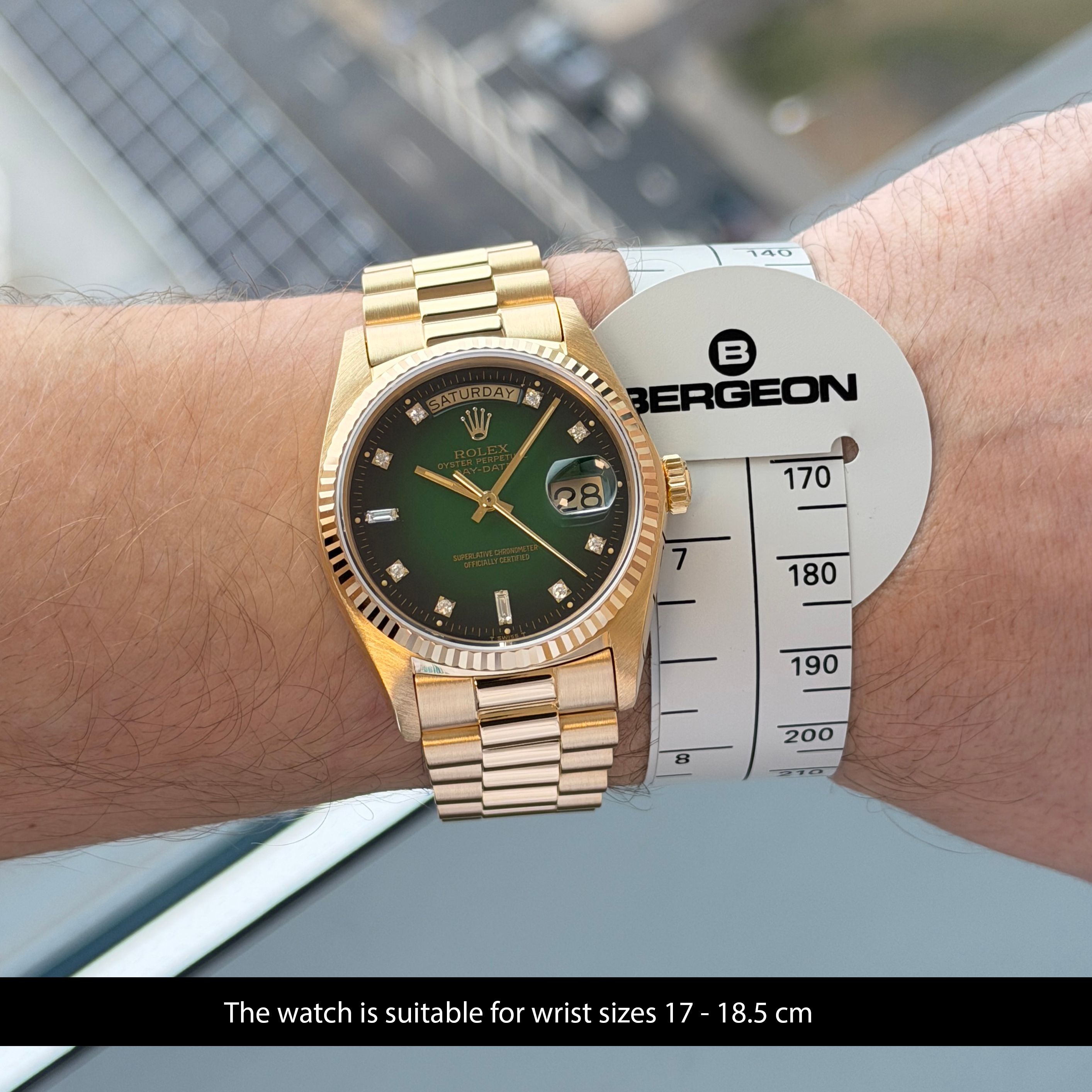 Rolex Day Date, 18038, 36mm, 1978, Yellow gold, Green Vignette Small Diamond dial, Box, 1y warranty