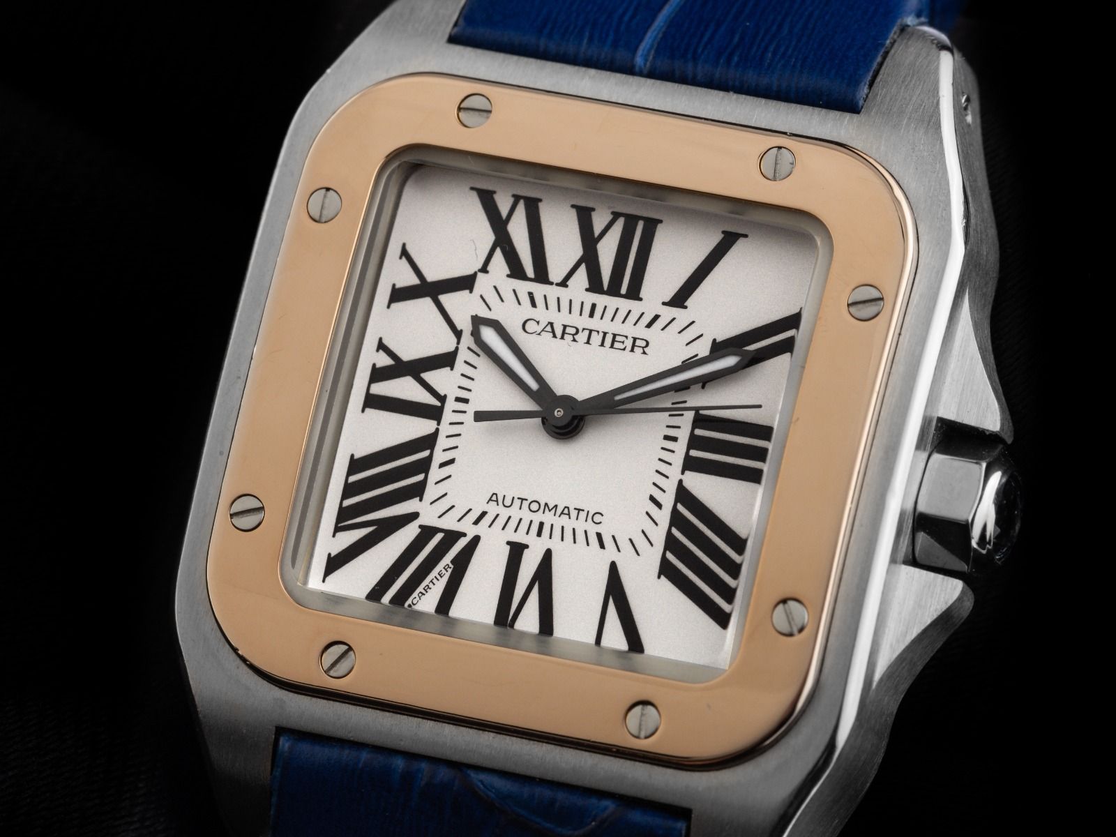 Cartier Santos 100 GM Großes Modell Stahl 18kt Roségold Automatik Armband Leder FaltschließeGehäuse Edelstahl poliert und satiniert, Gehäusemaße ohne Krone 44 x 33mm, Gehäusehöhe 10,9mm. Lünette 18kt Roségold 8-fach verschraubt. Armband Krokoleder blau, Anstoßbreite 20mm, Cartier Doppelfaltschließe Edelstahl. Zifferblatt weiß mit schwarzen römischen Ziffern und schwarzen Zeigern. Uhrwerk Automatik, Kaliber 076 mit 26 Edelsteinen. Anzeige von Stunde, Minute und Sekunde über Zeiger aus der Mitte mit Sekundenstopp zur sekundengenauen Einstellung der Uhrzeit. Saphirglas kratzfest und gewölbt. Krone mit Flankenschutz und blauem Spinell. Boden Edelstahl 8-fach verschraubt und graviert. Gewicht der Uhr inklusive Armband 103g. Referenznummer: 2878, Gehäusenummer: 57659XXX, ID: P285790000426H-9200, Artikelnummer: 10000085565. Mit Gangkontrolle und kompletter äußerlicher Aufarbeitung von April 2026. Original Cartier Box und Garantie Papiere von Juni 2015 sowie Beschreibung und Watchregister Auszug von April 2026, The Watch Register Zertifikat / ohne Eintrag (Internationale Datenbank für verlorene oder gestohlene Uhren), Full Set. Superschnäppchen, Kapitalanlage mit Wertsteigerungspotential, aus erster Hand, fast nicht getragen. Wie Neu. Lieferzeit sofort.
