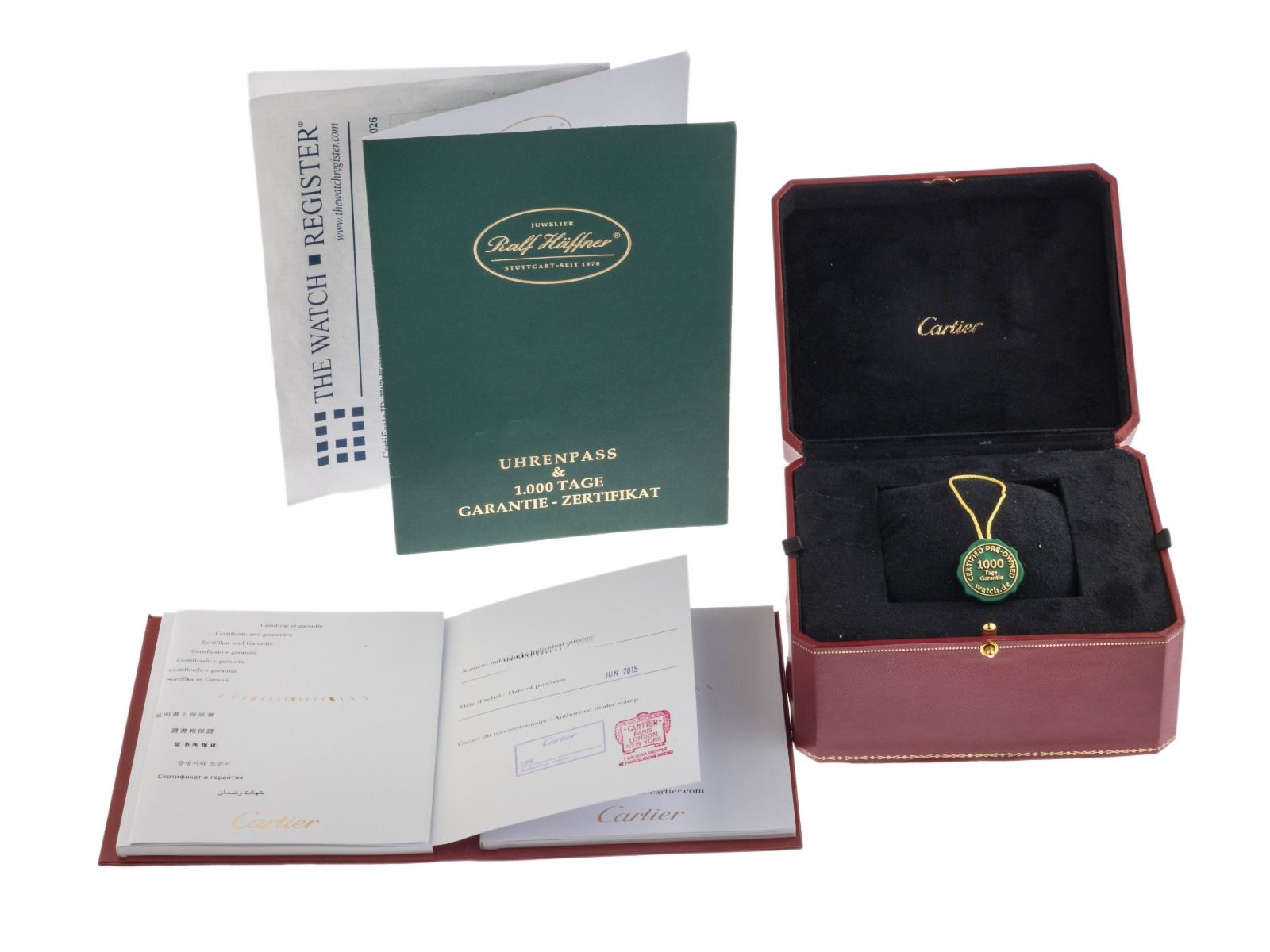Inklusive certified pre owned Siegel / Uhrenpass mit einem Farbbild, der genauen Beschreibung sowie dem Wiederbeschaffungswert der Uhr über 9200,-€ und 1000 Tage Garantie ab Kaufdatum.