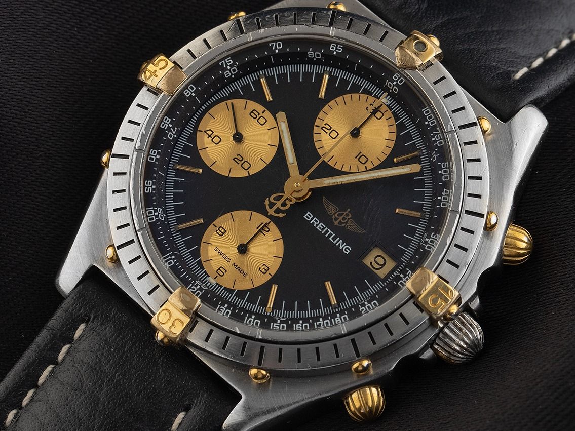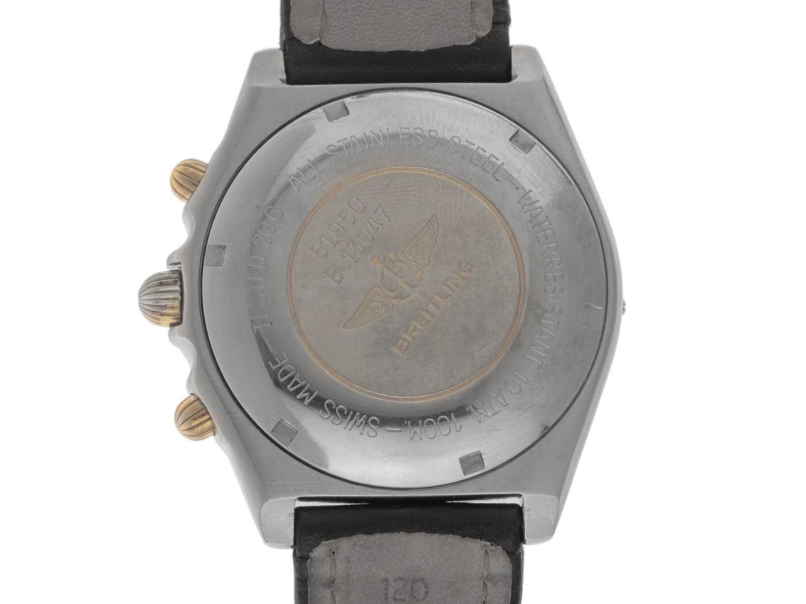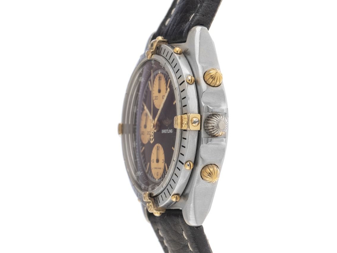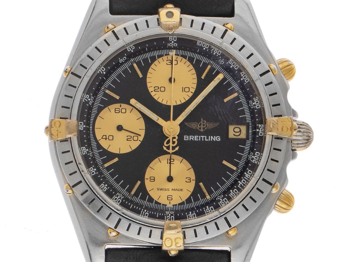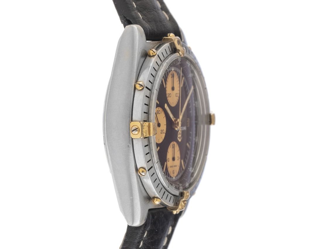 Breitling Chronomat Stahl 18kt Gelbgold Automatik Chronograph Armband LederGehäuse Edelstahl satiniert, Gehäusedurchmesser ohne Krone 40mm, Gehäusehöhe 14,5mm. Lünette Edelstahl poliert und satiniert mit 60-Minuten Skala und gelbgoldenen Reitern, einseitig drehbar mit Sperre. Armband Leder schwarz mit Ziernaht, Anstoßbreite 20mm, Stiftschließe Edelstahl mit Hersteller-Logo. Zifferblatt schwarz mit aufgesetzten gelbgoldenen Indexen und gelbgoldenen Zeigern sowie gelbgoldene Hilfszifferblätter. Uhrwerk Automatik, Chronograph. Anzeige von Stunde und Minute über Zeiger aus der Mitte, kleine Sekunde mit Sekundenstopp zur sekundengenauen Einstellung der Uhrzeit bei 9 Uhr, Datumsanzeige mit Schnellverstellung bei 3 Uhr. Saphirglas gewölbt und bombiert. Zwiebelkrone verschraubbar mit Flankenschutz. Boden Edelstahl verschraubt und graviert. Gewicht der Uhr inklusive Armband 89g, Länge des Armbandes inklusive Gehäuse 145 - 185mm, siehe Bild Nummer 8. Referenznummer: B13047, Gehäusenummer: 70XXX, ID: P287526000426HW-4900, Artikelnummer: 10000085584. Original Breitling Box sowie Watchregister Auszug von April 2026, The Watch Register Zertifikat / ohne Eintrag (Internationale Datenbank für verlorene oder gestohlene Uhren). Superschnäppchen, sehr seltenes Sammlerstück. Original unpoliert, kann auf Wunsch kostenlos aufgearbeitet werden. Lieferzeit sofort.