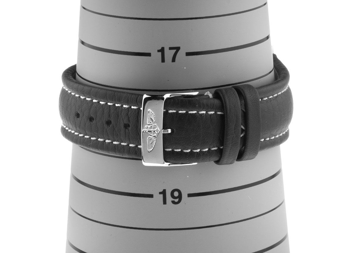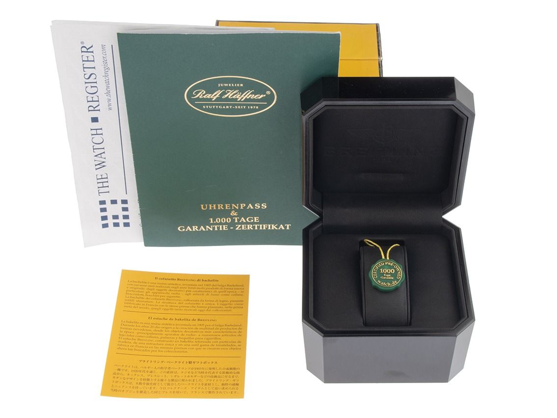 Boîtier en acier inoxydable satiné, diamètre du boîtier sans couronne 40mm, hauteur du boîtier 14,5mm. Lunette en acier poli et satiné avec échelle de 60 minutes et rehauts en or jaune, unidirectionnelle avec verrouillage. Bracelet en cuir noir avec surpiqûre, largeur de corne 20mm, boucle ardillon en acier inoxydable avec logo du fabricant. Cadran noir avec index en or jaune appliqués et aiguilles en or jaune ainsi que sous-cadrans en or jaune. Mouvement automatique, chronographe. Affichage des heures et des minutes par aiguilles centrales, petite seconde avec stop-seconde pour un réglage précis de l'heure à 9 heures, affichage de la date avec réglage rapide à 3 heures. Verre saphir bombé et courbé. Couronne en forme d'oignon vissée avec protection. Fond en acier inoxydable vissé et gravé. Poids de la montre avec bracelet 89g, longueur du bracelet avec boîtier 145 - 185mm, voir image numéro 8. Numéro de référence : B13047, numéro de boîtier : 70XXX, ID : P287526000426HW-4900, numéro d'article : 10000085584. Boîte Breitling d'origine ainsi qu'un extrait du Watch Register d'avril 2026, certificat The Watch Register / sans inscription (base de données internationale pour montres perdues ou volées). Super affaire, pièce de collection très rare. Original non poli, peut être remis en état gratuitement sur demande. Délai de livraison immédiat.