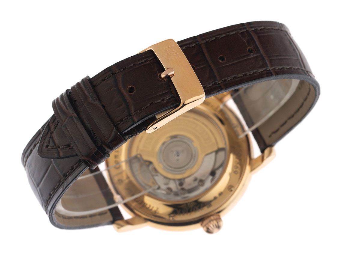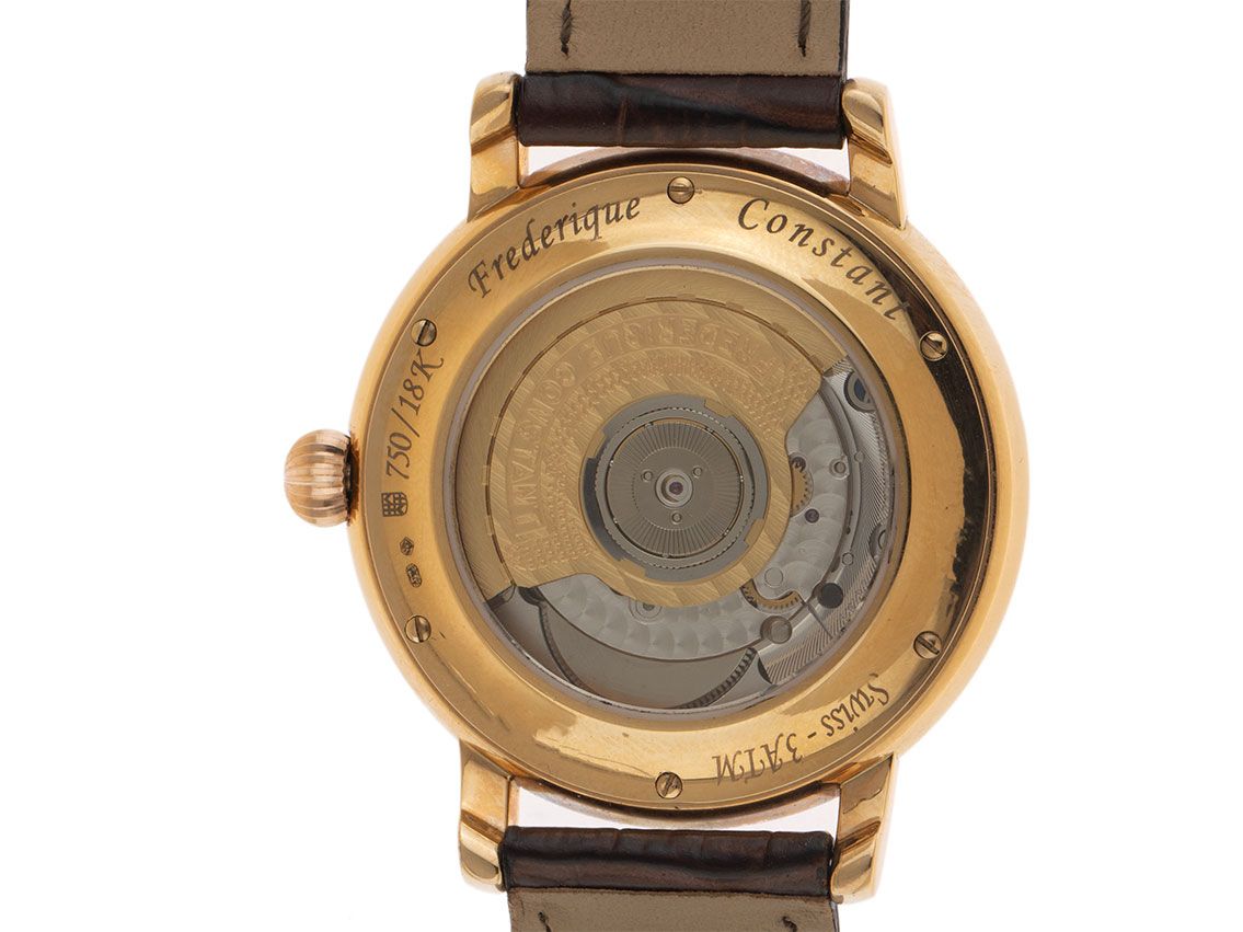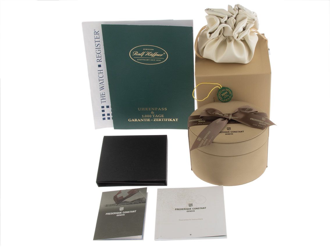 Boîtier en or rose 18kt poli, diamètre du boîtier sans couronne 38mm, hauteur du boîtier 9,2mm. Bracelet en cuir croco marron avec surpiqûre, largeur d'attache 18mm, boucle ardillon en or rose plaqué avec logo du fabricant. Cadran argenté avec décor "Guilloché Clous de Paris", chiffres romains noirs et aiguilles noires polies. Mouvement automatique, calibre manufacture Frederique Constant avec 27 pierres précieuses. Affichage des heures et des minutes par aiguilles centrales, petite seconde avec stop-seconde pour un réglage précis de l'heure à 6 heures, affichage de la date avec réglage rapide à 3 heures. Verre saphir résistant aux rayures. Fond en or rose 18kt, 6 fois vissé et gravé avec fenêtre en verre saphir. Poids de la montre avec bracelet 51g. Numéro de référence : 345X3P9, numéro de boîtier : 1501XXX, ID : P288150000426HW-6900, numéro d'article : 10000085597. Avec contrôle de marche et révision extérieure complète d'avril 2026. Boîte originale Frederique Constant avec carton d'emballage et papiers de garantie de juin 2015 ainsi que description et extrait du registre de montre d'avril 2026, certificat The Watch Register / sans inscription (base de données internationale pour montres perdues ou volées), Full Set. Super affaire, investissement avec potentiel de valorisation, de première main, presque pas portée. Très bon état. Délai de livraison immédiat.