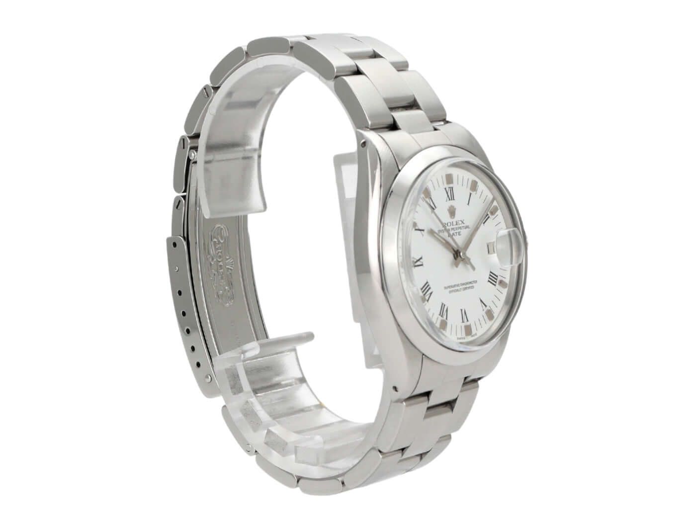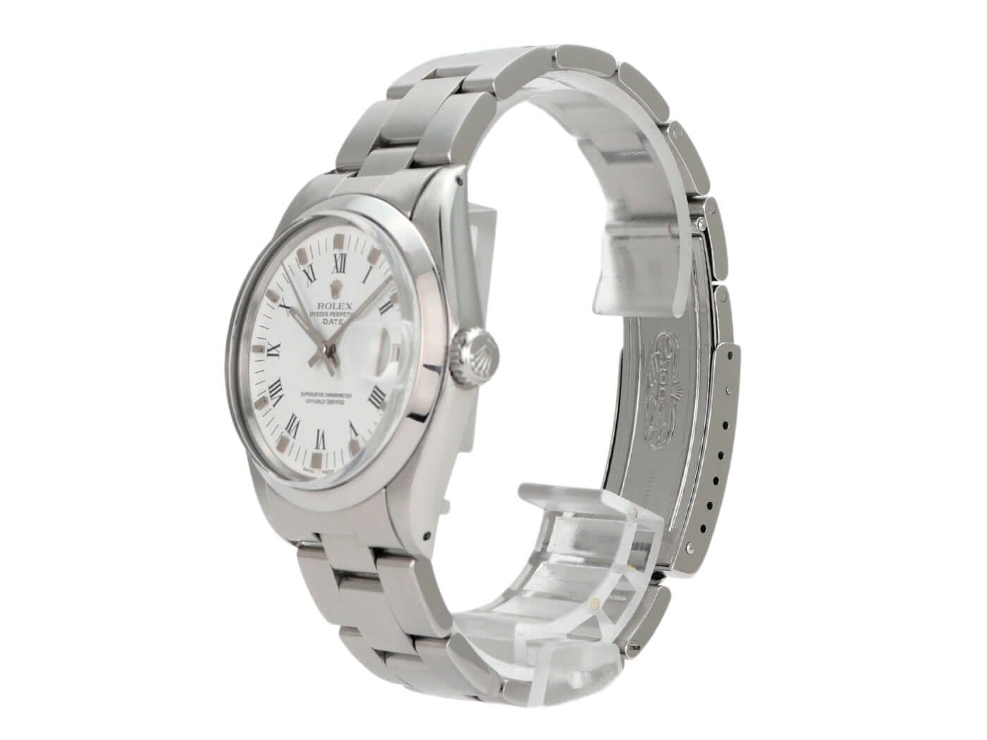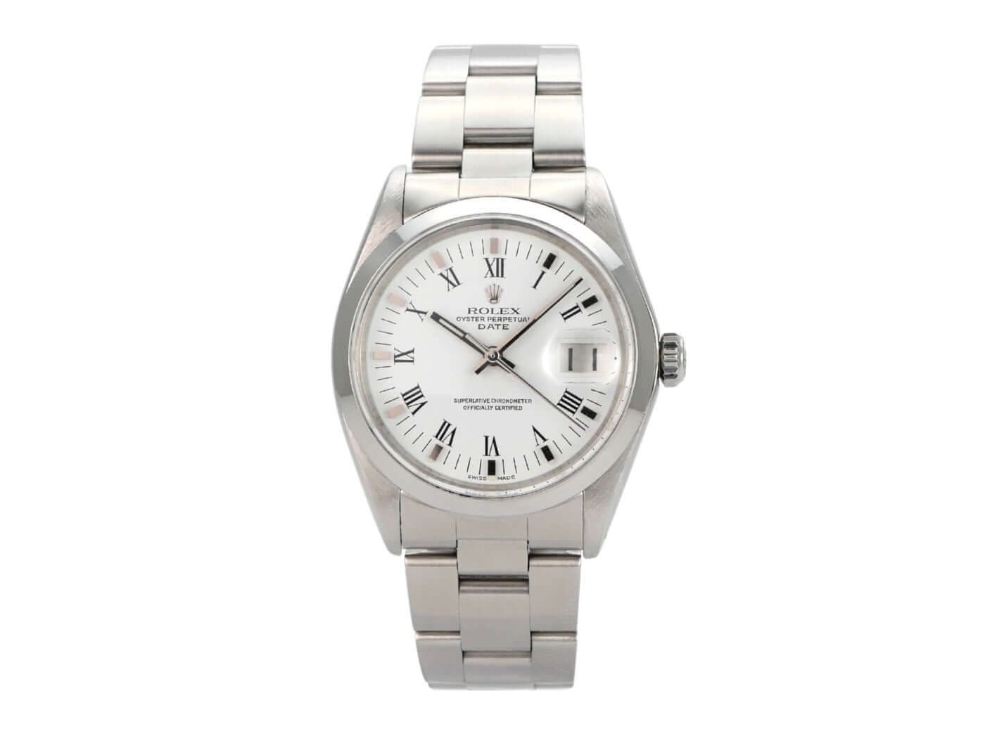 Rolex Oyster Perpetual Date 34 1500/0 Case made of polished and satin-finished stainless steel, case diameter 34 mm, polished stainless steel bezel, polished and satin-finished Oyster stainless steel bracelet with folding clasp, white dial, automatic movement, Rolex manufacture caliber, 19,800 A/h, date display, chronometer, plexiglass, screw-down crown, screw-down stainless steel case back, water-resistant up to 10 bar. Used watch, very good condition, without box and papers, Rolex service card from 2023, delivery from around 1973.