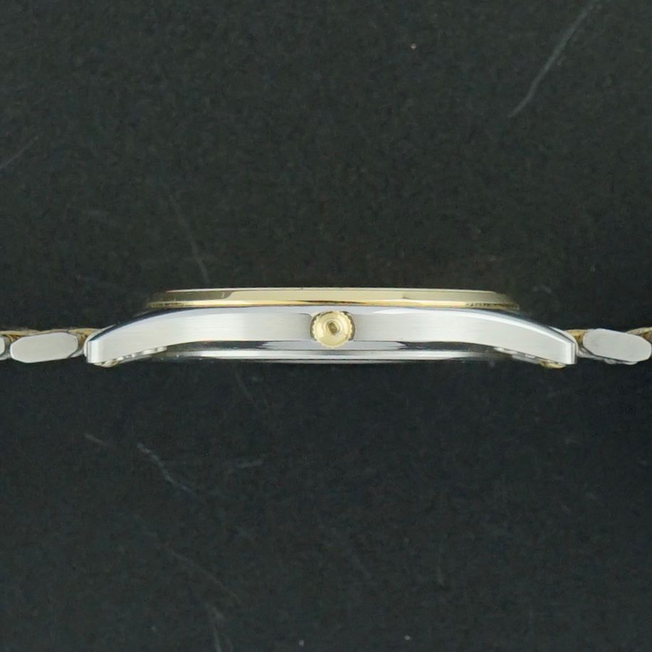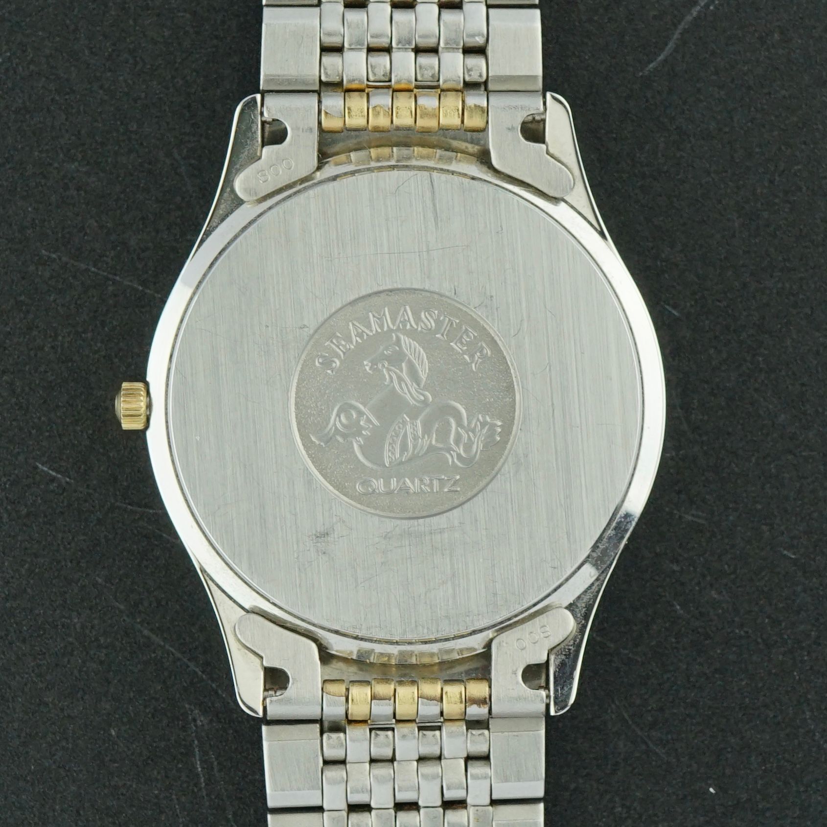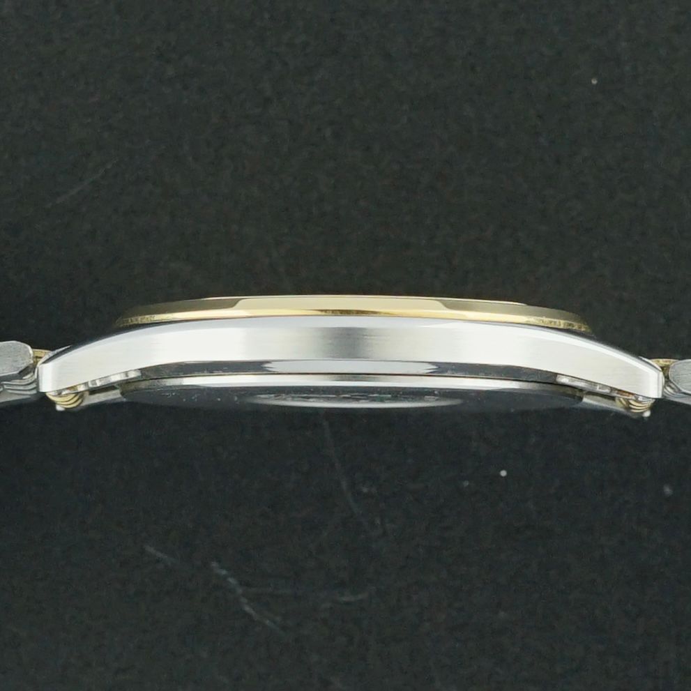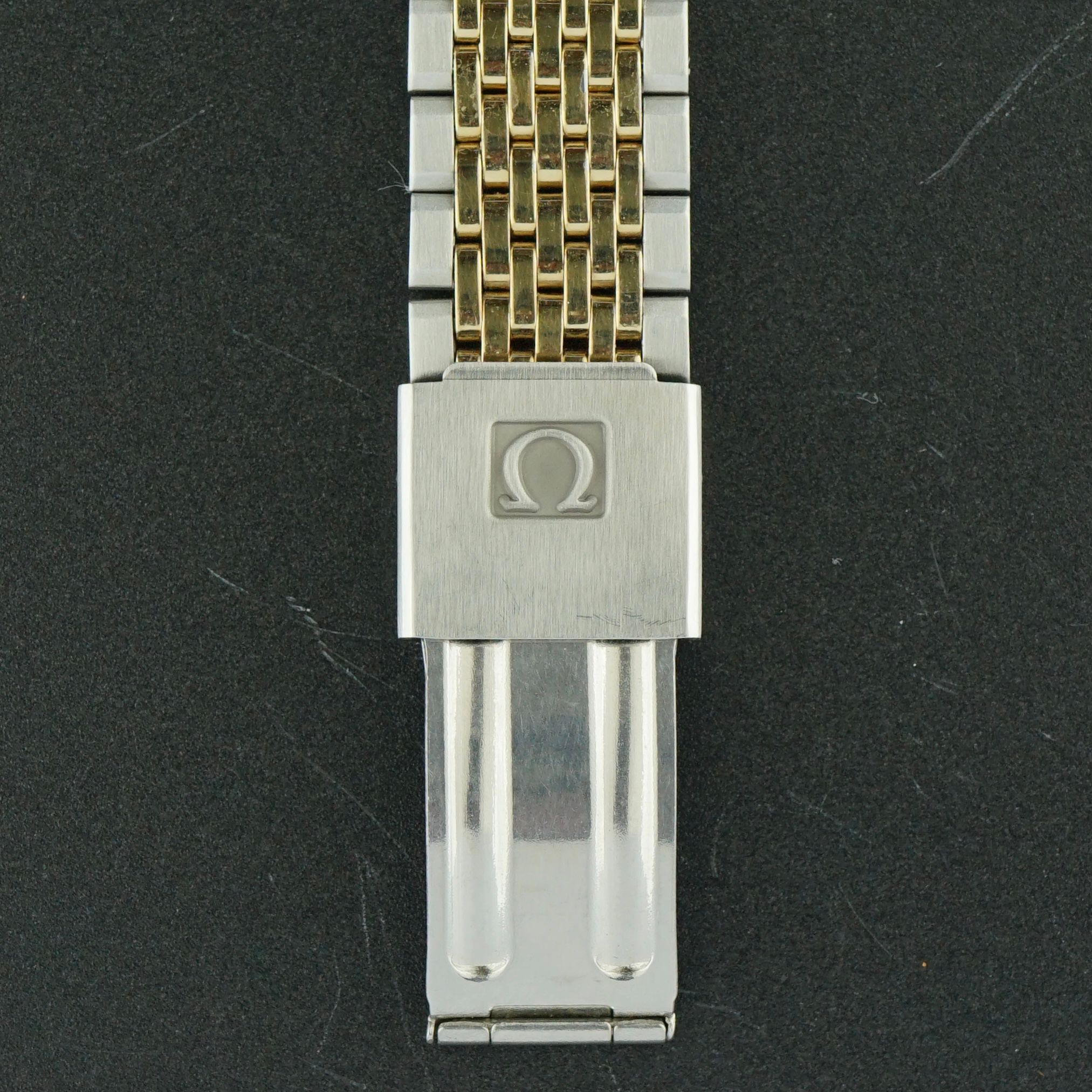 A Vintage Omega Seamaster Brest from 1982 in beautiful condition, retaining its original polish with a refined mix of brushed and high polish finishes. The golden colored dial is complemented by elegant silver accents. Powered by a caliber 1430 quartz movement, overhauled in April 2026 and now running and functioning excellently. The watch is fitted on its original two tone bracelet in Jubilee style, with brushed steel outer links and high polish gold plated inner links, fully linked and suitable for wrists up to approximately 20.5 cm. This example stands out as a true full set, including the original box, tag, manual booklet, international guarantee booklet, stamped guarantee card, original tag displaying the serial number, movement number, and reference number, as well as the original plastic card holder, making it a complete and highly collectible piece ready to be worn and enjoyed.Year of production: 1982