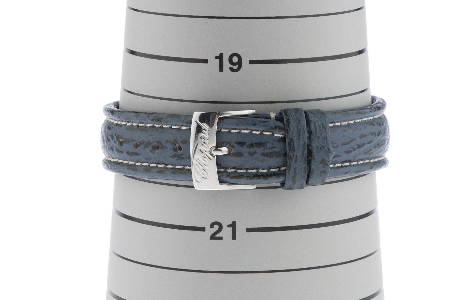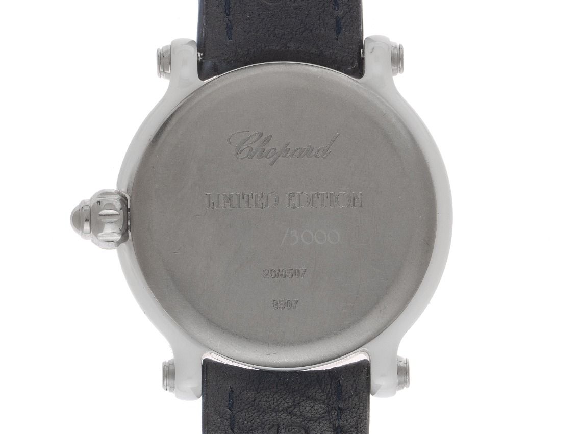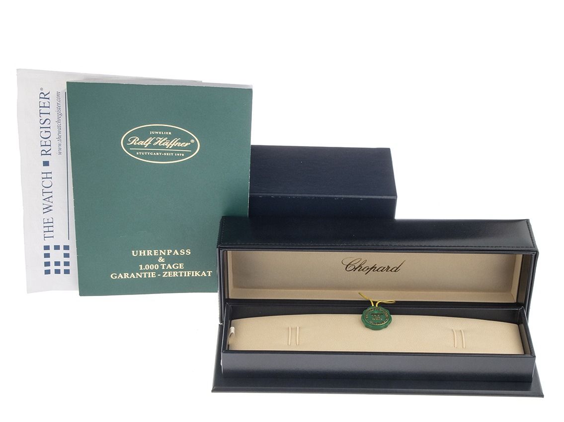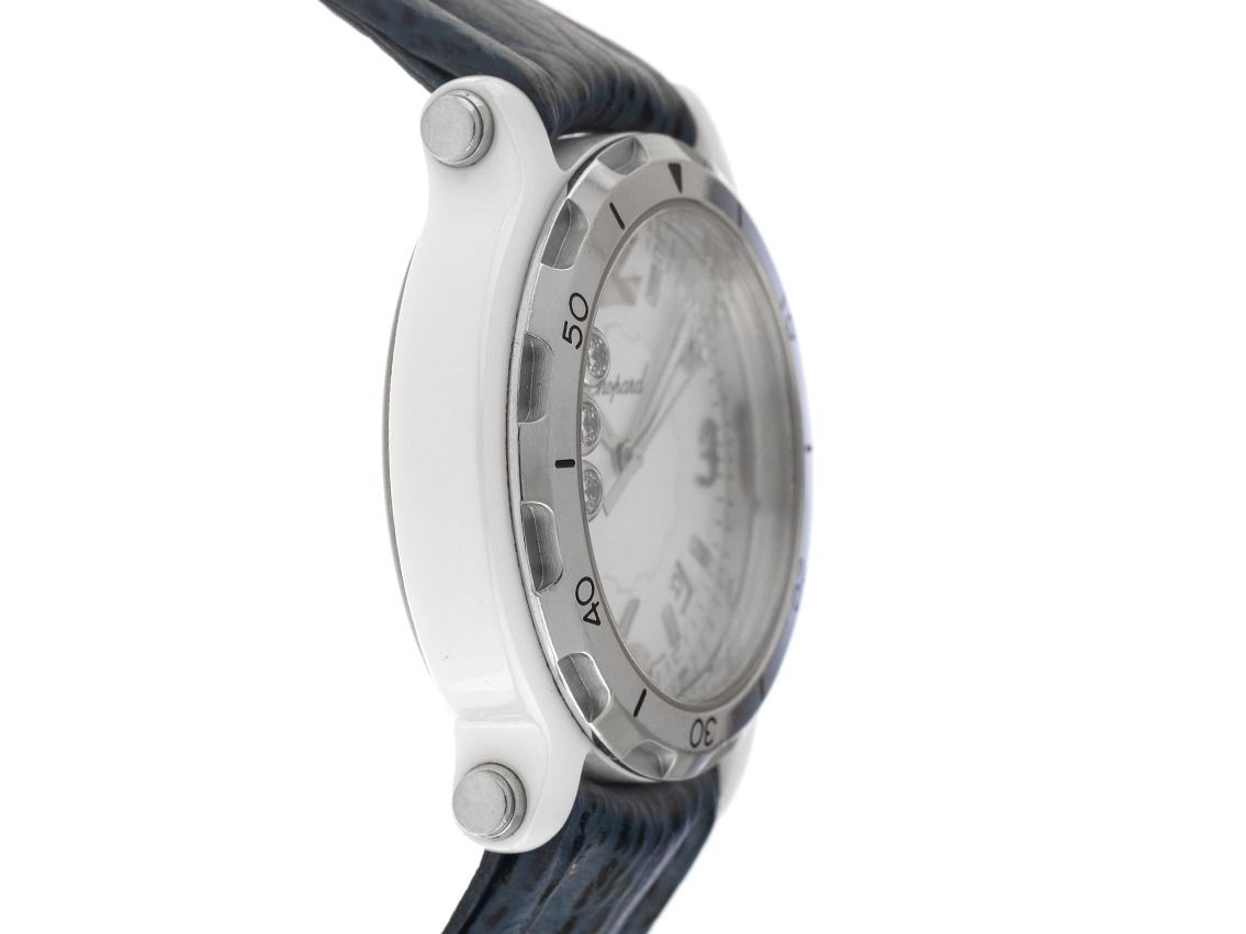 Boîtier en céramique poli, diamètre du boîtier sans couronne 38mm, hauteur du boîtier 11,4mm. Lunette en acier inoxydable avec échelle de 60 minutes. Bracelet Chopard en cuir bleu avec surpiqûre, largeur d'attache 19mm, boucle ardillon en acier inoxydable avec logo du fabricant. Cadran blanc avec 3 diamants mobiles, chiffres arabes en acier inoxydable appliqués, index en acier inoxydable et aiguilles en acier inoxydable. Mouvement à quartz. Affichage de l'heure, des minutes et des secondes par aiguilles centrales avec stop-seconde pour un réglage précis de l'heure, affichage de la date avec réglage rapide entre 4 et 5 heures. Verre saphir résistant aux rayures. Couronne encastrée dans le boîtier. Fond en acier inoxydable gravé. Poids de la montre incluant le bracelet 59g, longueur du bracelet incluant le boîtier 170 - 205mm, voir image numéro 8. Numéro de référence : 28/8507, année de fabrication : 2015, ID : P290044000426HW-5500, numéro d'article : 10000085646. Boîte Chopard originale avec carton d'emballage et extrait du Watch Register de mars 2026, certificat The Watch Register / sans inscription (base de données internationale pour les montres perdues ou volées). Limité à 3000 exemplaires. Super affaire, pièce de collection très rare. Très bon état. Délai de livraison immédiat.