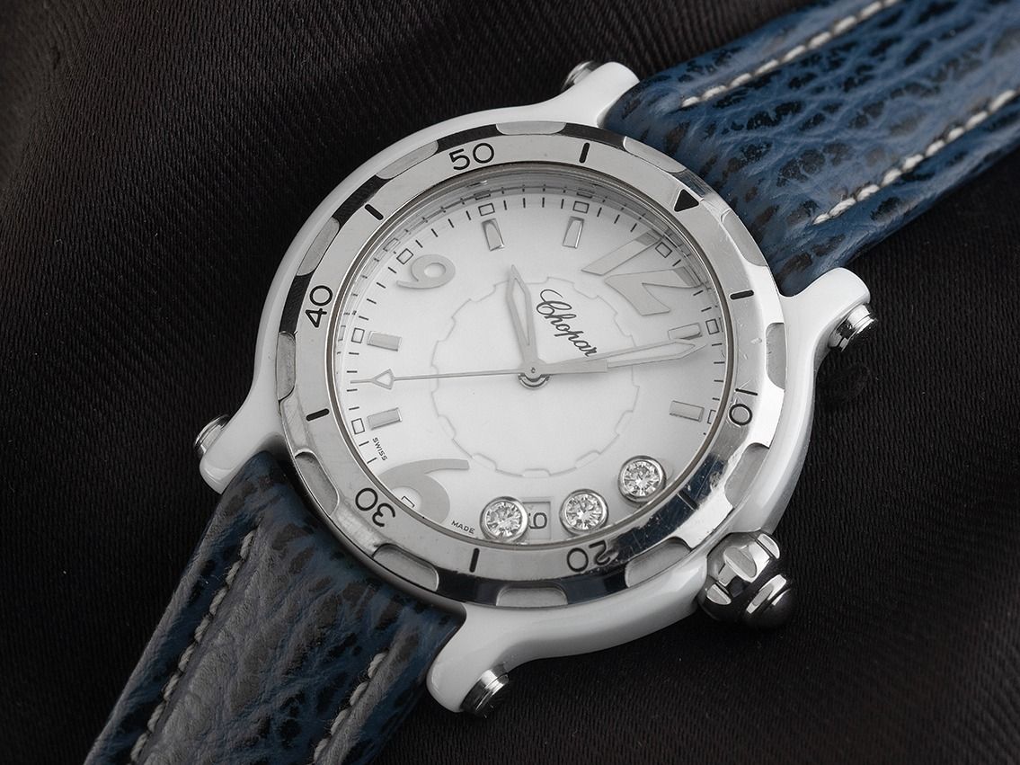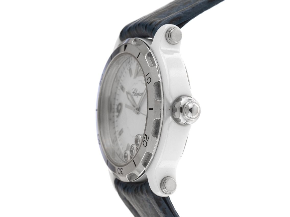 Chopard Happy Sport Keramik Diamanten Quarz Armband LederGehäuse Keramik poliert, Gehäusedurchmesser ohne Krone 38mm, Gehäusehöhe 11,4mm. Lünette Edelstahl mit 60-Minuten Skala. Chopard Armband Leder blau mit Ziernaht, Anstoßbreite 19mm, Stiftschließe Edelstahl mit Hersteller-Logo. Zifferblatt weiß mit 3 beweglichen Brillanten, aufgesetzten arabischen Edelstahl Ziffern, Edelstahl Indexen und Edelstahl Zeigern. Uhrwerk quarzgesteuert. Anzeige von Stunde, Minute und Sekunde über Zeiger aus der Mitte mit Sekundenstopp zur sekundengenauen Einstellung der Uhrzeit, Datumsanzeige mit Schnellverstellung zwischen 4 und 5 Uhr. Saphirglas kratzfest. Krone im Gehäuse eingelassen. Boden Edelstahl graviert. Gewicht der Uhr inklusive Armband 59g, Länge des Armbandes inklusive Gehäuse 170 - 205mm, siehe Bild Nummer 8. Referenznummer: 28/8507, Baujahr: 2015, ID: P290044000426HW-5500, Artikelnummer: 10000085646. Original Chopard Box mit Umkarton und Watchregister Auszug von März 2026, The Watch Register Zertifikat / ohne Eintrag (Internationale Datenbank für verlorene oder gestohlene Uhren). Limitiert auf 3000 Exemplare. Superschnäppchen, sehr seltenes Sammlerstück. Sehr guter Zustand. Lieferzeit sofort.