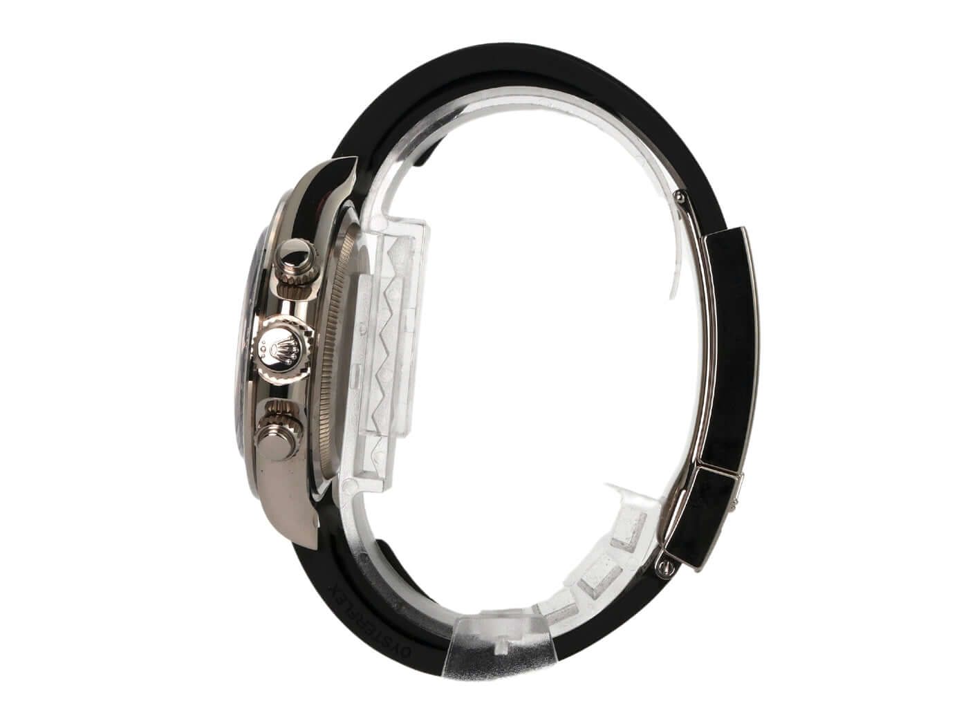 Boîtier en or blanc 18 kt poli et satinée, diamètre du boîtier 40 mm, hauteur du boîtier 12,4 mm, lunette en céramique avec échelle tachymétrique, bracelet Oysterflex noir avec boucle déployante en or blanc 18 kt, cadran gris, totalisateurs noirs, mouvement automatique, calibre Rolex 4131 avec 47 rubis, fréquence de 28 800 A/h, réserve de marche d'environ 72 heures, chronographe, chronomètre, verre saphir résistant aux rayures, couronne vissée en or blanc 18 kt avec protection latérale, fond vissé en or blanc 18 kt, étanche jusqu'à 10 bar.