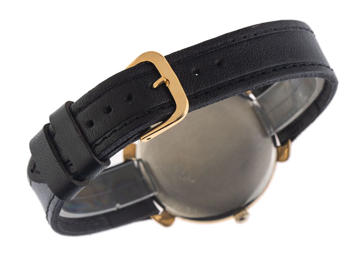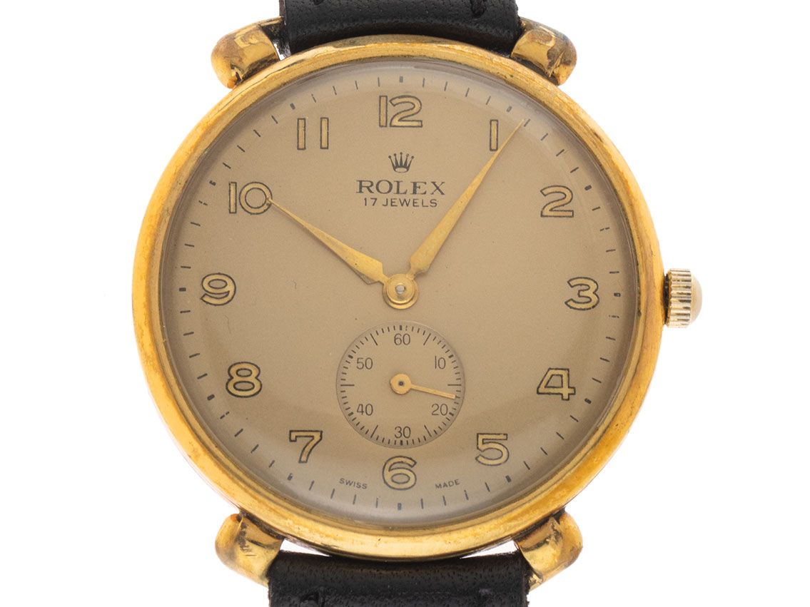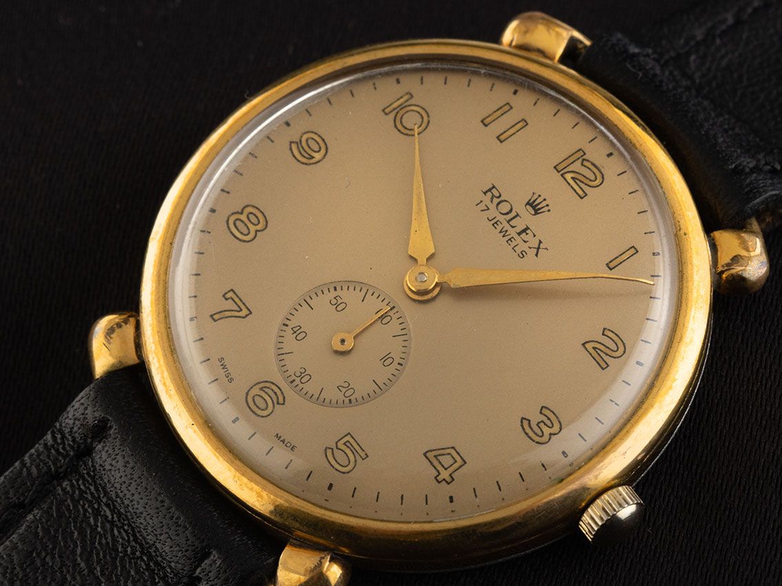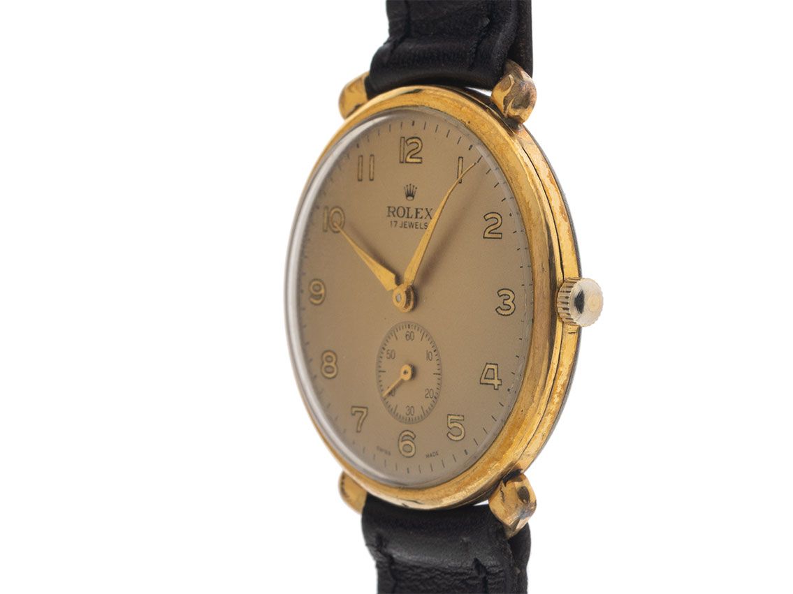 Rolex Oyster Acier Or Jaune Remontage Manuel Bracelet Cuir Boîtier en acier inoxydable doré et poli, diamètre du boîtier sans couronne 35mm, hauteur du boîtier 9,2mm. Bracelet en cuir noir avec surpiqûre, largeur de l'entre-corne 15mm, boucle à ardillon en acier inoxydable doré. Cadran couleur champagne avec chiffres arabes en or jaune et aiguilles en or jaune. Mouvement à remontage manuel. Affichage des heures et des minutes par aiguilles centrales, petite seconde à 6 heures. Verre acrylique bombé. Couronne cannelée. Fond en acier inoxydable. Poids de la montre avec bracelet 55g, longueur du bracelet avec boîtier 160-200mm. Numéro de référence : 325, année de fabrication 1945, ID : P268131380326HW-4200, numéro d'article : 10000085101. Boîte Rolex originale et étui en cuir ainsi que livret de traduction. Super affaire, investissement avec potentiel de valorisation, pièce de collection extrêmement rare. Original non poli, peut être remis à neuf gratuitement sur demande. Délai de livraison immédiat. Inclus certificat de seconde main / passeport de montre avec une image couleur, la description précise ainsi que la valeur de remplacement de la montre supérieure à 4200,-€ et 1000 jours de garantie à partir de la date d'achat.