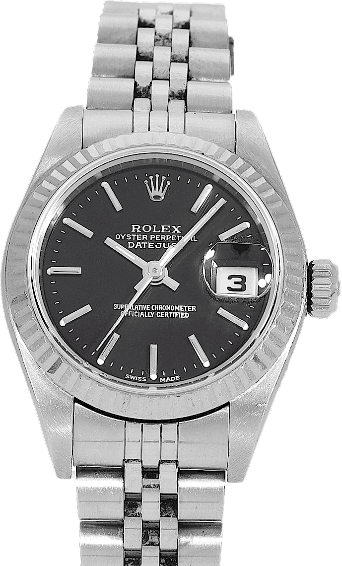 Rolex Lady-Datejust 28, Reference: 79174, Gender: Female, Size: 26mm, Dial color: Black, Strap material: Stainless Steel, Movement: Automatic, Year: 2007, Condition: Previously worn with some signs of usage. The movement is flawless and the case has been cleaned. watch tested to ensure full functionality. An inspection by our certified watchmakers guarantees its authenticity., Documents: Original papers, CHRONEXT Certificate