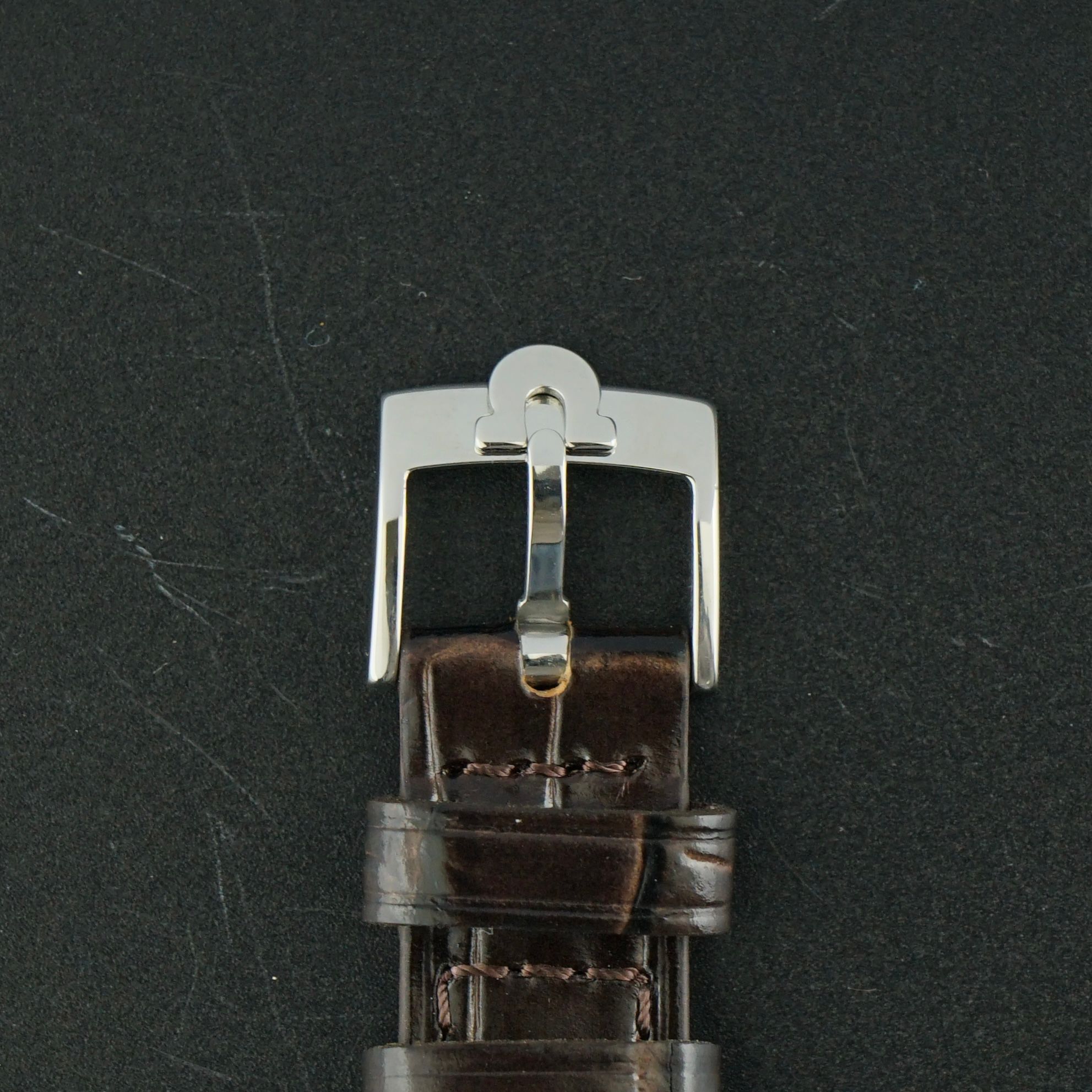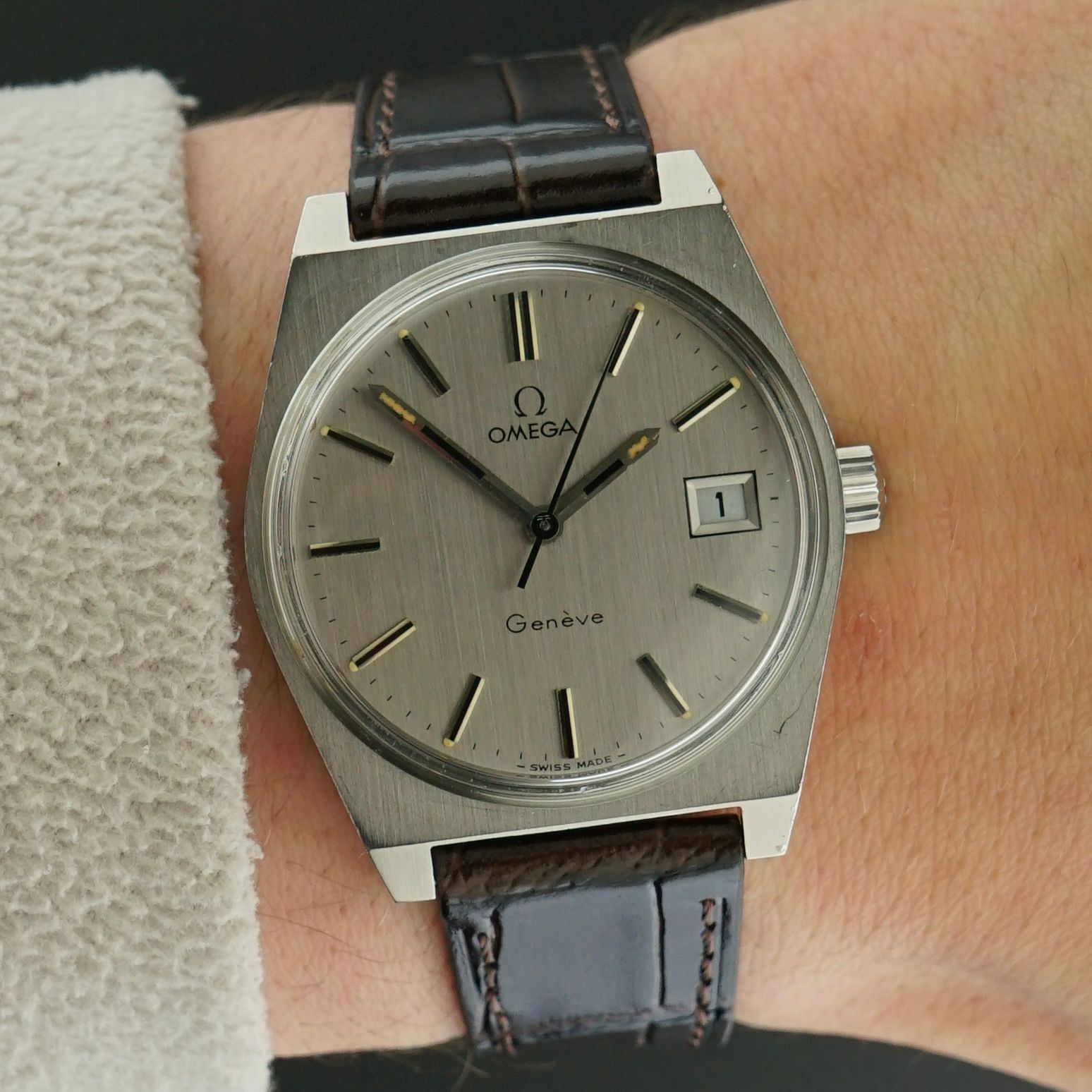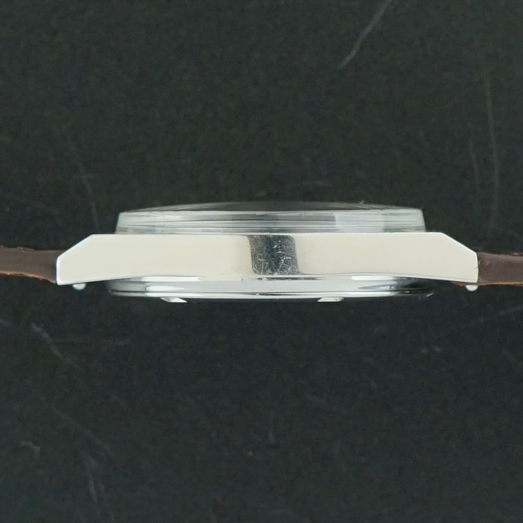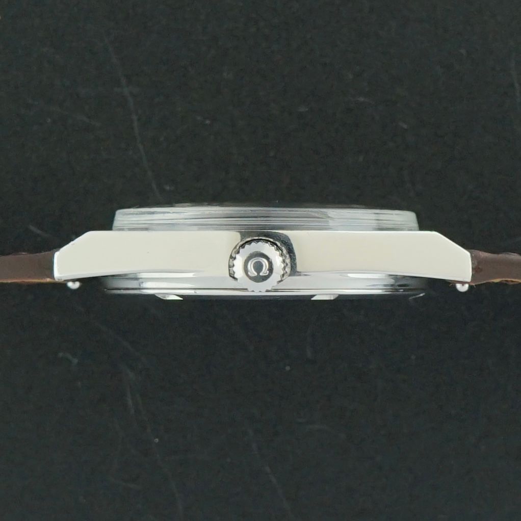A Vintage Omega Genève from 1970 featuring a beautifully vertically brushed silver dial in near perfect condition, with only a very small imperfection between the date window and the 4 o’clock marker, otherwise exceptionally clean. The steel case retains its original sharp finish with vertical brushing on the front and high polished sides. Powered by the manual wind caliber 613 movement, serviced in April 2026 and now running and functioning excellently. Paired with a top-grain handmade chocolate brown crocodile embossed leather strap that complements the watch perfectly. The watch remains fully original apart from the newly replaced strap, with the screw-down caseback engraved in Japanese indicating it was presented as a student graduation commemorative gift, adding a unique piece of history to this over 55 year old timepiece, a beautiful addition to any collection. Year of production: 1970 Serial number: 32.712.948 Model / Reference number: 136.0049 Case dimensions. - Width excluding crown: 35mm - Width including crown: 37,5mm - Lug to lug: 41,5mm - Thickness: 10mm Lugs width: 18mm Strap: A top grain, hand made, chocolate brown, crocodile embossed leather strap. (Fits a 15 to 21,5cm wrist) Total head-only weight: 36,8g Country of origin: Switzerland Movement: Cal. 613 Manual Wind Service information: Movement serviced in April 2026. Runs and functions excellently. (~+/-0s/d, ~297amp, ~0.0ms b/e) Internal code: BTW 1516