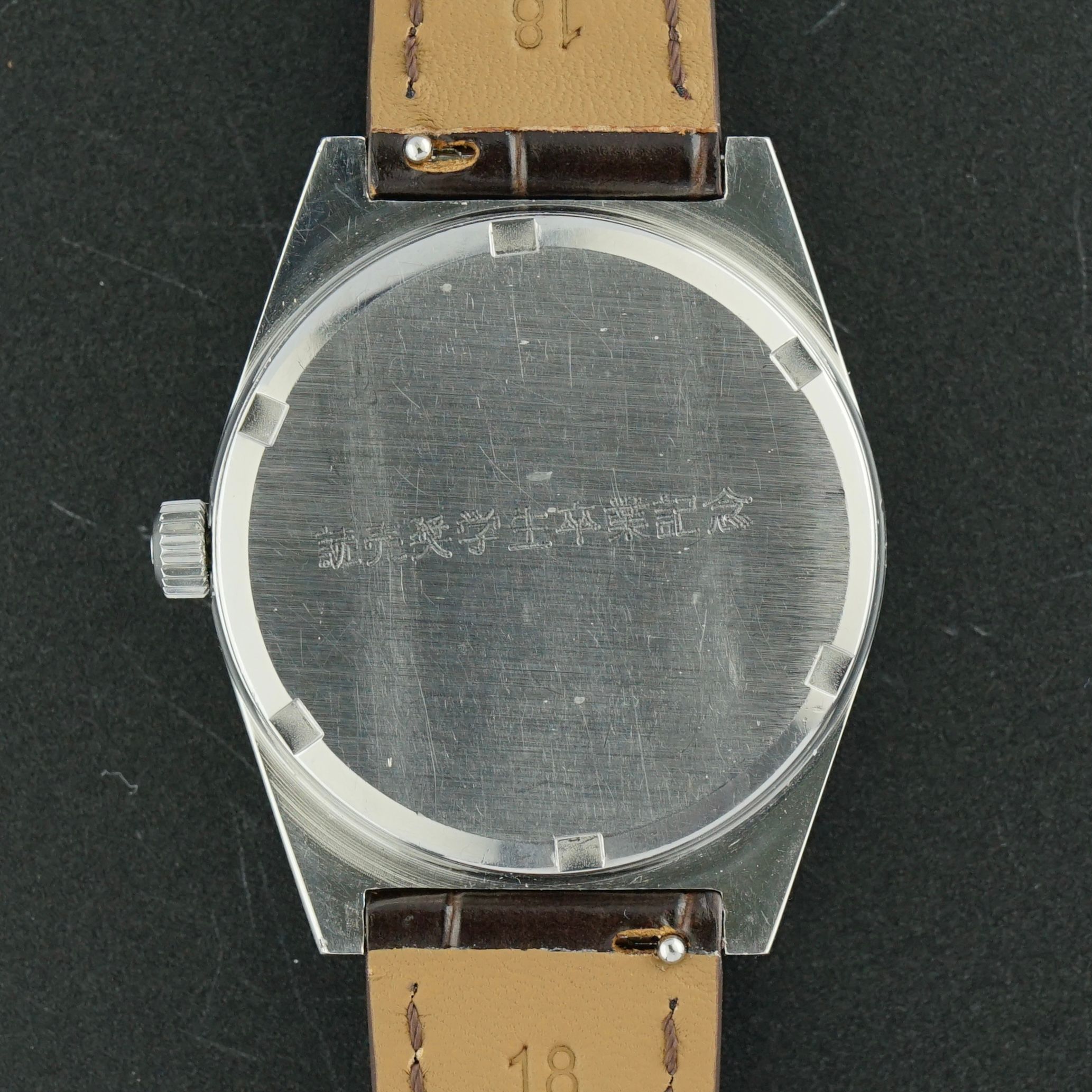 Une Omega Genève vintage de 1970 avec un cadran argenté brossé verticalement en presque parfait état, avec seulement une très petite imperfection entre la fenêtre de date et le marqueur de 4 heures, sinon exceptionnellement propre. Le boîtier en acier conserve sa finition originale nette avec un brossage vertical à l'avant et des côtés polis. Animé par le mouvement à remontage manuel calibre 613, révisé en avril 2026 et maintenant en excellent état de marche. Accompagné d'un bracelet en cuir embossé crocodile chocolat fait main de première qualité qui complète parfaitement la montre. La montre reste entièrement originale à part le bracelet récemment remplacé, avec le fond de boîte vissé gravé en japonais indiquant qu'il a été offert comme cadeau commémoratif de remise de diplôme, ajoutant une pièce d'histoire unique à cette montre de plus de 55 ans, un bel ajout à toute collection.