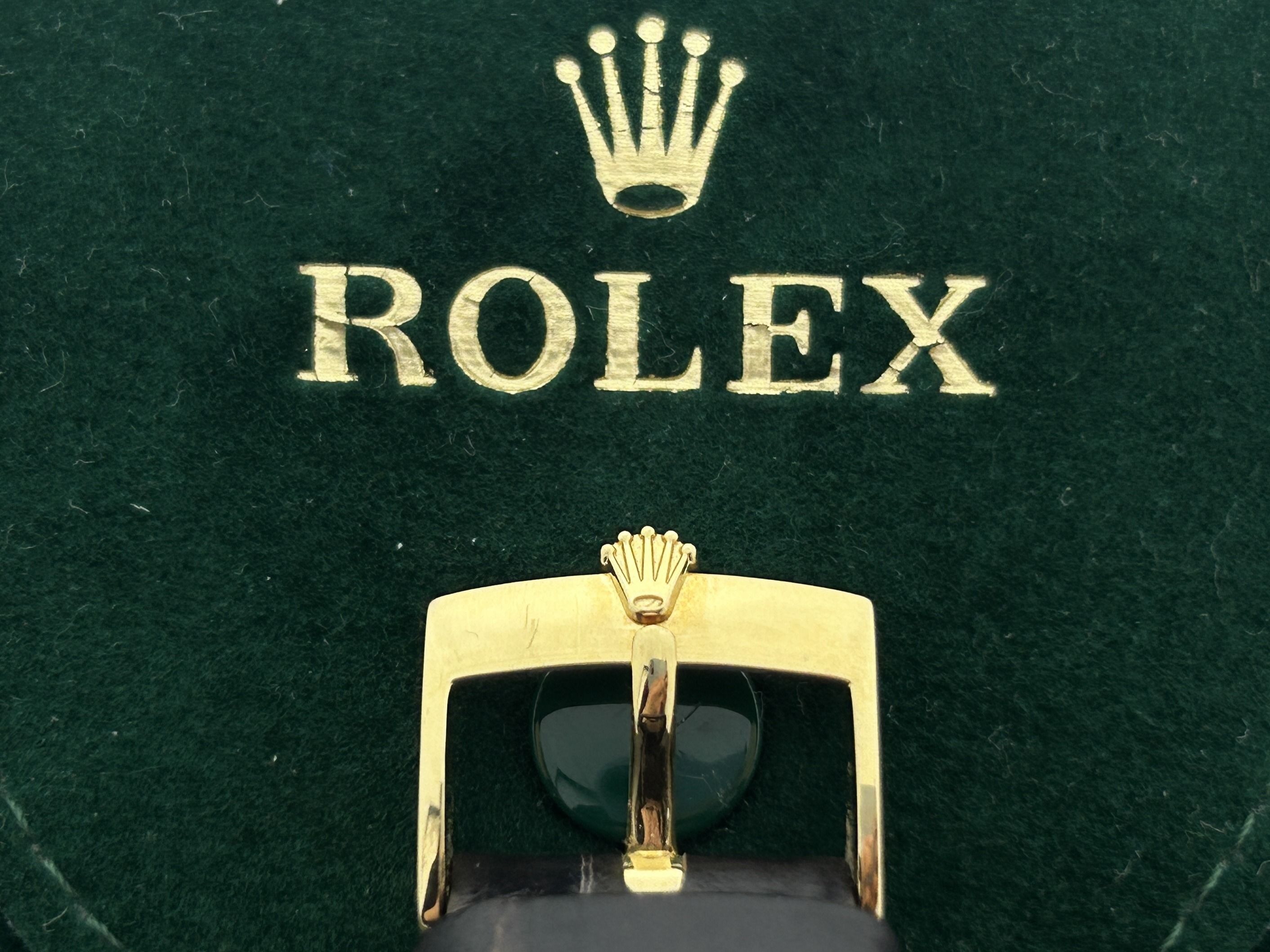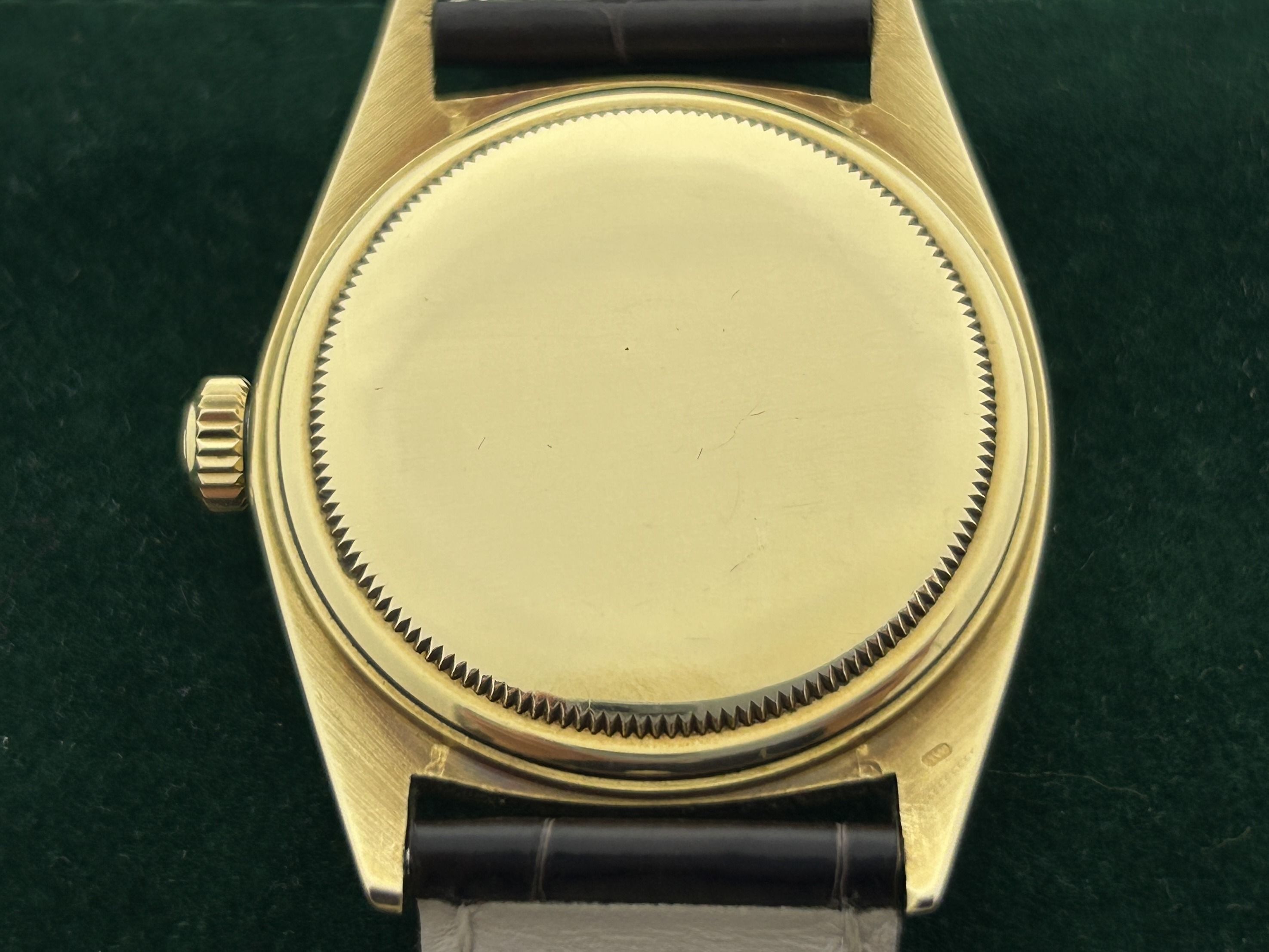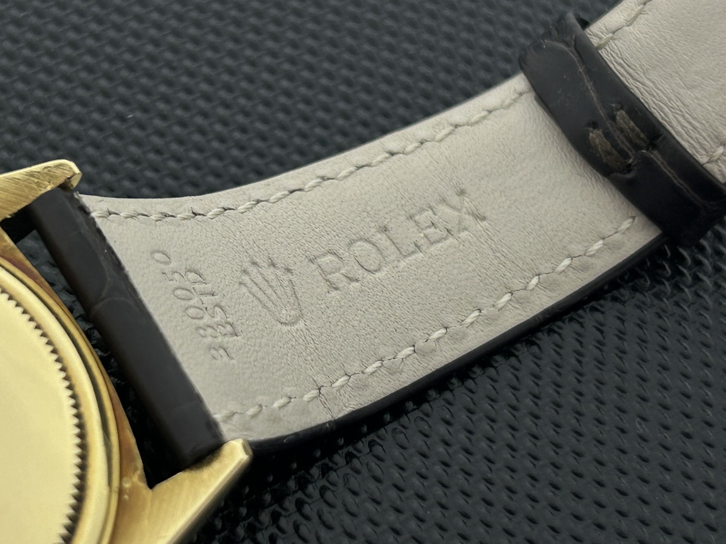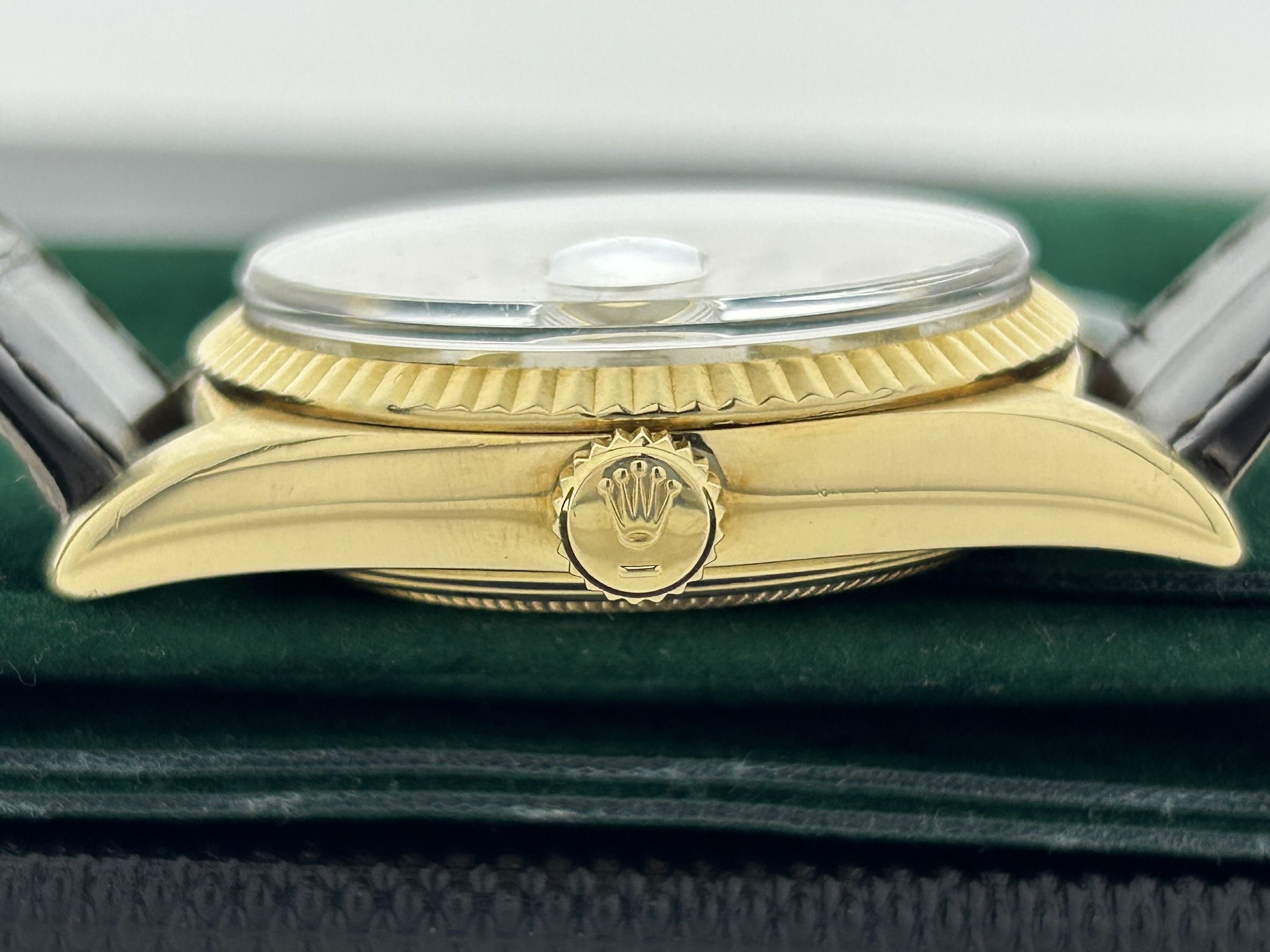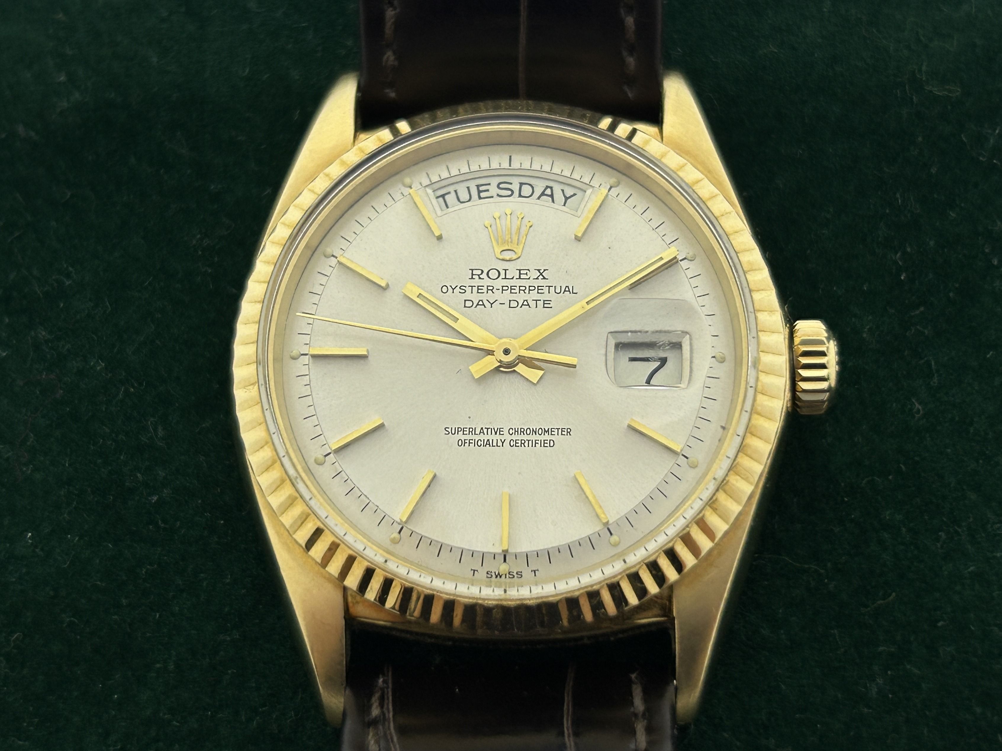 La Rolex est livrée avec une garantie de 24 mois. Une Rolex Day-Date 36 en or jaune, réf. 1803, de 1966. La Rolex a un boîtier en or jaune 18k de 36 mm, avec une lunette cannelée. La montre est équipée d'un bracelet en cuir alligator marron Rolex avec une boucle en or jaune 18k Rolex. La Day-Date possède un cadran de couleur argentée avec des index en forme d'heure, une fenêtre du jour à 12 heures et une fenêtre de date à 3 heures. La montre a un mouvement automatique et est en excellent état. Les photos ont été prises dans notre propre studio.