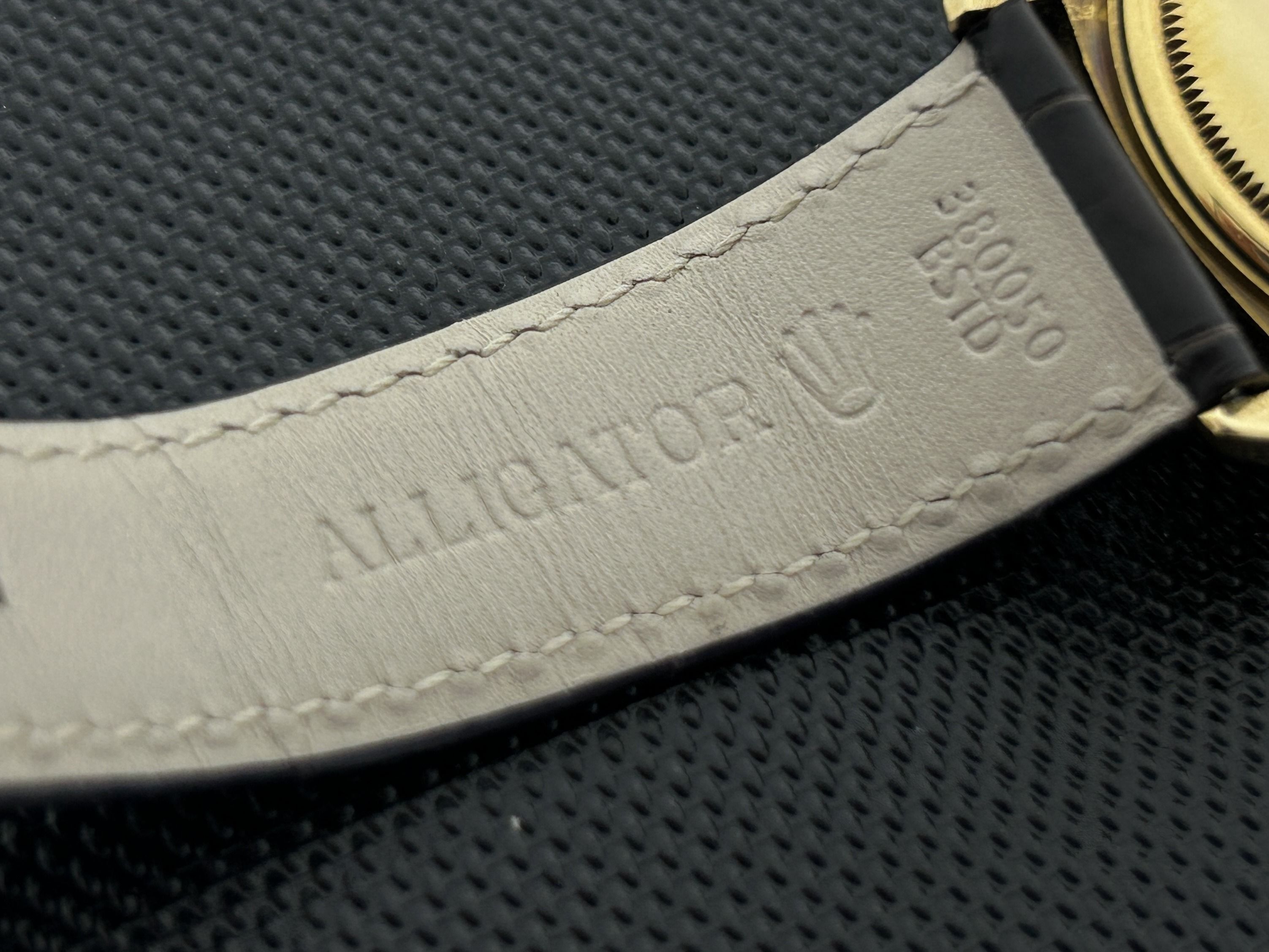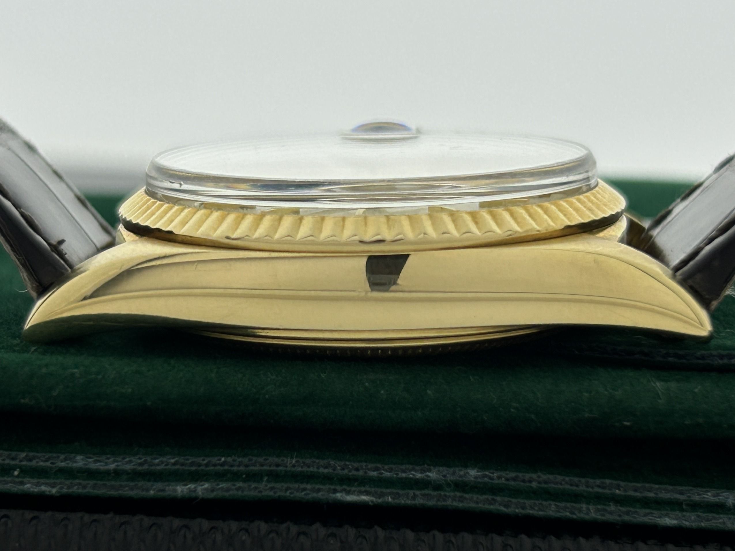 The Rolex comes with 24 months of warranty. A yellow gold Rolex Day-Date 36, ref. 1803, from 1966. The Rolex has an 18k yellow gold case of 36mm, with a fluted bezel. The watch has a brown Rolex alligator leather strap with an 18k yellow gold Rolex buckle. The Day-Date has a silver colored dial with index hour markers, a day-window at 12 o'clock and a date-window at 3 o'clock. The watch has an automatic movement and is in a great condition. The pictures were taken in our own studio.