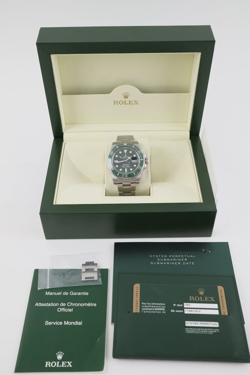 **Watch Description** Ready for your new dream watch? Perhaps this beautiful Rolex Submariner Date made of Steel will soon be on your wrist. Whether vintage or modern - with over 200 watches in stock, we always have your new luxury watch available for you immediately - whether you are a first-time buyer or your watch collection needs a new addition. **FACT CHECK - Everything you need to know:** - Movement checked for running behavior and no pending service. - If you like the watch in the pictures, you'll love it on your wrist. Our macro shots are unedited and show more than your eye can see. **SPECIFICATIONS AND SCOPE OF DELIVERY - This is how your new watch will arrive:** - Case diameter: 40mm - Wrist circumference: up to 20cm - Year of manufacture: 2013 - Case material: Steel - Strap material: Steel - Bracelet color: Steel - Dial color: Green - Reference number: 116610LV - Movement: Automatic - Original box included - Original papers - 12 months warranty - The complete scope of delivery can be seen in the pictures **QUALITY PROMISE** Every watch is checked for authenticity and function by our master watchmaker. So you get the all-round carefree package and an additional 12-month warranty! **INSPECTION AND SHIPPING** - Worldwide insured priority transport with tracking number. We deliver to watch lovers and collectors worldwide. Whether Asia, America, Australia or any other part of the world - the watch pictured can be on your wrist in just a few days. Within the EU even next-day. Alternatively, we would be happy to meet you at one of our 2 locations in southern Germany by prior arrangement: - Bavaria: THE BANK 94436 - Baden-Württemberg: THE LOFT 89073 - We also offer you a trade-in of your watch(es) to make the deal possible. - The purchase price is taxed according to §25 UStG. VAT is therefore not shown. - Prices include all taxes and fees for deliveries within the EU. There are no additional costs. **WatchId:** GID-8b6d-3898