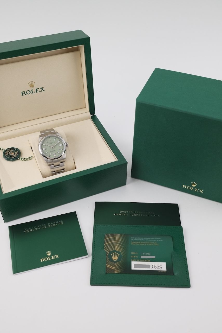 **Watch Description** Ready for your new dream watch? Perhaps this beautiful Rolex Oyster Perpetual 41 made of Steel will soon be on your wrist. Whether vintage or modern - with over 200 watches in stock, we always have your new luxury watch available for you immediately - whether you are a first-time buyer or your watch collection needs a new addition. **FACT CHECK - Everything you need to know:** - Movement checked for running behavior and no pending service. - If you like the watch in the pictures, you'll love it on your wrist. Our macro shots are unedited and show more than your eye can see. **SPECIFICATIONS AND SCOPE OF DELIVERY - This is how your new watch will arrive:** - Case diameter: 41mm - Wrist circumference: up to 20cm - Year of manufacture: 2025 - Case material: Steel - Strap material: Steel - Bracelet color: Steel - Dial color: Green - Reference number: 134300 - Movement: Automatic - Original box included - Original papers - 12 months warranty - The complete scope of delivery can be seen in the pictures **QUALITY PROMISE** Every watch is checked for authenticity and function by our master watchmaker. So you get the all-round carefree package and an additional 12-month warranty! **INSPECTION AND SHIPPING** - Worldwide insured priority transport with tracking number. We deliver to watch lovers and collectors worldwide. Whether Asia, America, Australia or any other part of the world - the watch pictured can be on your wrist in just a few days. Within the EU even next-day. Alternatively, we would be happy to meet you at one of our 2 locations in southern Germany by prior arrangement: - Bavaria: THE BANK 94436 - Baden-Württemberg: THE LOFT 89073 - We also offer you a trade-in of your watch(es) to make the deal possible. - The purchase price is taxed according to §25 UStG. VAT is therefore not shown. - Prices include all taxes and fees for deliveries within the EU. There are no additional costs. **WatchId:** GID-d06e-f4a5