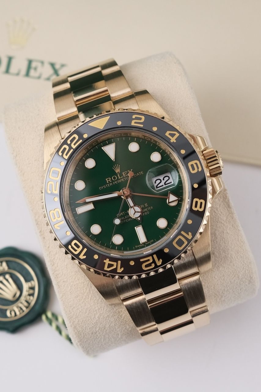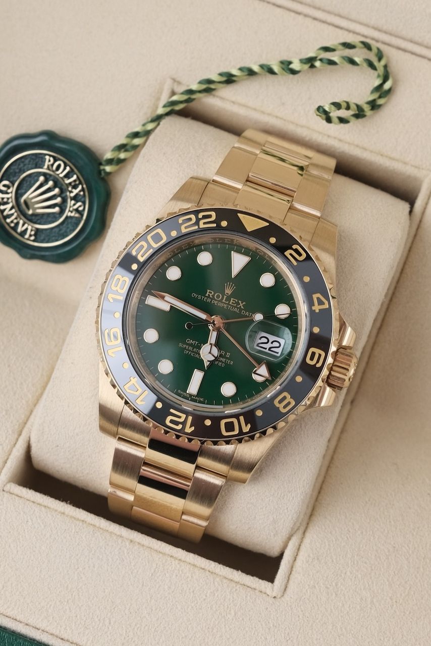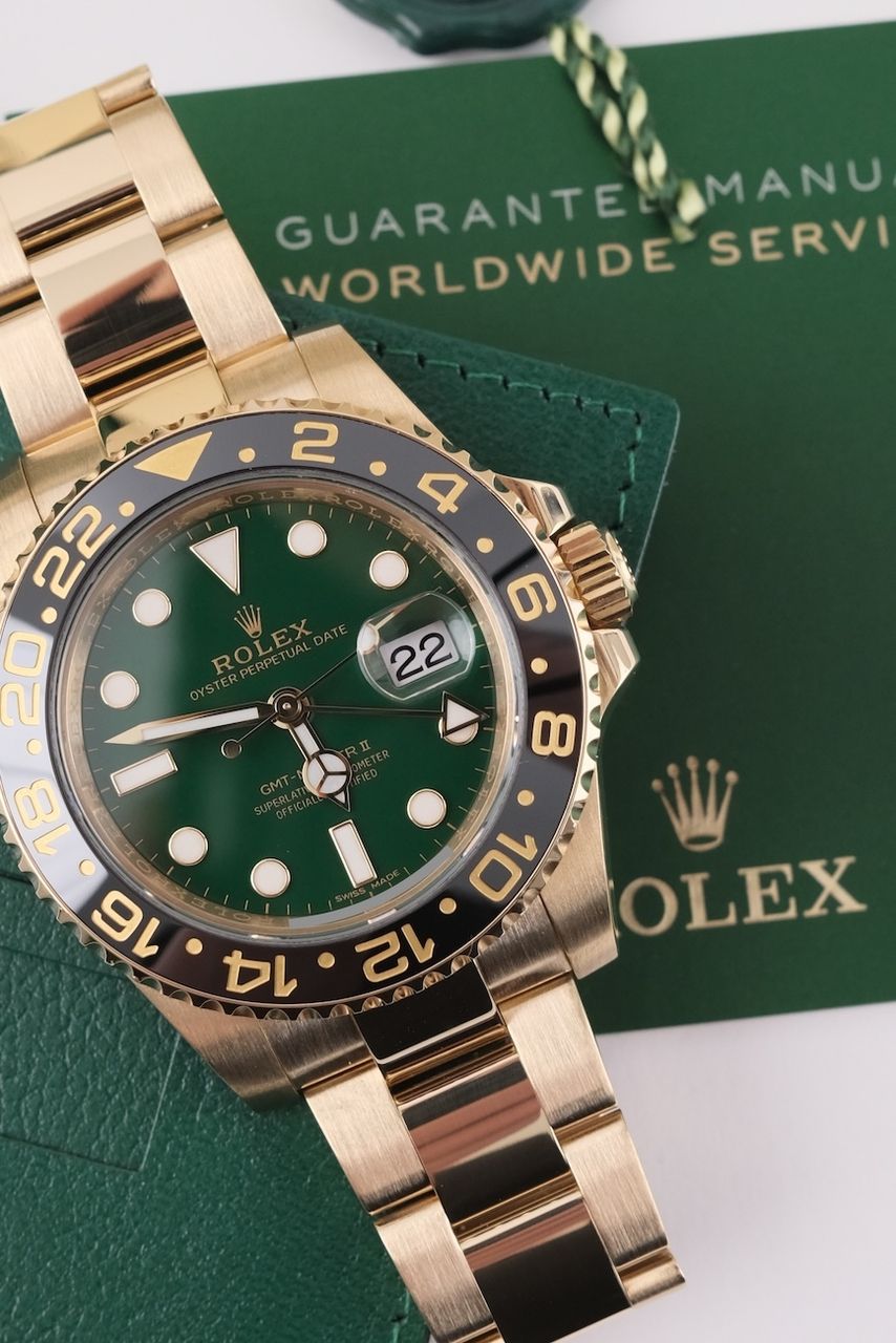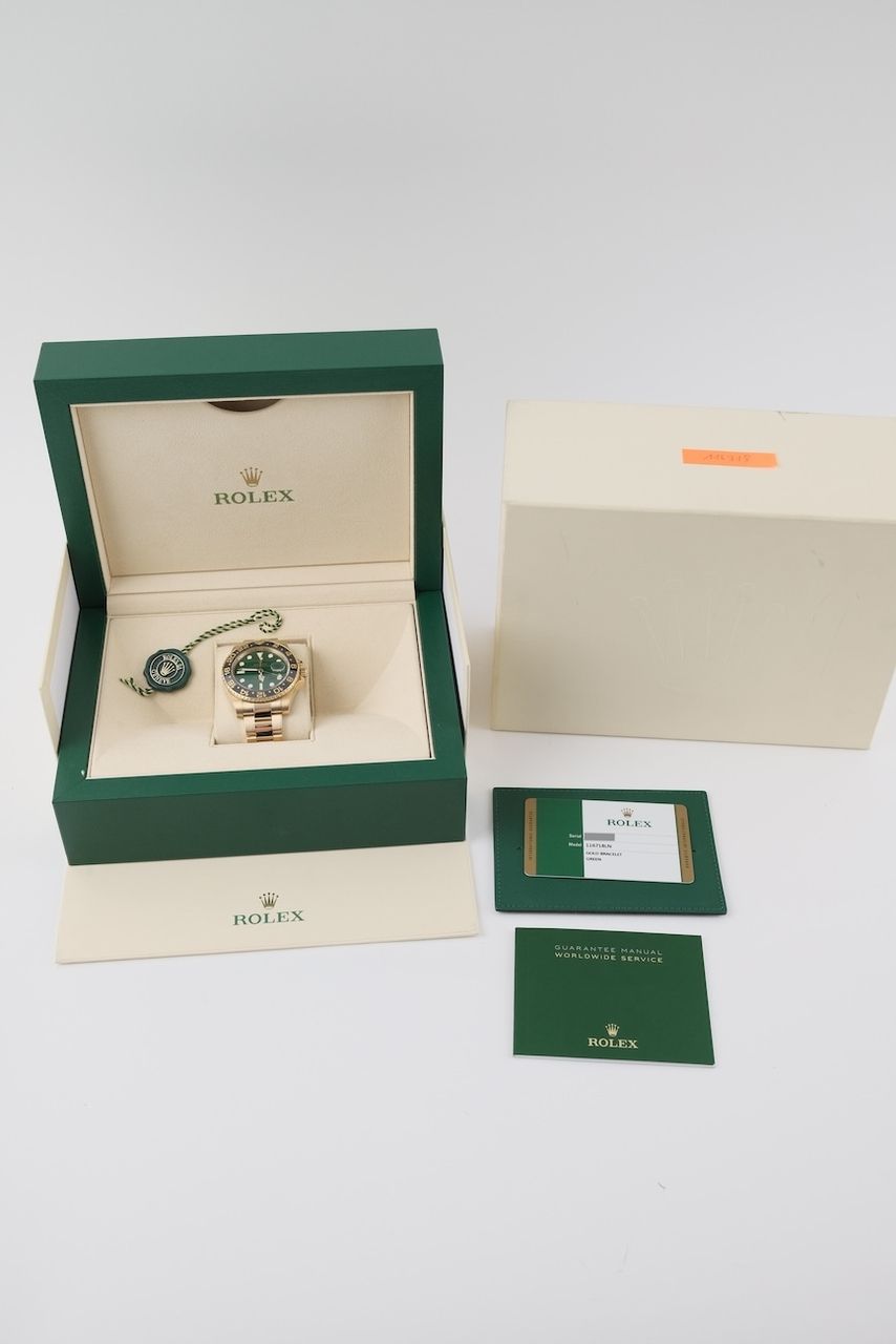 **Watch Description** Ready for your new dream watch? Perhaps this beautiful Rolex GMT-Master II made of Yellow gold will soon be on your wrist. Whether vintage or modern - with over 200 watches in stock, we always have your new luxury watch available for you immediately - whether you are a first-time buyer or your watch collection needs a new addition. **FACT CHECK - Everything you need to know:** - Movement checked for running behavior and no pending service. - If you like the watch in the pictures, you'll love it on your wrist. Our macro shots are unedited and show more than your eye can see. **SPECIFICATIONS AND SCOPE OF DELIVERY - This is how your new watch will arrive:** - Case diameter: 40mm - Wrist circumference: up to 19.5cm - Year of manufacture: 2016 - Case material: Yellow gold - Strap material: Yellow Gold - Bracelet color: Gold - Dial color: Green - Reference number: 116718LN - Movement: Automatic - Original box included - Original papers - 12 months warranty - The complete scope of delivery can be seen in the pictures **QUALITY PROMISE** Every watch is checked for authenticity and function by our master watchmaker. So you get the all-round carefree package and an additional 12-month warranty! **INSPECTION AND SHIPPING** - Worldwide insured priority transport with tracking number. We deliver to watch lovers and collectors worldwide. Whether Asia, America, Australia or any other part of the world - the watch pictured can be on your wrist in just a few days. Within the EU even next-day. Alternatively, we would be happy to meet you at one of our 2 locations in southern Germany by prior arrangement: - Bavaria: THE BANK 94436 - Baden-Württemberg: THE LOFT 89073 - We also offer you a trade-in of your watch(es) to make the deal possible. - The purchase price is taxed according to §25 UStG. VAT is therefore not shown. - Prices include all taxes and fees for deliveries within the EU. There are no additional costs. **WatchId:** GID-f4fb-3b5d