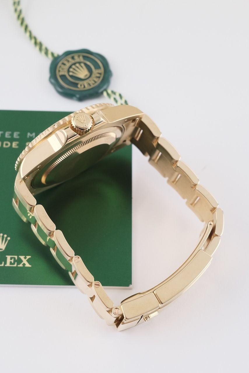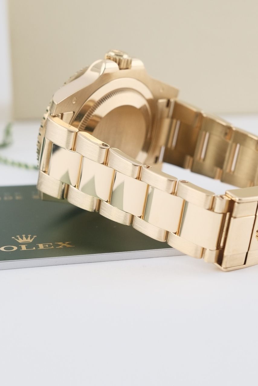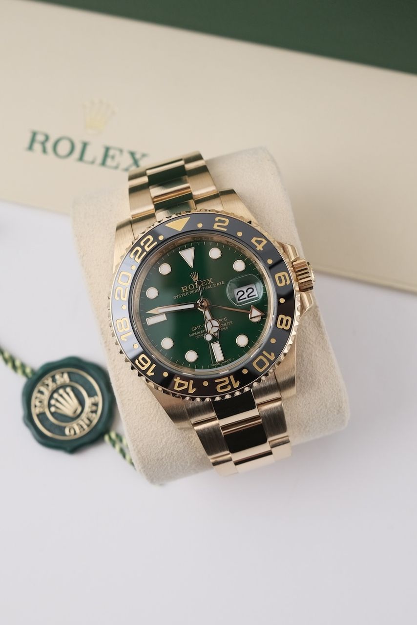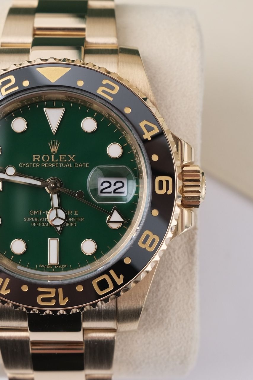 **Watch Description** Ready for your new dream watch? Perhaps this beautiful Rolex GMT-Master II made of Yellow gold will soon be on your wrist. Whether vintage or modern - with over 200 watches in stock, we always have your new luxury watch available for you immediately - whether you are a first-time buyer or your watch collection needs a new addition. **FACT CHECK - Everything you need to know:** - Movement checked for running behavior and no pending service. - If you like the watch in the pictures, you'll love it on your wrist. Our macro shots are unedited and show more than your eye can see. **SPECIFICATIONS AND SCOPE OF DELIVERY - This is how your new watch will arrive:** - Case diameter: 40mm - Wrist circumference: up to 19.5cm - Year of manufacture: 2016 - Case material: Yellow gold - Strap material: Yellow Gold - Bracelet color: Gold - Dial color: Green - Reference number: 116718LN - Movement: Automatic - Original box included - Original papers - 12 months warranty - The complete scope of delivery can be seen in the pictures **QUALITY PROMISE** Every watch is checked for authenticity and function by our master watchmaker. So you get the all-round carefree package and an additional 12-month warranty! **INSPECTION AND SHIPPING** - Worldwide insured priority transport with tracking number. We deliver to watch lovers and collectors worldwide. Whether Asia, America, Australia or any other part of the world - the watch pictured can be on your wrist in just a few days. Within the EU even next-day. Alternatively, we would be happy to meet you at one of our 2 locations in southern Germany by prior arrangement: - Bavaria: THE BANK 94436 - Baden-Württemberg: THE LOFT 89073 - We also offer you a trade-in of your watch(es) to make the deal possible. - The purchase price is taxed according to §25 UStG. VAT is therefore not shown. - Prices include all taxes and fees for deliveries within the EU. There are no additional costs. **WatchId:** GID-f4fb-3b5d