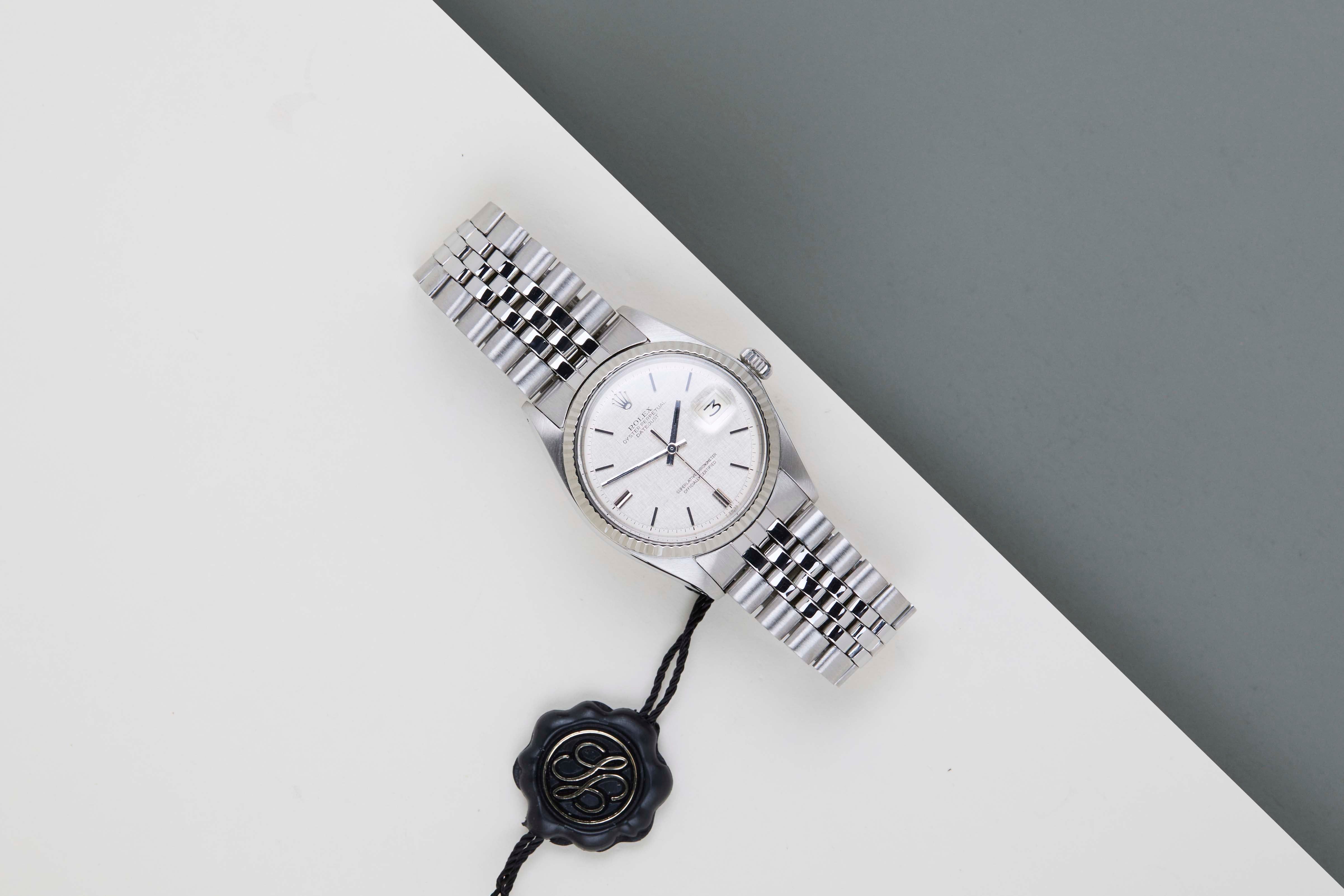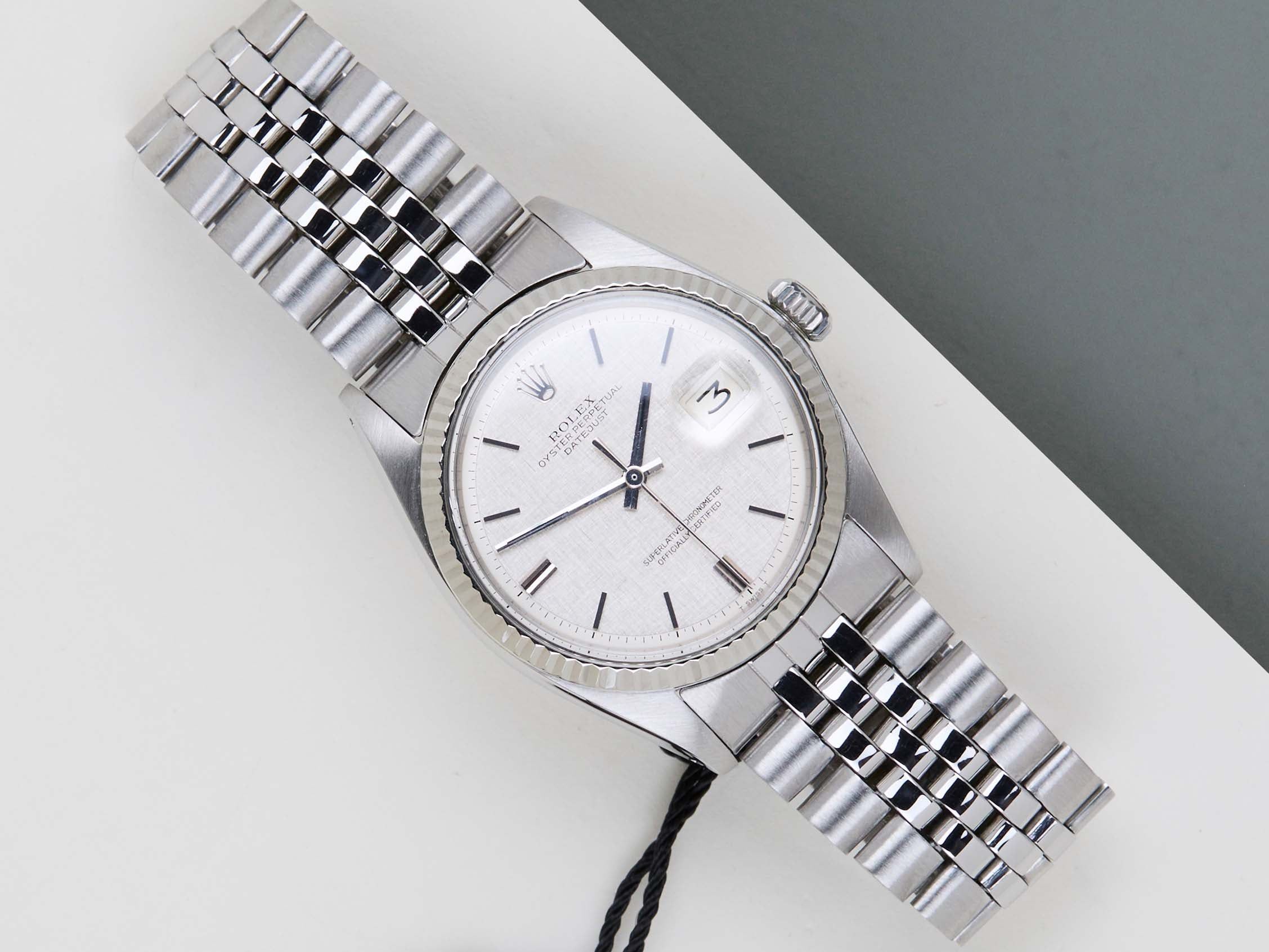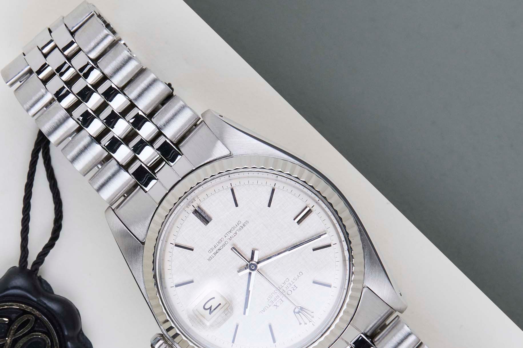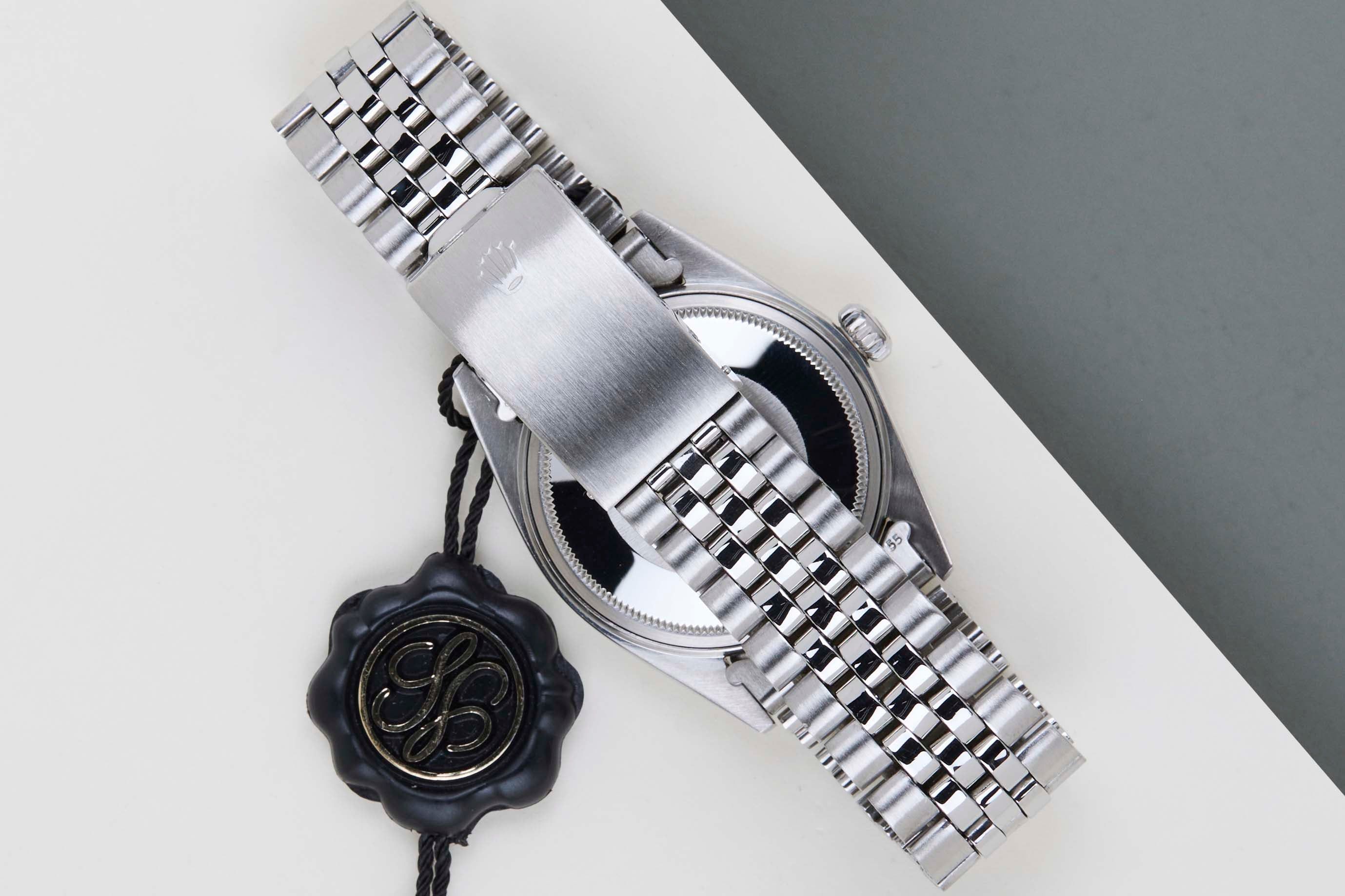Original Rolex 'No Lume' Dial | 3.22X.XXX Serial | Original Folded Bracelet | Bracelet Code 6251H | End Links 55 | Open 6 & 9 Date Wheel Rolex introduced the original Datejust in 1945 to celebrate the company's 40th anniversary. Due to the various case sizes and materials, the Datejust has been ingrained in Rolex's history and remains incredibly popular for 75 years. This Datejust is made of a combination of 18k White Gold and stainless steel and is fitted with a Jubilee bracelet.This pristine 1601 is equipped with an original 'No Lume Linen' Pie-Pan Dial. In addition, the Datejust is equipped with an Open 6 & 9 Date Wheel.This 1601 reference features a Silver dial with a slight sunburst effect and unusual 'No Lume' Dial. These 'No Lume' dials were specifically produced for the Japanese Market, since Japan didn't allow the use of Tritium. The indexes and hands are made of the White Gold without the use of Tritium, given it a more clean look. Consequently, a 'No Lume' dial is extremely desirable for watch collectors.The production year of this Datejust is 1973. Furthermore, the watch has been serviced by our watchmaker, and therefore it comes with One Year of Steiner Warranty.