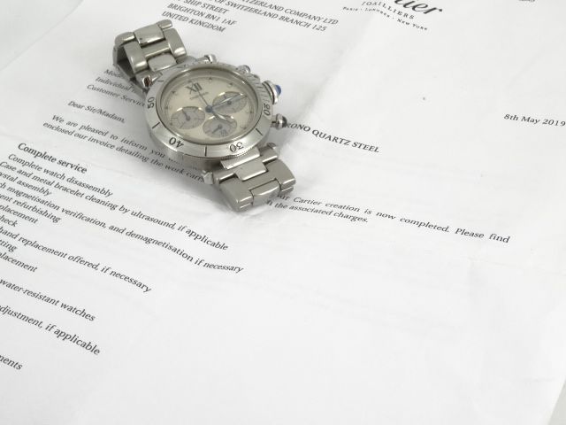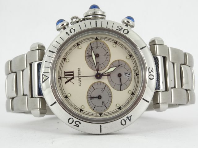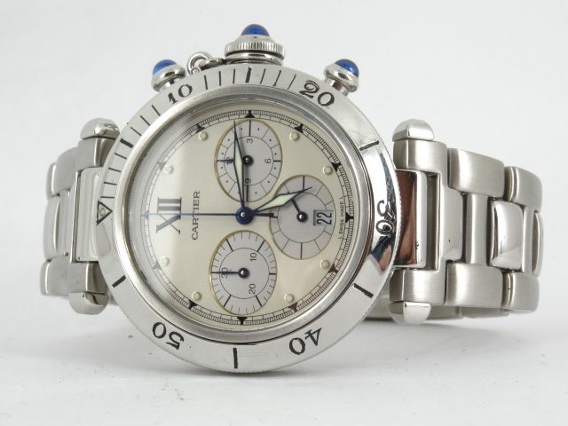 Cartier Pasha chronograph 38. All watches are carefully checked. This way you are always assured of a good purchase and do we offer atleast 6 months warranty on every watch. Our repairs are carried out by our own certified watchmaker who specializes in the maintenance of Breitling watches.