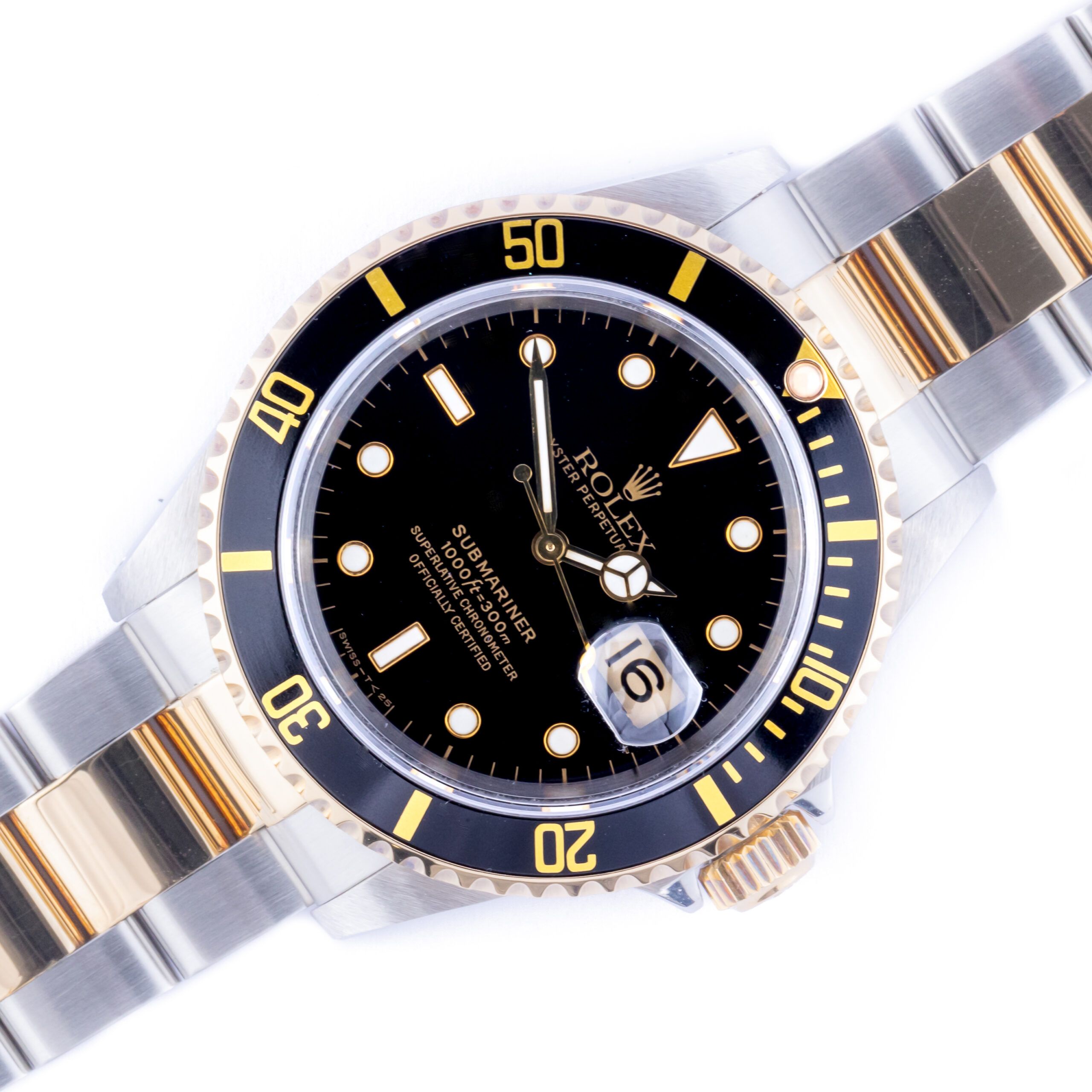 Rolex Oyster Perpetual Submariner Date référence 16613 de 1993. La Submariner 16613 mesure un boîtier de 40 mm en acier inoxydable/or, un bracelet Oyster en acier inoxydable/or avec fermoir Fliplock et une lunette tournante noire. La Submariner 16613 est équipée d'un calibre automatique 3135 avec fonction quickset date, d'un verre saphir inrayable et d'un cadran Serti noir avec aiguilles tritium et index diamant/saphir. Chaque montre vendue par Langedyk Vintage Watches est incluse dans une boîte à montres LVW, un rapport d'authenticité et un envoi gratuit dans le monde entier (assuré). De plus, chaque montre d'occasion est offerte avec notre garantie de 12 mois à compter de la date d'achat. Si tu as des questions ou si tu souhaites recevoir des informations supplémentaires sur cette montre, n'hésite pas à nous contacter par téléphone ou par e-mail. Nous répondrons à ta demande dans les plus brefs délais. Jette également un coup d'œil à notre collection complète de montres Rolex Submariner.