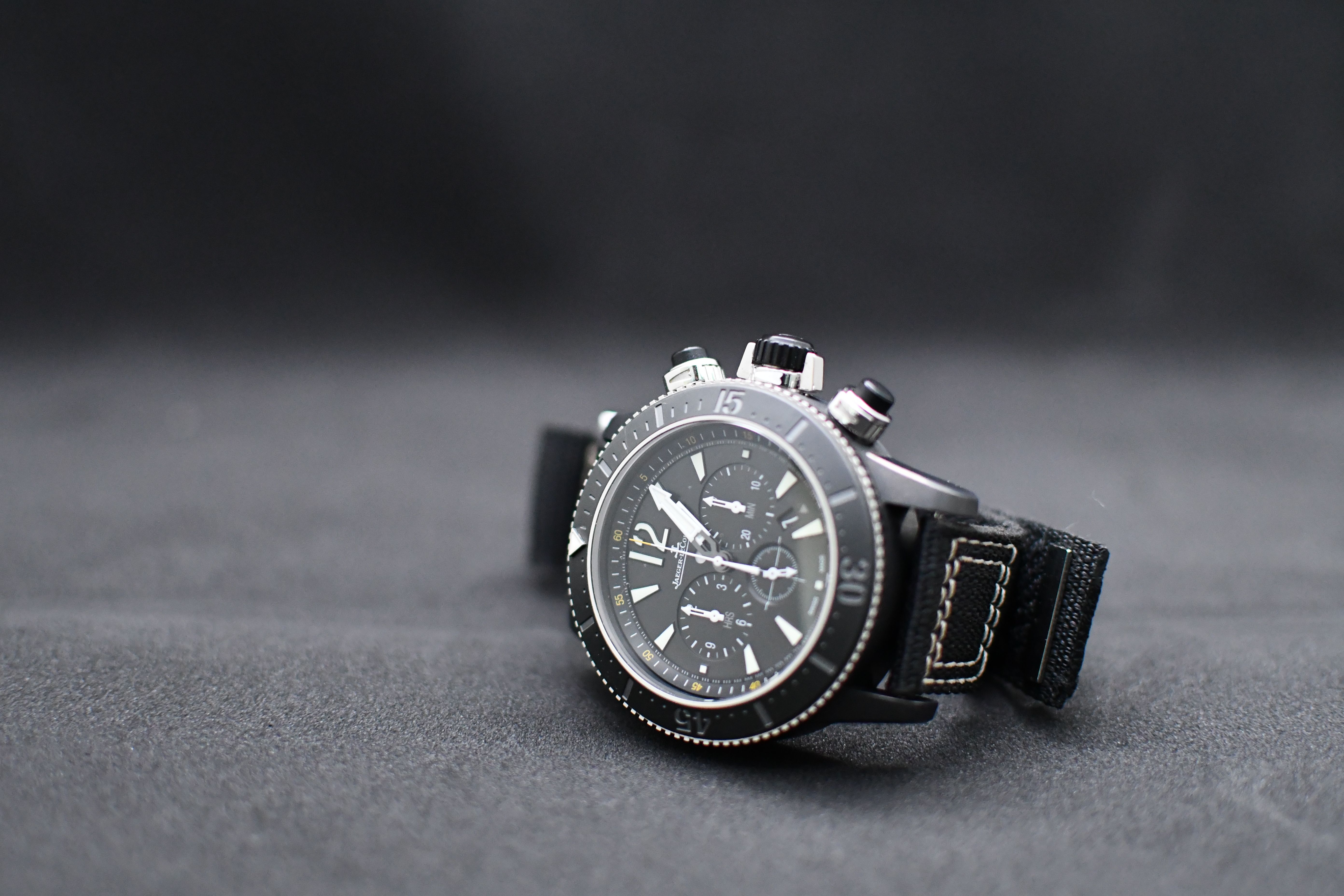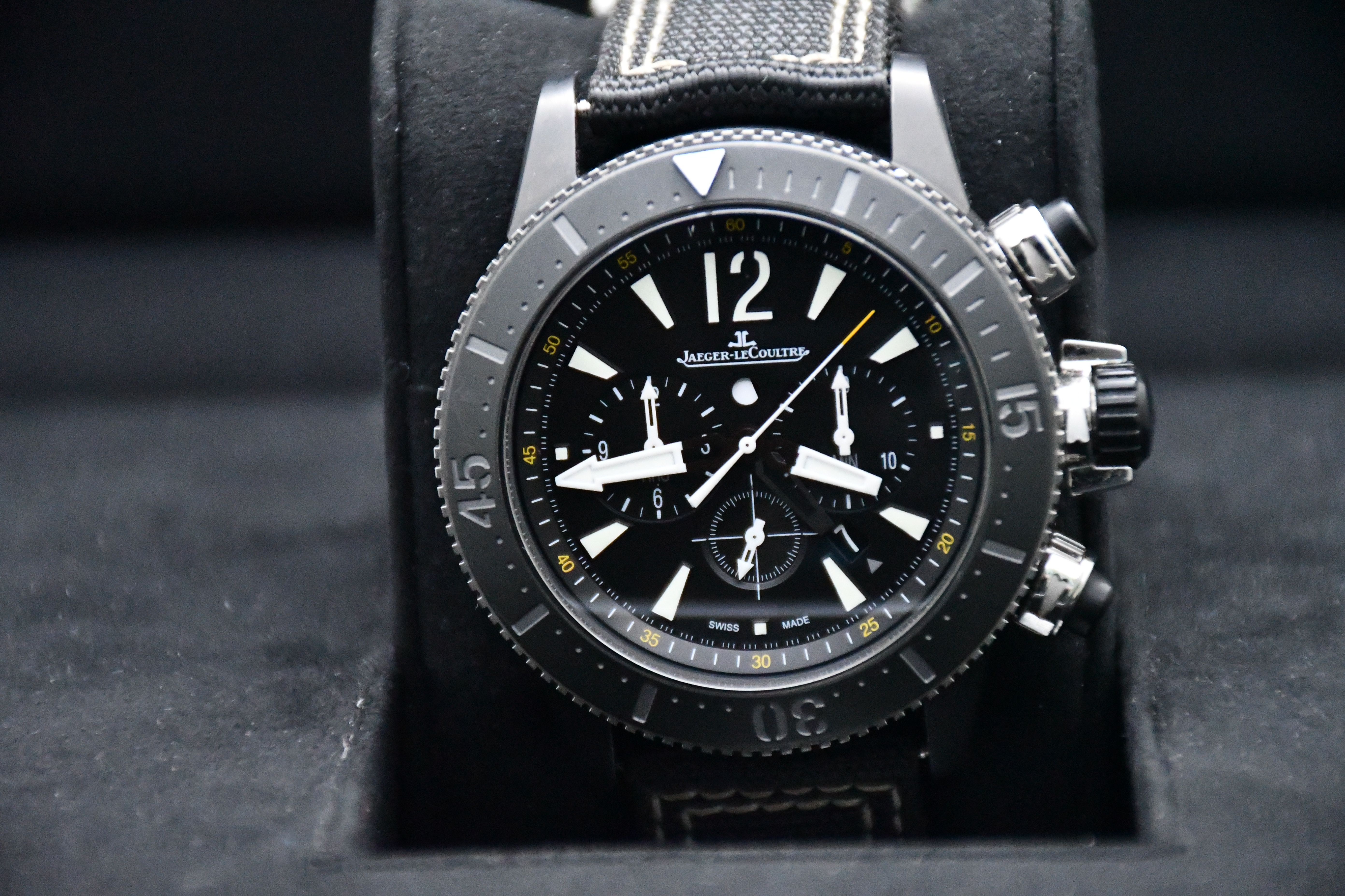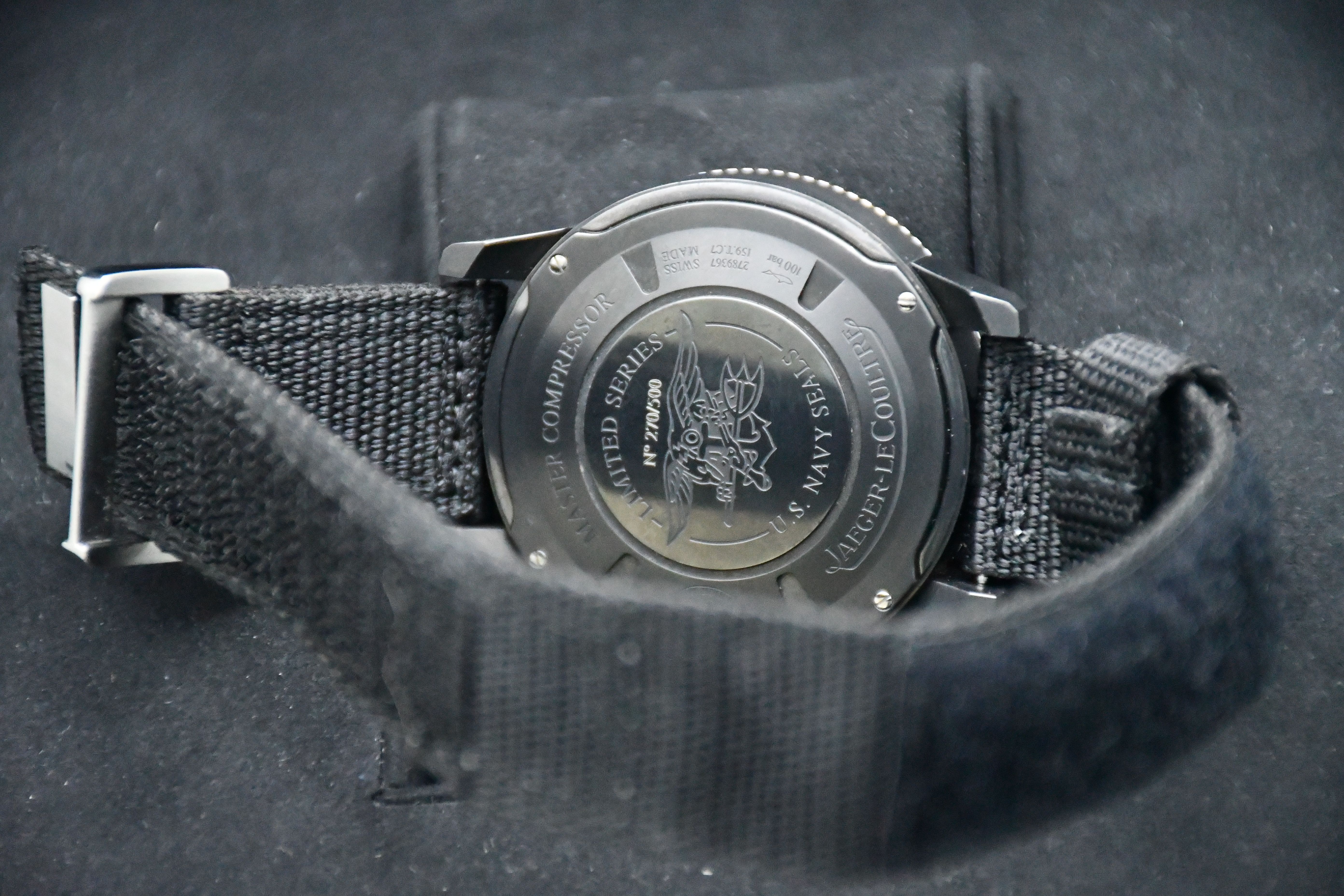 Un modèle très difficile à trouver de Jaeger-LeCoultre ; l'édition Master Compressor Navy Seals. Elle est dotée d'un boîtier en titane noir, d'un cadran et d'une lunette noirs, et d'un bracelet spécial JLC en velcro/NATO.