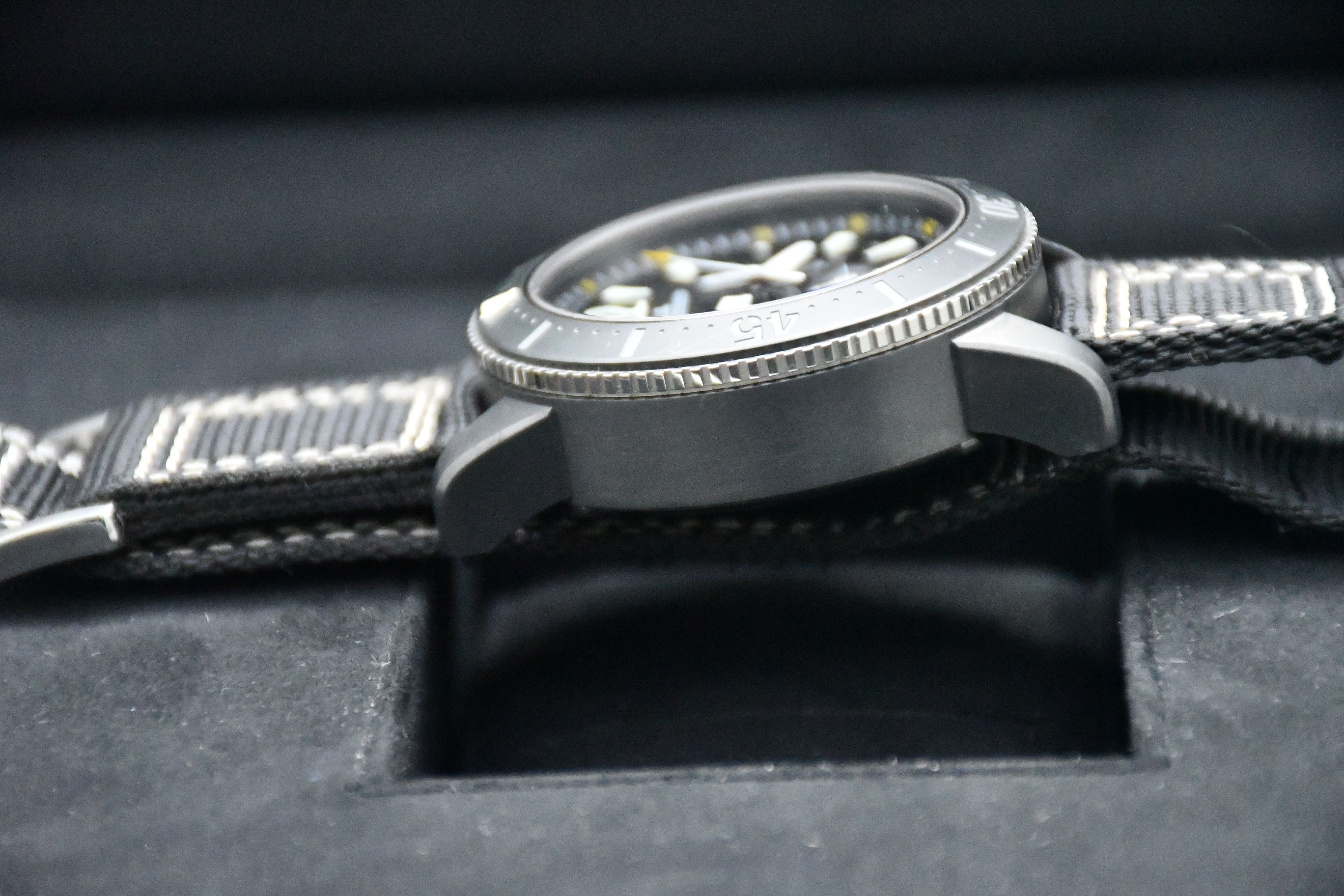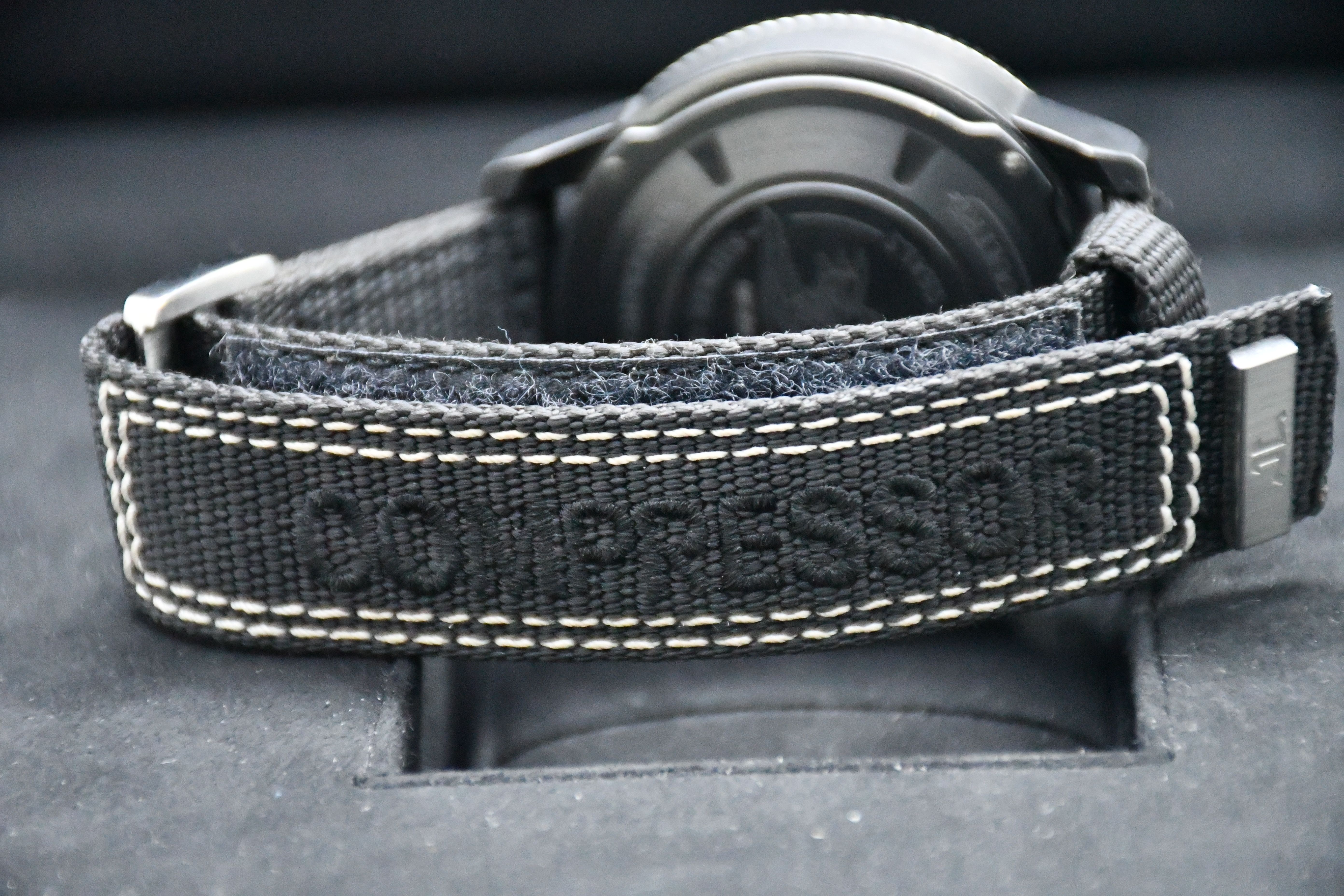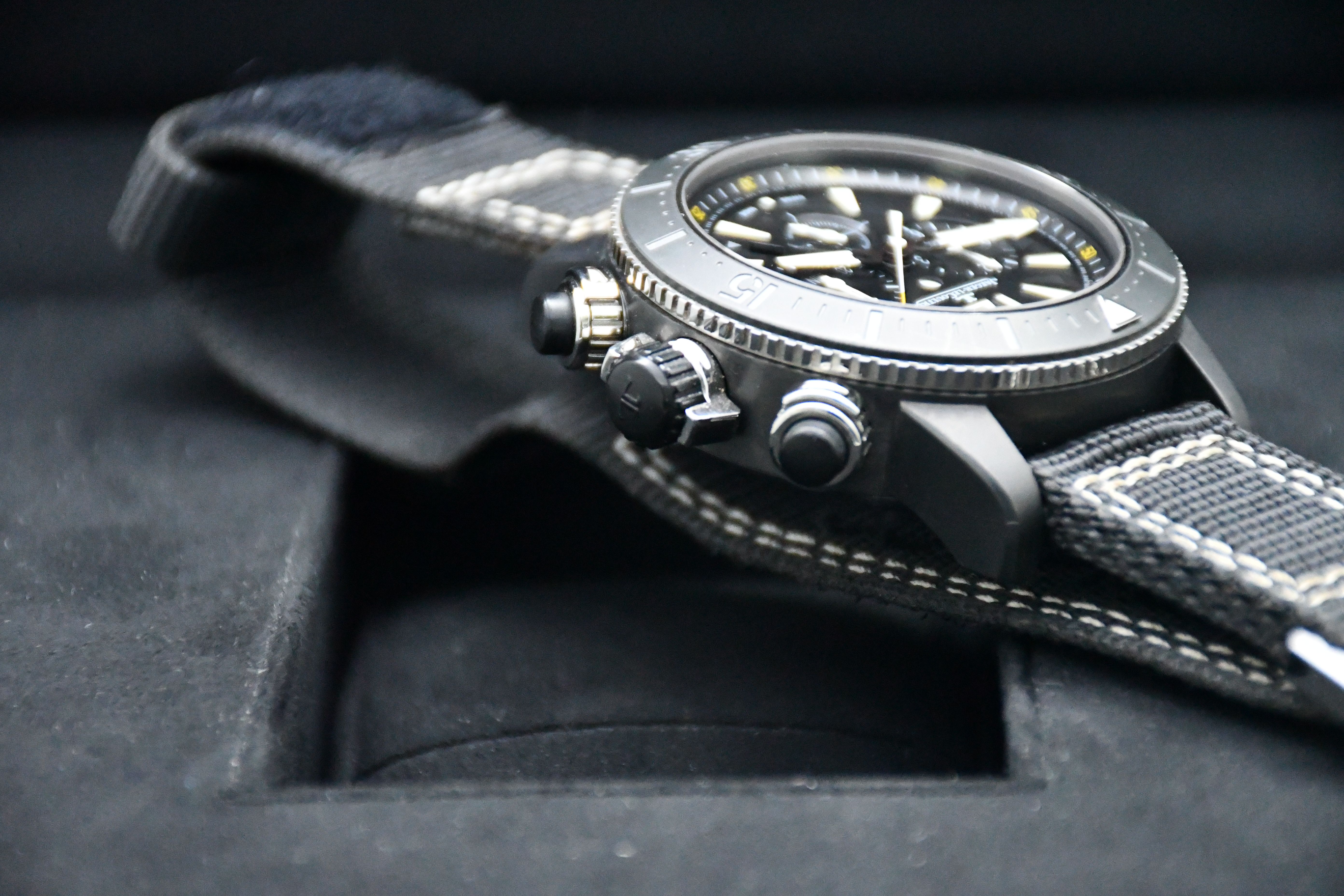 Un modèle très difficile à trouver de Jaeger-LeCoultre ; l'édition Master Compressor Navy Seals. Elle est dotée d'un boîtier en titane noir, d'un cadran et d'une lunette noirs, et d'un bracelet spécial JLC en velcro/NATO.