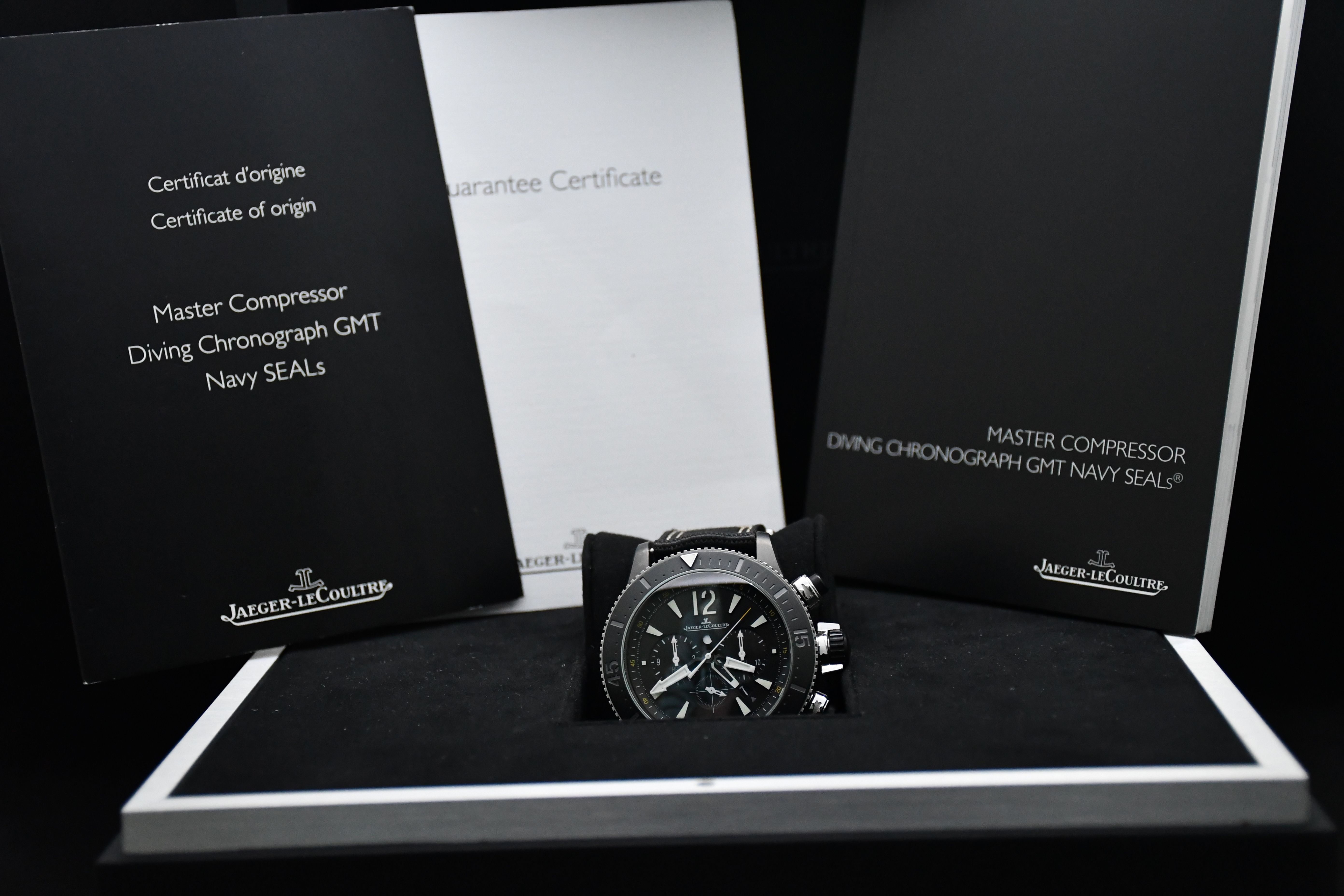 A very hard to find model from Jaeger-LeCoultre; the Master Compressor Navy Seals edition. Featuring a black titanium case with black dial and bezel, and special JLC velcro/NATO strap.One of only 500 units made, This comes as a full set with all boxes/books and papers included, and is in absolutely fantastic condition!