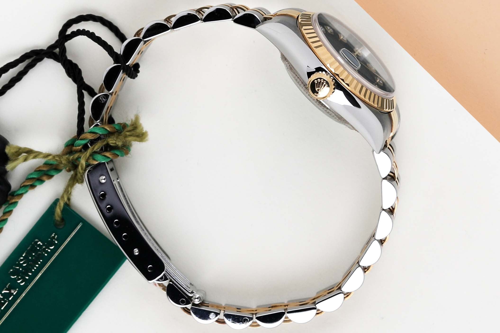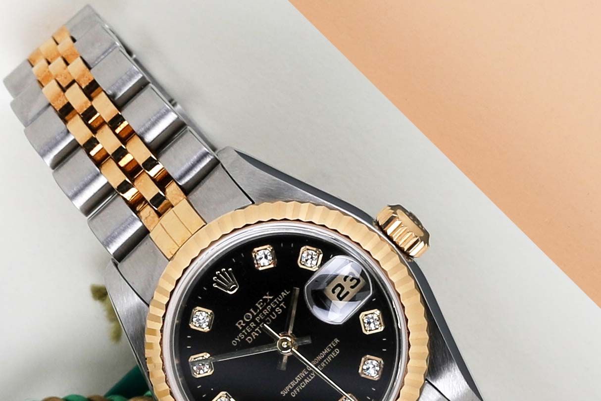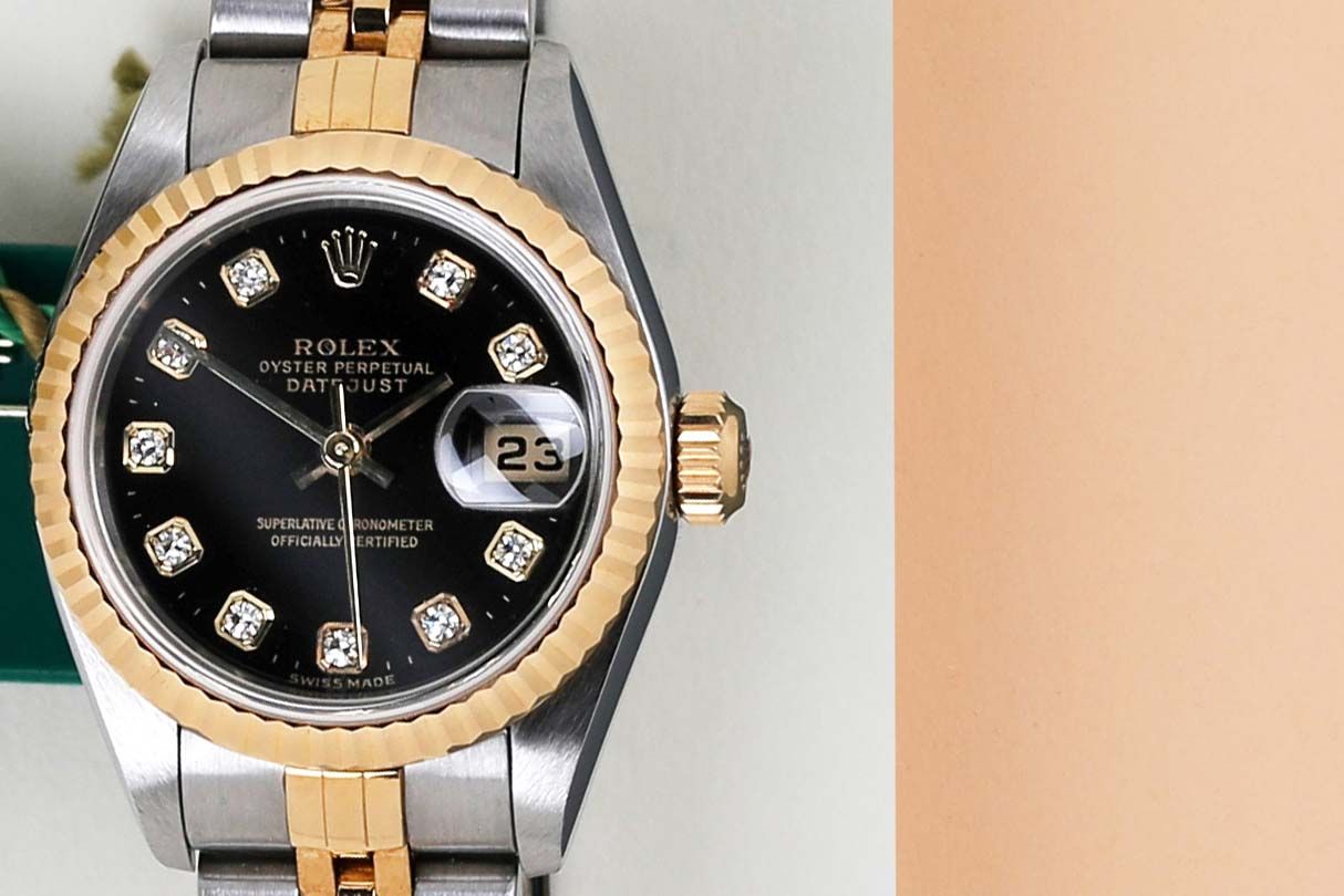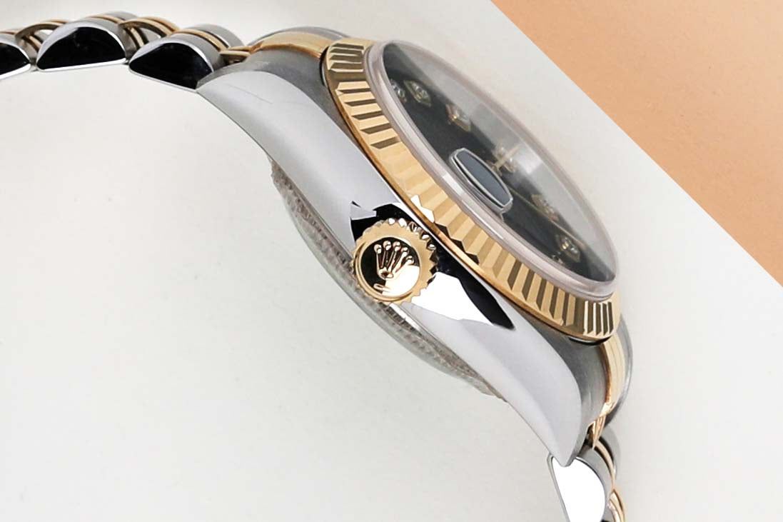 Full Set | Original Rolex Black Diamond Dial Rolex introduced the original Datejust in 1945 to celebrate the company's 40th anniversary. Due to the enormous success, Rolex released the first Lady-Datejust in 1957. This Rolex Datejust 'Black Diamond Dial' was sold for the first time in August 2001. This Datejust is made out of a combination of 18k Yellow Gold and stainless steel which is fitted with a Jubilee bracelet. In addition, it comes with a Black Diamond Dial. This Rolex Datejust 26 is in pristine condition and comes with the original Rolex Warranty Papers and box. Furthermore, the watch has been serviced by our watchmaker, therefore it comes with one year of warranty.