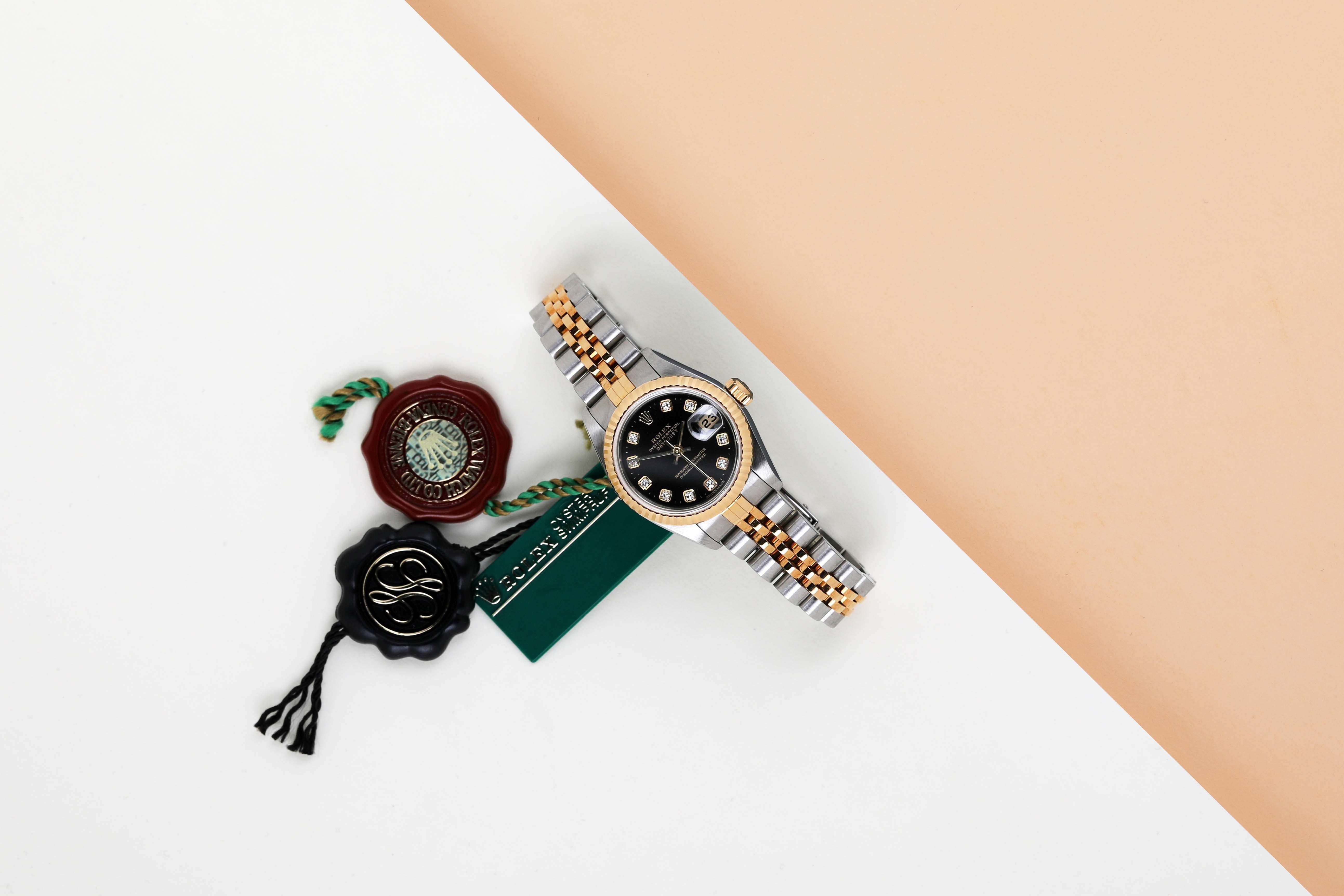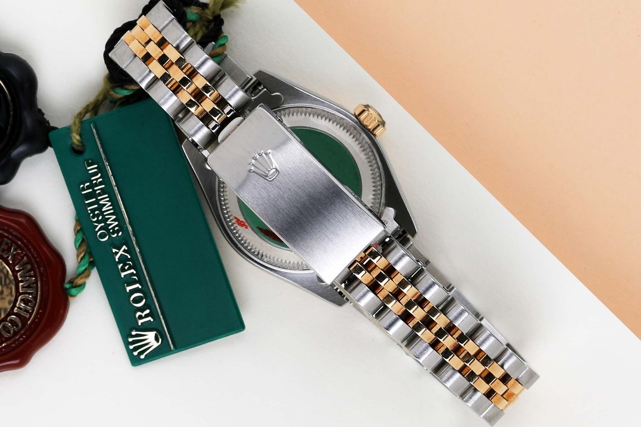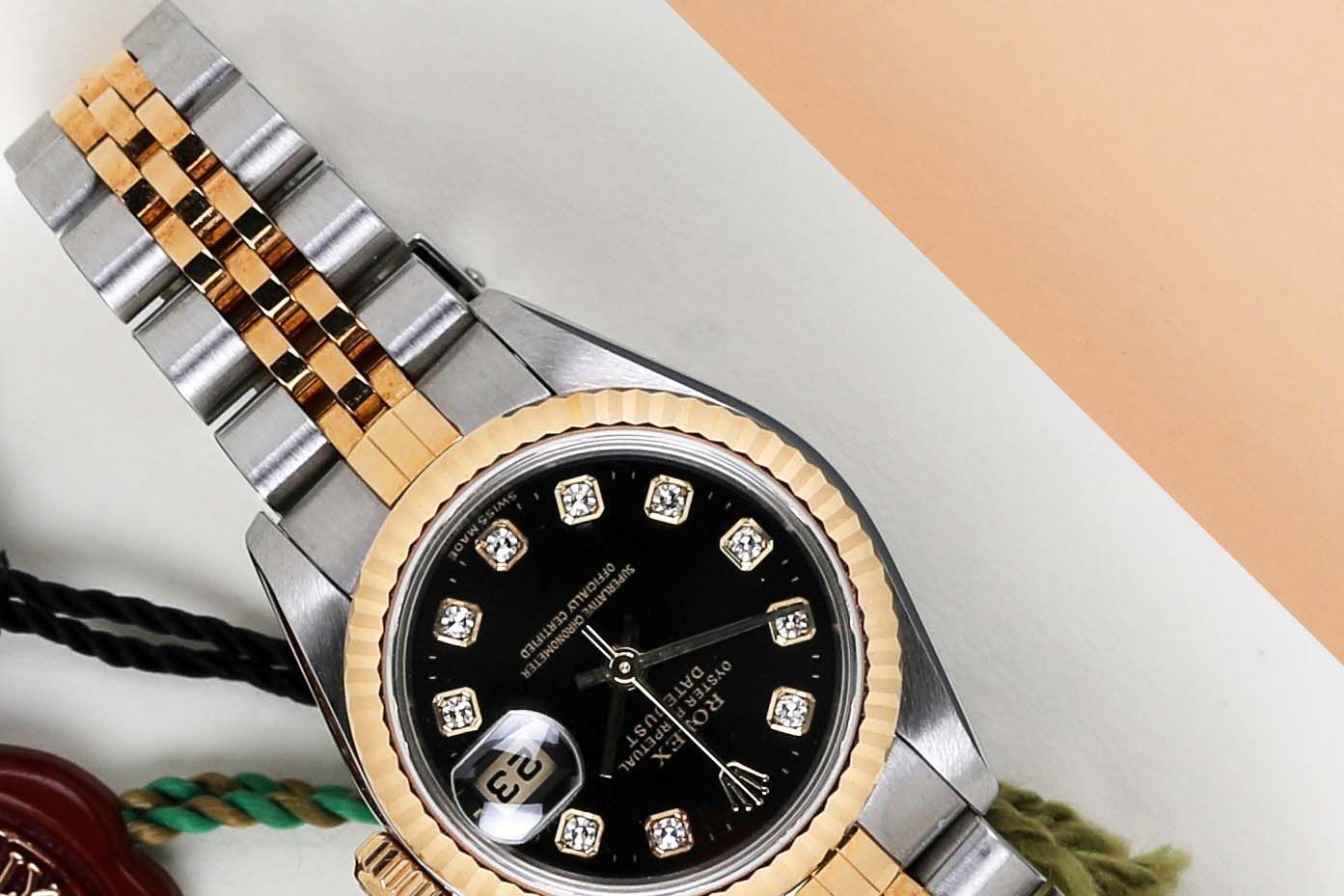Full Set | Original Rolex Black Diamond Dial Rolex introduced the original Datejust in 1945 to celebrate the company's 40th anniversary. Due to the enormous success, Rolex released the first Lady-Datejust in 1957. This Rolex Datejust 'Black Diamond Dial' was sold for the first time in August 2001. This Datejust is made out of a combination of 18k Yellow Gold and stainless steel which is fitted with a Jubilee bracelet. In addition, it comes with a Black Diamond Dial. This Rolex Datejust 26 is in pristine condition and comes with the original Rolex Warranty Papers and box. Furthermore, the watch has been serviced by our watchmaker, therefore it comes with one year of warranty.