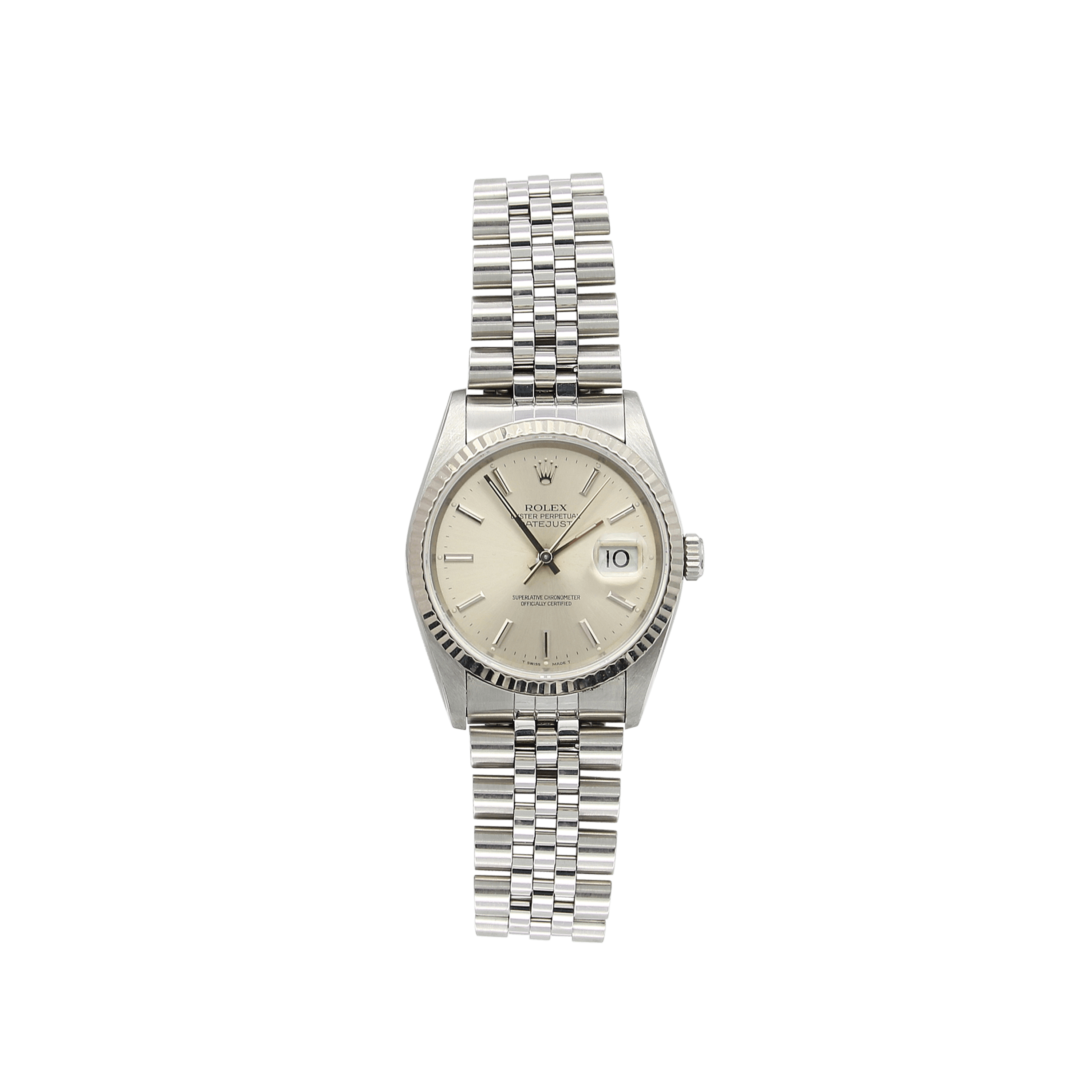 For sale at Debonar Watches: pre-owned Rolex Datejust ref. 16234, full set.This Rolex Datejust in steel presents a fantastic silver dial, a white gold bezel and a coordinated jubilee bracelet.This 36 mm. diameter stainless steel case is set with screw-down case back and crown, a fluted white gold bezel, a sapphire crystal with cyclops lens.On the dial we find at 12 o'clock the words "ROLEX" - "OYSTER PERPETUAL" - "DATEJUST" and at 6 o'clock the classic writing "Superlative Chronometer Officially Certified". This Datejust's reference has been in production for a long time: you can find Datejust 16234 produced from the late 80s to mid-2000s. BRAND ROLEX MODEL DATEJUST REFERENCE 16234 CASE MATERIAL STEEL MOVEMENT AUTOMATIC DIMENSION 36 MM DIAL SILVER CRYSTAL SAPPHIRE BRACELET TYPE JUBILEE BRACELET MATERIAL STEEL ORIGINAL BOX YES ORIGINAL PAPERS YES YEAR APPROX. THE '90s CONDITION VERY GOOD