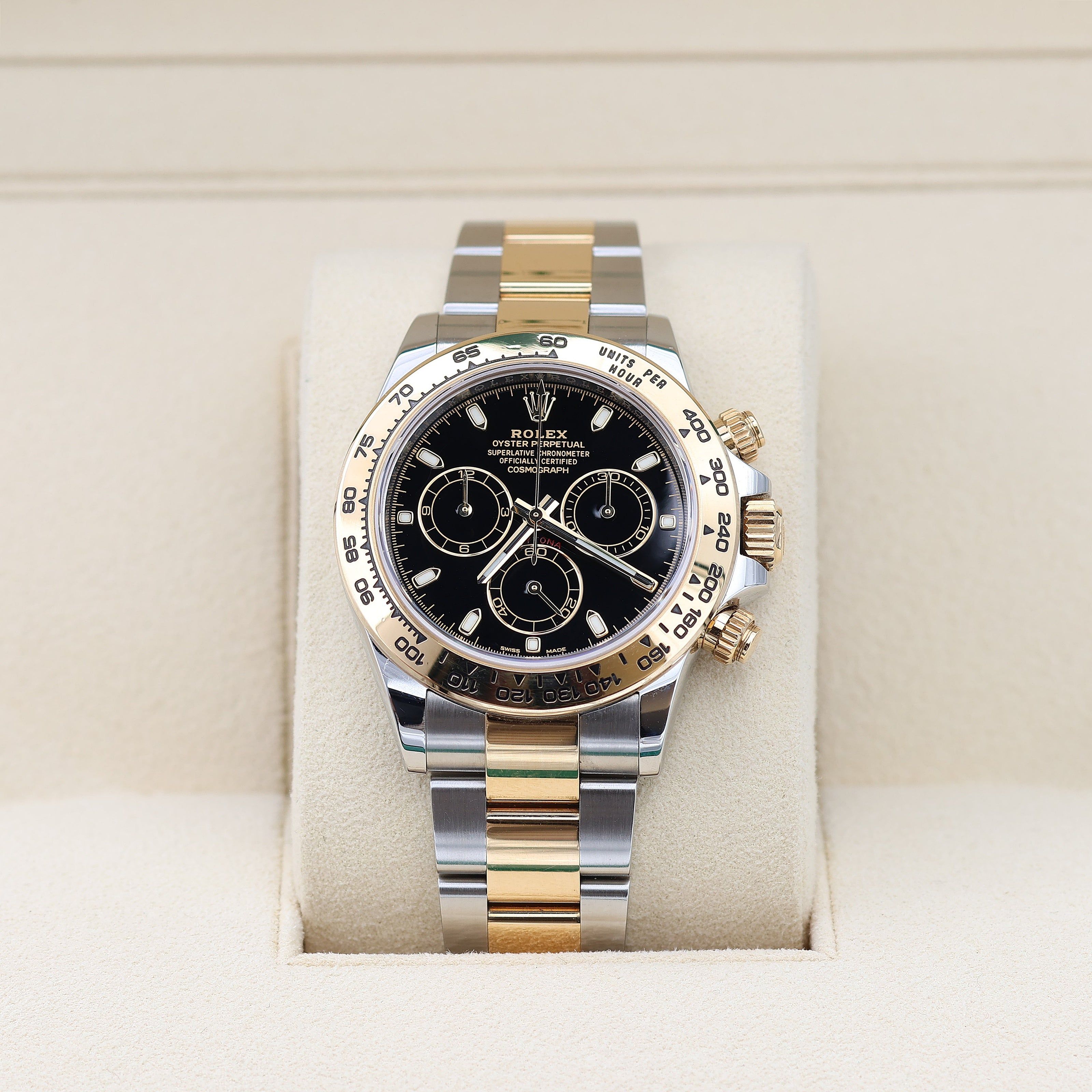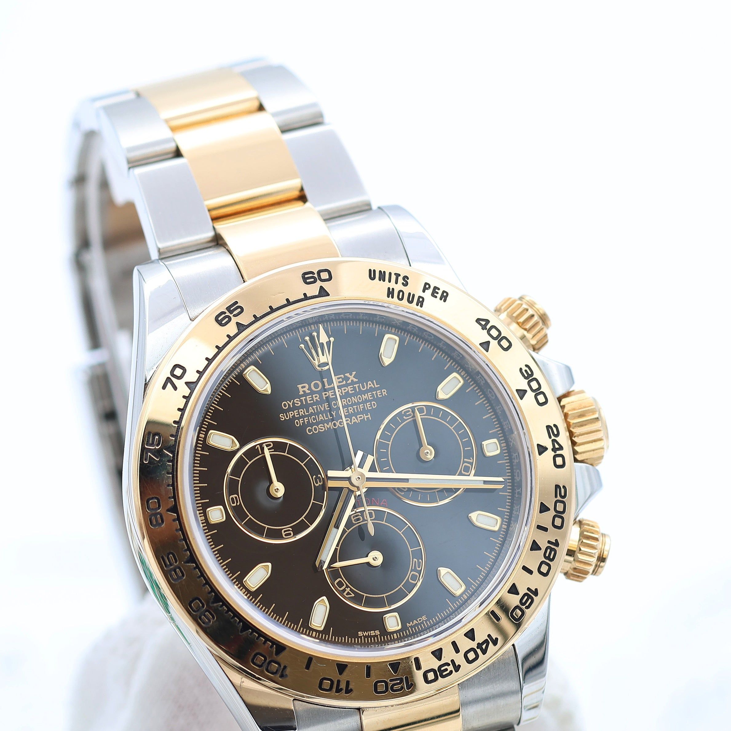For sale at Debonar Watches: pre-owned Rolex Daytona 116503, full set. The Rolex Daytona 116503 is crafted from 904L stainless steel and 18k yellow gold. This blend of materials is also known as Rolesor. This combination of materials gives the watch an elegant yet sporty look that has become synonymous with the Daytona collection. Amongst all of the different Daytona references that Rolex has released over the years, the 116503 is one of the most recent. Since its release in 2016, this two-tone Rolex chronograph has captured the hearts of many with its sleek design, high-quality materials, and exceptional functionality. The Daytona 116503 is a two-tone version of the classic Daytona, meaning it is finished in yellow gold and steel. With its addition of gold elements, it adds a luxurious and elegant touch to the otherwise mostly sporty Daytona design.The Daytona 116503 has a solid case back that is screwed down using a special tool to ensure water resistance of up to 100 meters or 330 feet. BRAND ROLEX MODEL DAYTONA REFERENCE 116503 CASE MATERIAL STEEL/GOLD MOVEMENT AUTOMATIC DIMENSION 40 MM DIAL BLACK BEZEL GOLD CRYSTAL SAPPHIRE BRACELET TYPE OYSTER BRACELET MATERIAL STEEL/GOLD BRACELET LENGHT 18 CM ORIGINAL BOX YES ORIGINAL PAPERS YES YEAR APPROX. '16-TODAY CONDITION EXCELLENT