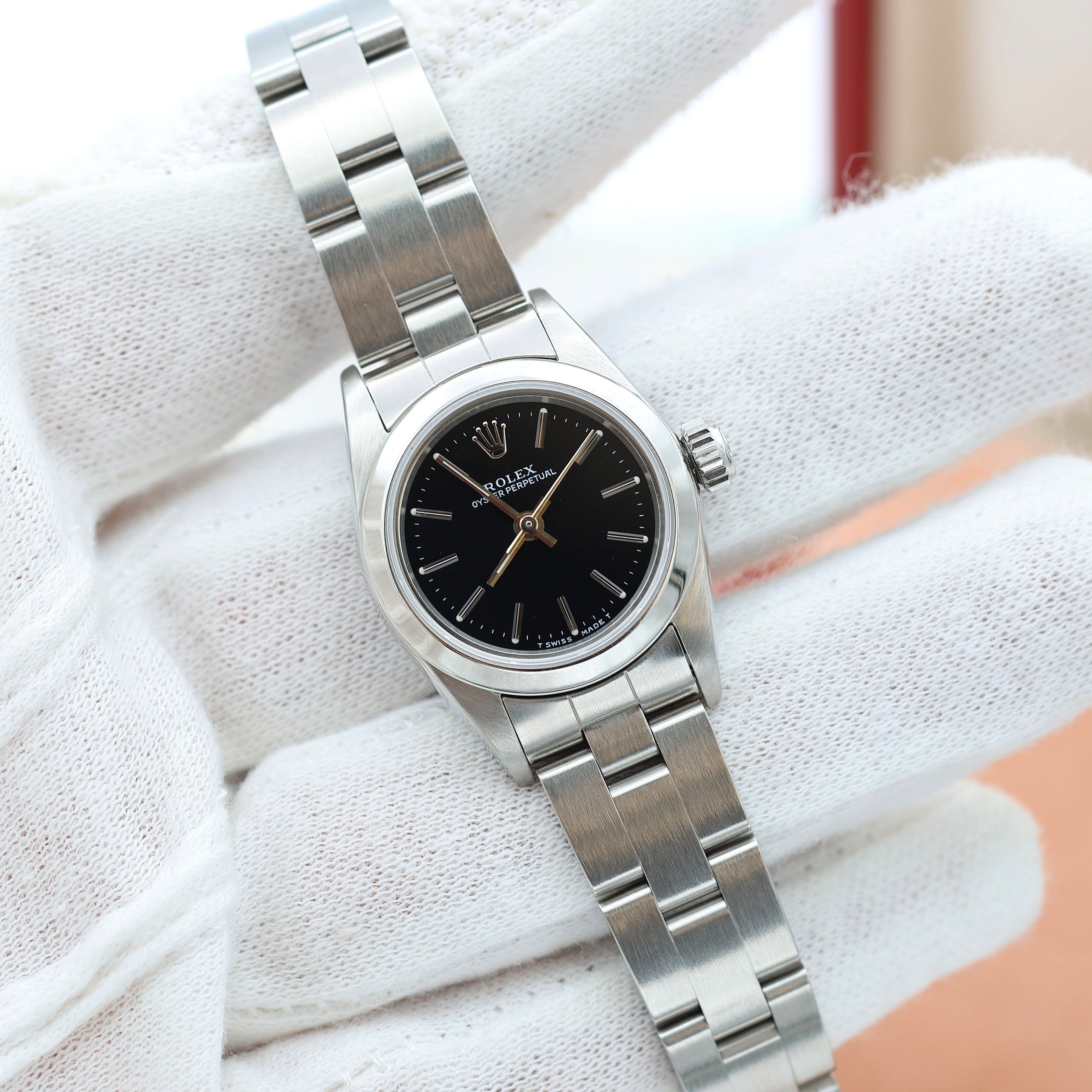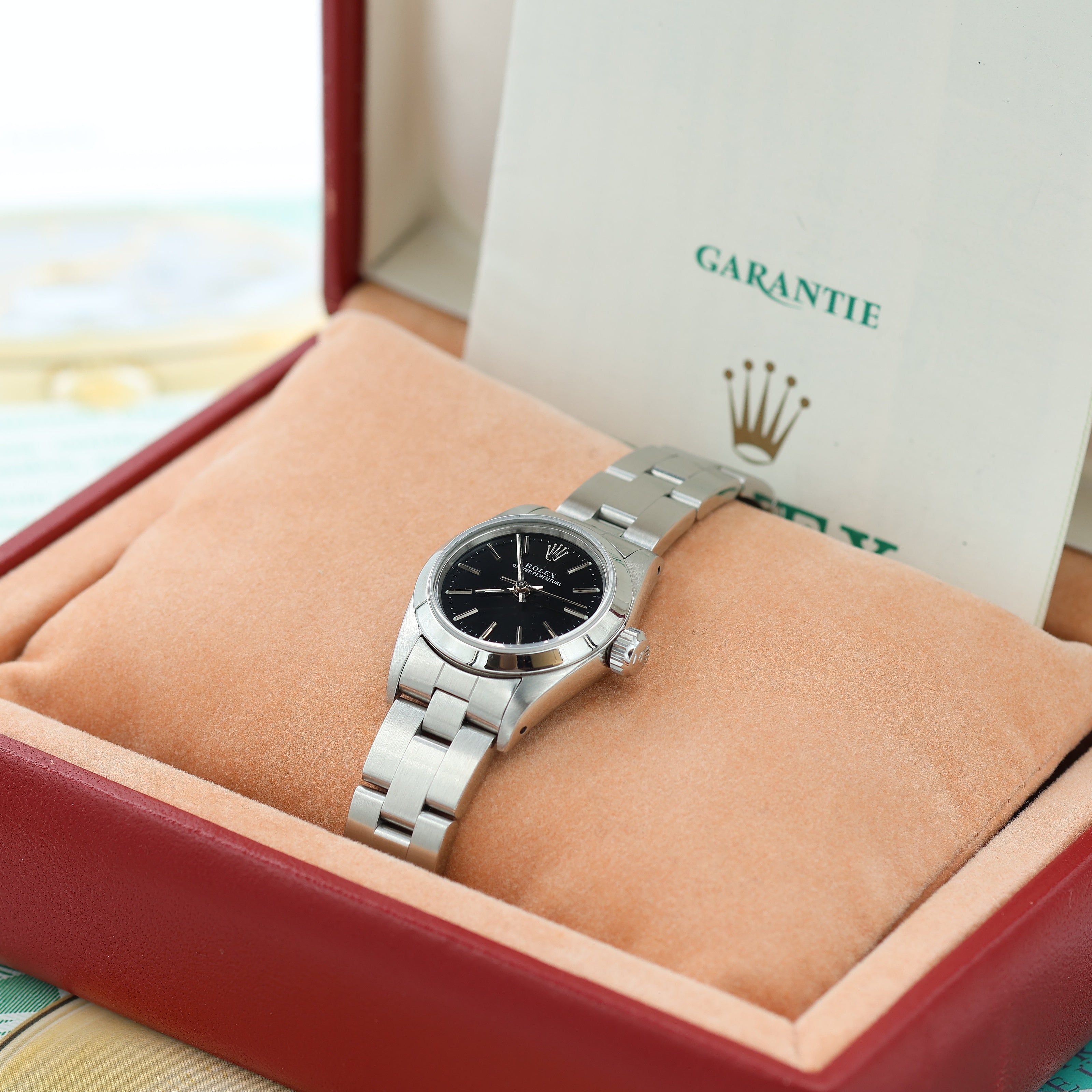 For sale at Debonar Watches: pre-owned Rolex Oyster Perpetual lady ref. 67180 with a deep black dial, full set.The ladies Oyster Perpetual ref. 67180 offers striking feminine style that continues to attract collectors, even decades later. Its beauty is in its simple yet luxurious design that includes a brushed and polished stainless steel finish, a smooth bezel, and a feminine 26mm Oyster case worn on an Oyster bracelet. The case is designed with a stainless steel caseback, waterproof screw-down crown, and sapphire crystal, offering the ultimate protection against everyday wear. This stainless steel variation will appeal to anyone with an entry-level budget. BRAND ROLEX MODEL OYSTER PERPETUAL LADY REFERENCE 67180 CASE MATERIAL STEEL MOVEMENT AUTOMATIC DIMENSION 26 MM DIAL BLACK BEZEL STEEL CRYSTAL SAPPHIRE BRACELET TYPE OYSTER BRACELET MATERIAL STEEL BRACELET LENGHT 16 CM ORIGINAL BOX YES ORIGINAL PAPERS YES YEAR APPROX. THE '90s CONDITION VERY GOOD