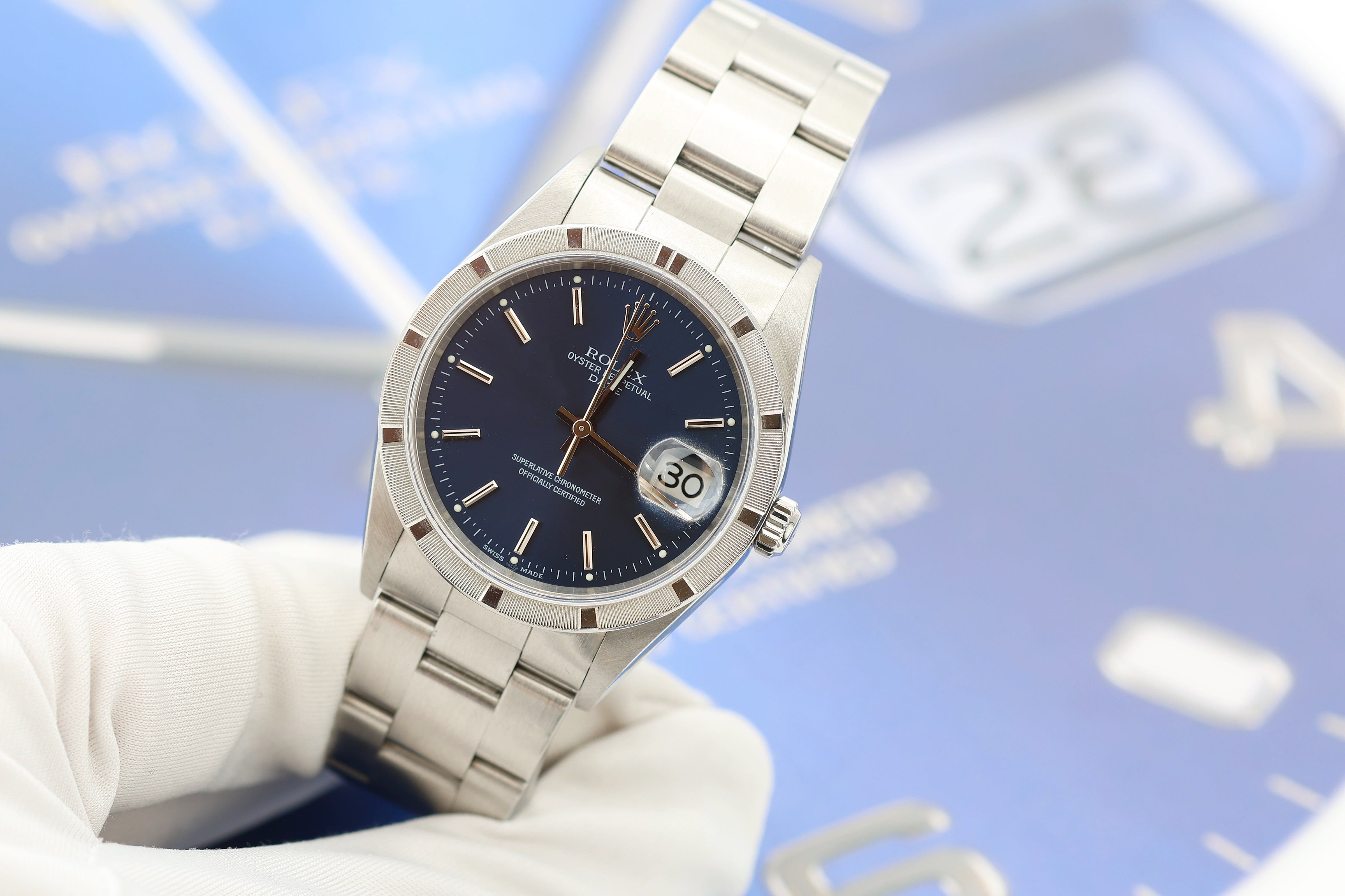 For sale: pre-owned Rolex Date ref. 15210 with a mesmerizing blue soleil dial on an oyster bracelet, full set with original papers and box. While made in steel (that makes it look as perfect as the go-anywhere / do-anything companion) the bezel is a little different to anything you will see today in the Rolex catalog.The engine-turned style consists of grooves etched into the surround, much more finely than the traditional fluted type. Above each hour marker, the metal has been left smooth resulting in little tabs at the indexes, with a double width one at the 12 o’clock. The ref. 15210 is the ideal blend of the old and the new: a beautiful vintage-looking addition to the collection, but one robust and reliable enough to last several lifetimes. BRAND ROLEX MODEL DATE REFERENCE 15210 CASE MATERIAL STEEL MOVEMENT AUTOMATIC DIMENSION 34MM DIAL BLUE BEZEL STEEL CRYSTAL SAPPHIRE BRACELET TYPE OYSTER BRACELET MATERIAL STEEL ORIGINAL BOX YES ORIGINAL PAPERS YES YEAR APPROX. THE '90s CONDITION EXCELLENT