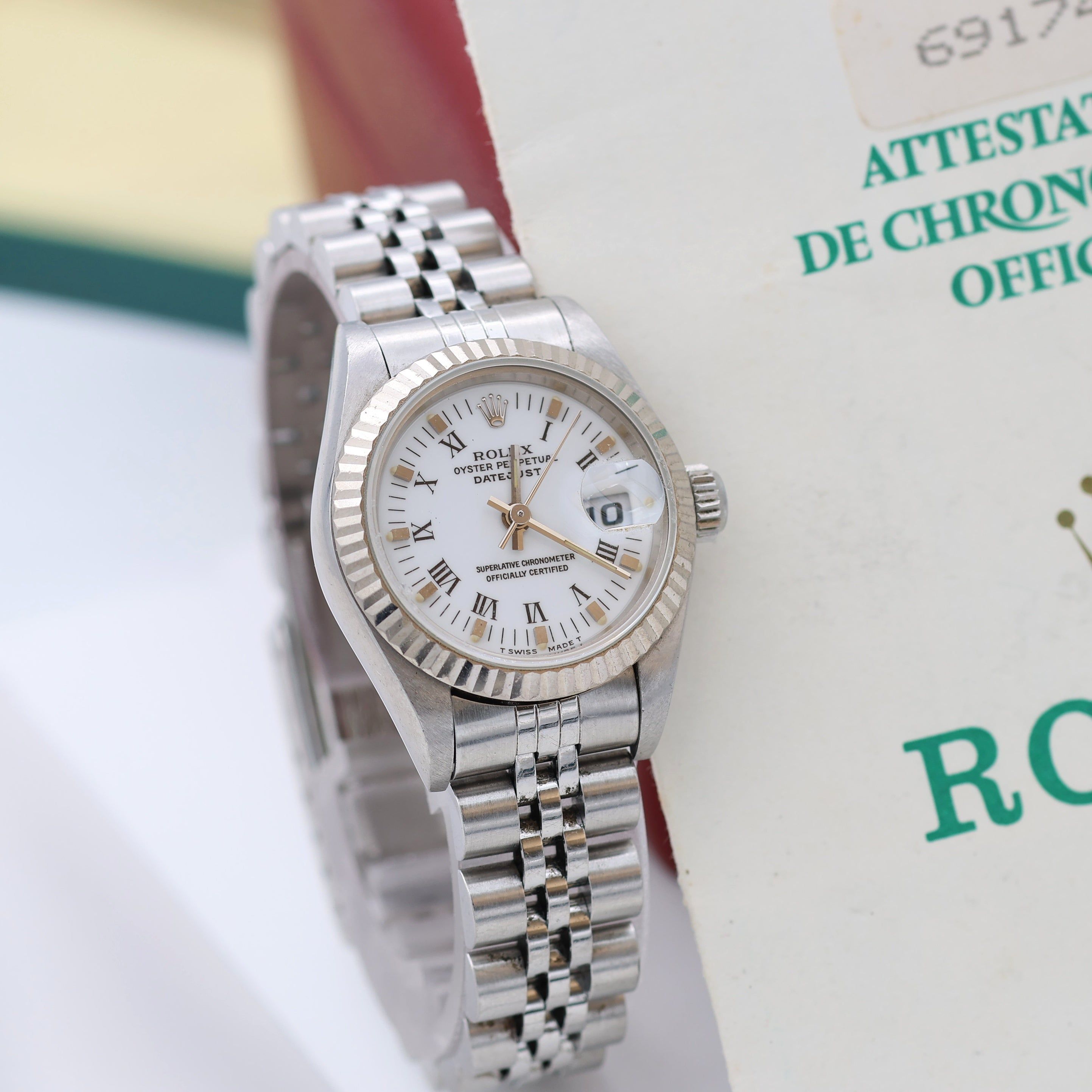 For sale at Debonar Watches: pre-owned Rolex Oyster Perpetual Datejust Ref. 69174, full set, with a feminine white dial with small roman numbers and lines minutes. Fine, center seconds, self-winding automatic, water-resistant, stainless steel and 18K white gold lady's wristwatch with date and a stainless steel Rolex Jubilee bracelet with deployant clasp.The Lady-Datejusts are all about delicacy and finesse, something to accentuate a sophisticated outfit. BRAND ROLEX MODEL DATEJUST LADY REFERENCE 69174 CASE MATERIAL STEEL MOVEMENT AUTOMATIC DIMENSION 26 MM DIAL WHITE ROMAN (SMALL - LINES) BEZEL 18K GOLD CRYSTAL SAPPHIRE BRACELET TYPE JUBILEE BRACELET MATERIAL STEEL BRACELET LENGHT 16 CM ORIGINAL BOX YES ORIGINAL PAPERS YES YEAR APPROX. THE '90s CONDITION VERY GOOD