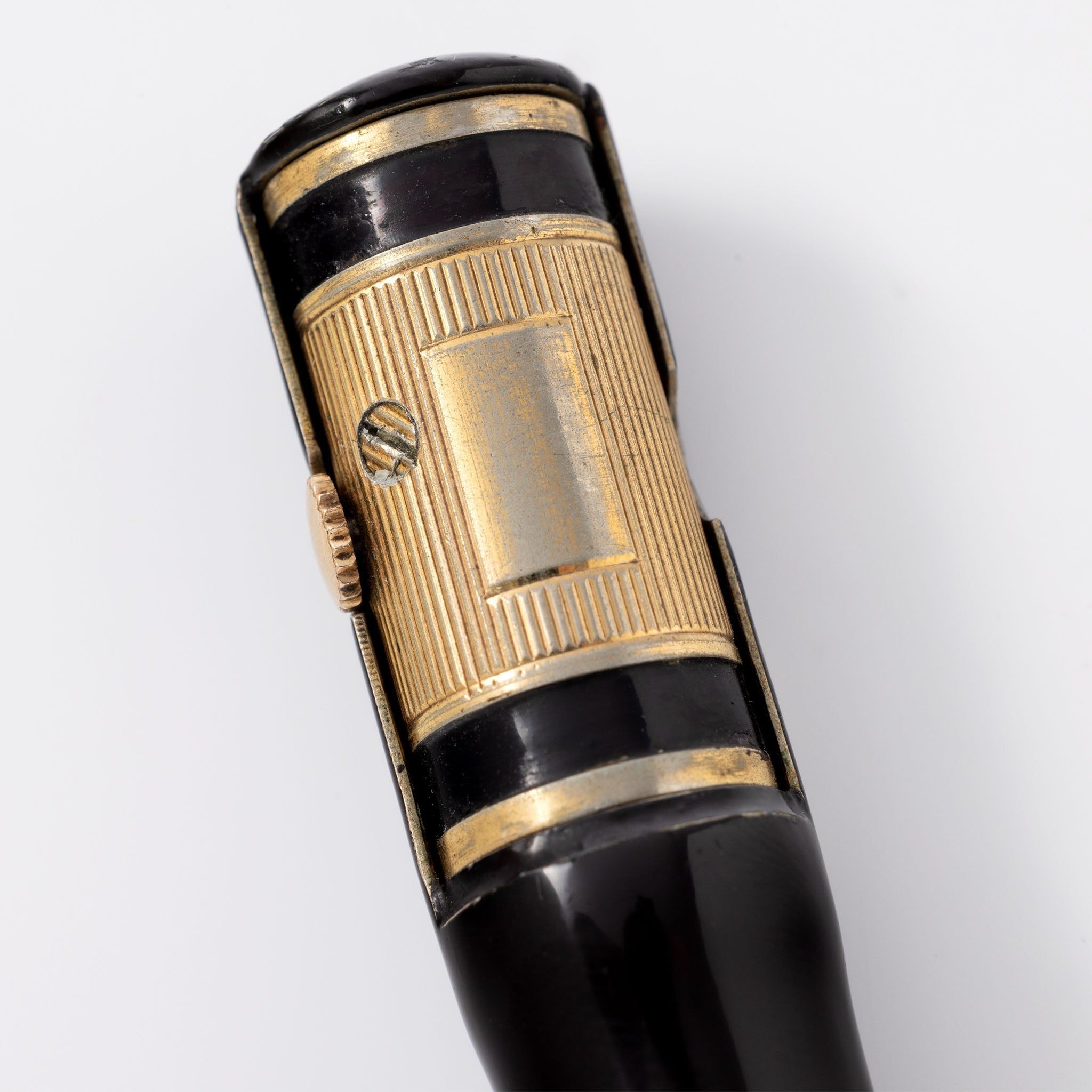 Founded in 1858 by Frédéric Boucheron, the House of Boucheron is a luxury retailer that specializes in beautifully crafted watches, jewelry, and accessories from its prestigious flagship location on Place Vendome in Paris. The brand's creations are celebrated for their elegance and innovation, including groundbreaking designs like the clasp-less necklace and the integration of diamonds with pearls. This is an interesting pencil in Chinese lacquer with a hidden watch in the top half. The pencil remains in excellent condition. The top section of the pencil houses a small watch with manual wind movement, with winding crown to the right. The black dial has gold printing in an Art Deco style. The watch can be concealed by rotating the barrel of the pencil. This cool object d’art comes in its original Boucheron box from Bond Street London. Our watchmaker has fully serviced the movement. This is a lovely horological gem for your desk. Get in touch and let’s draw up a sale! Specifications: - Boucheron Pencil Watch- Black Lacquer finish- Black dial with gold print- Gold hands- Manual wind movement- Fully serviced by our watchmaker- One-year mechanical warranty- Includes a handmade leather watch pouch- Free worldwide Fedex Priority shipping