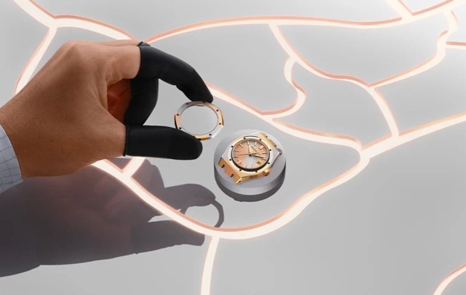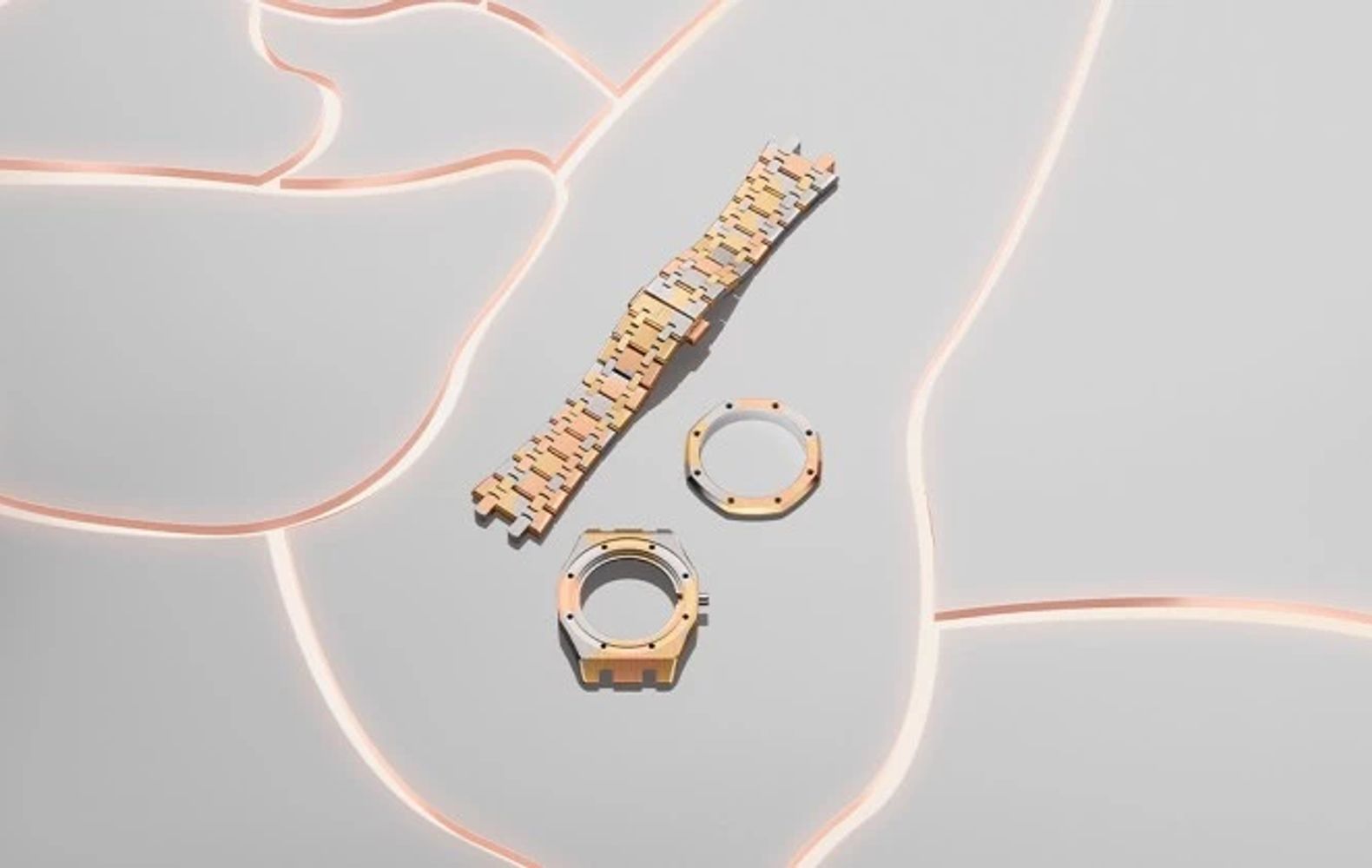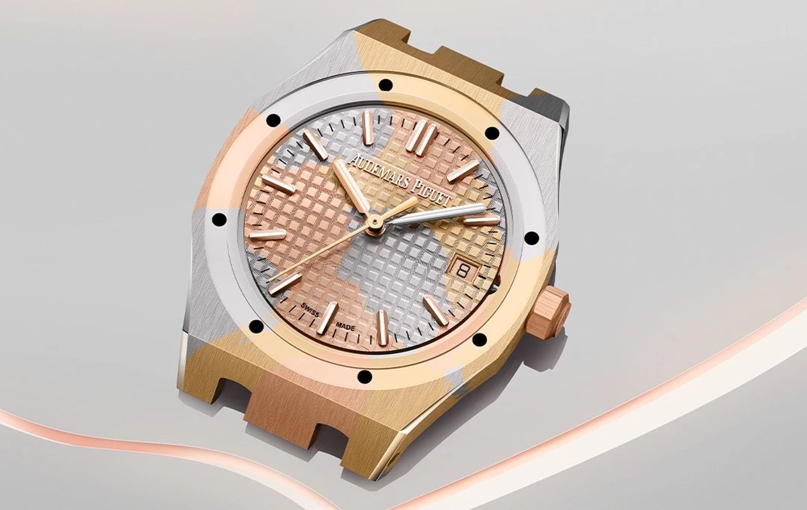 The innovations are impressive! AP has extended the use of chroma ceramic to gold, and as we all know, the brand does not take baby steps. This new material, which is called Chroma Gold, is a fusion of the typical three colors of gold: white, yellow, and pink in a single piece. While other types of gold have different colored gold components joined by some kind of adhesive, Chroma Gold is a single piece of material with a camouflage design incorporated right in the manufacturing process.