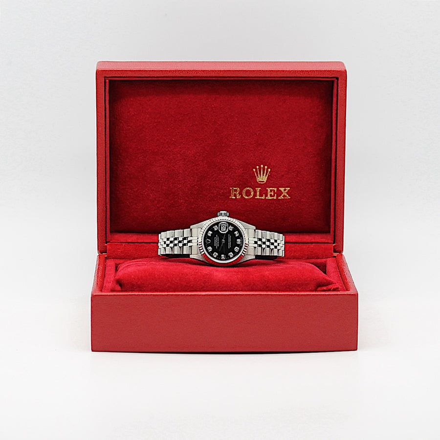 Rolex Lady Datejust steel/white gold Ref: 79174. The watch is in good condition considering its age. It is equipped with an automatic movement. The work was oiled and cleaned in February 2025. An enrichment for every watch collector and enthusiast. The anniversary bracelet is made of steel and used, but still in good condition (jubilee bracelet 15.5 cm long (measured without watch)). You are bidding on a beautiful and classic top-class wristwatch with recognition value. Sapphire crystal. The dial is black - colored and set with 10 diamonds (this is a Rolex setting). The bezel is made of 18KT white gold. The Datejust watch is 24 years old and is sold in used condition. Papers: No Rolex box is available. A certificate of authenticity from our Hamburg watch shop is available.