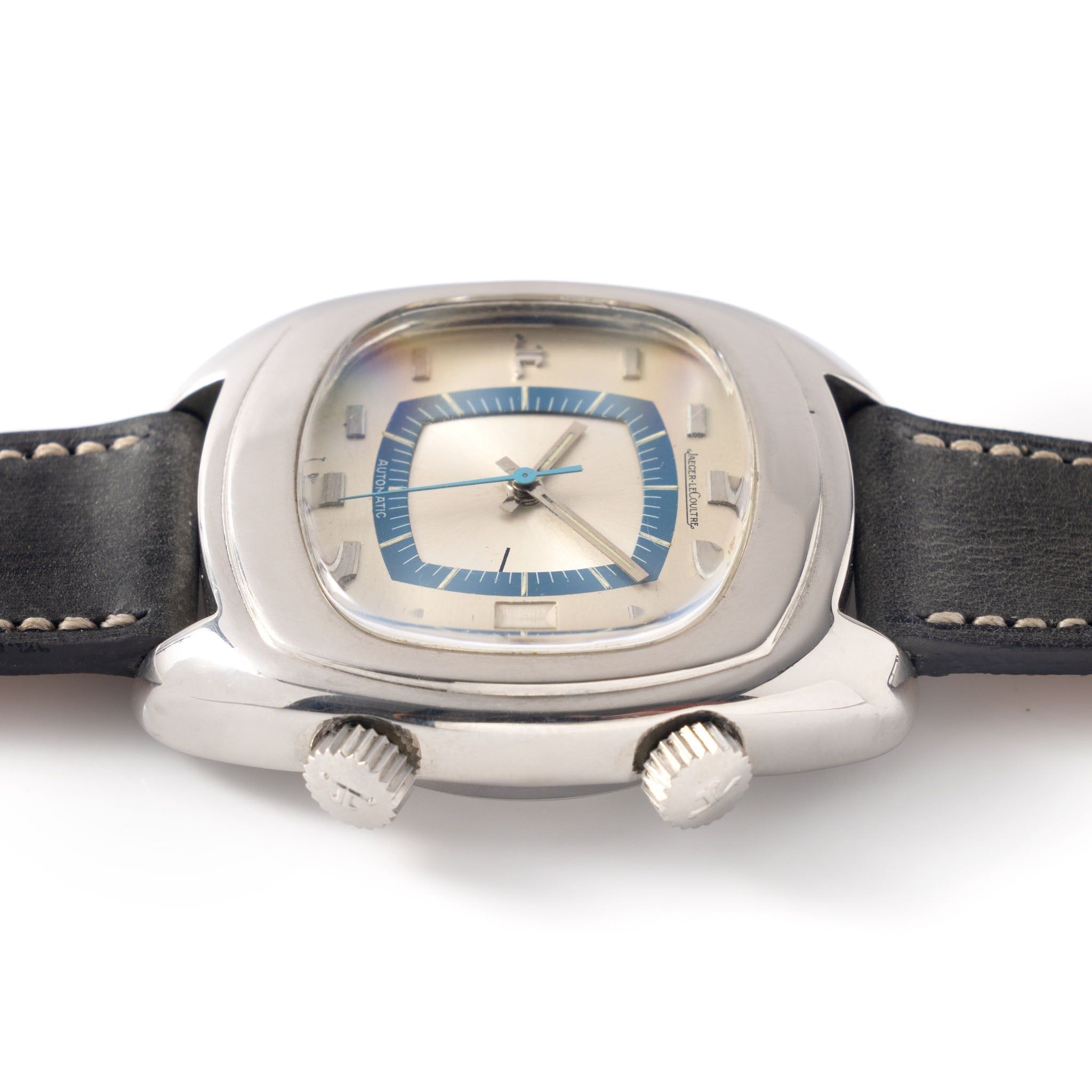 Founded by Antoine LeCoultre in 1833, JLC boasts hundreds of inventions, over a thousand calibers, and some of the most important watches of the 20th century, including the Reverso, Atmos, and Memovox. The Memovox made its debut in the early 1950s, introduced by Jaeger-LeCoultre. Its dual crowns allowed the user to wind and set the alarm and timekeeping functions independently. Embodying the efficiency and optimism of the post-war era, the Memovox, which translates to "voice of memory," quickly became a symbol of distinction for the stylish and busy man. Its distinctive alarm mechanism added a practical yet sophisticated touch to daily routines: from waking up and attending appointments to catching trains or feeding parking meters. This particular example is a reference E871, featuring the typical "1970s design language" — a TV-screen-shaped steel case measuring 38mm, with rounded edges and a cool dial layout. The alarm function is displayed via a blue disc in the middle, quirky horizontal stick markers without lume, a Jaeger-LeCoultre logo opposite the date at the three o’clock position, and topped off with a light blue seconds hand. We’ve paired this cool alarm watch with one of our Bulang & Sons straps. Few brands can boast the pedigree of Jaeger-LeCoultre, yet its often-overlooked accomplishments seem to center around the underappreciated Memovox, a mainstay in the JLC catalog for more than 70 years without interruption. Anyone who grew up during the 1970s will always have a soft spot for these quirky TV-shaped watches. They transport you back to the days of Sesame Street, no remote controls, and perhaps even black-and-white television. Let us beam you back to simpler times! Specifications: - JLC Memovox reference e871- 38 mm steel “TV”case- Two crowns – one movement winding one alarm winding- Serial 127xxxx dates to the 1970s- Silver dial with blue inner disc and light blue second hand- Automatic movement calibre 916- Alarm system- Pictured leather strap- Fully checked by our watchmaker- One-year mechanical warranty- Free worldwide Fedex Priority shipping