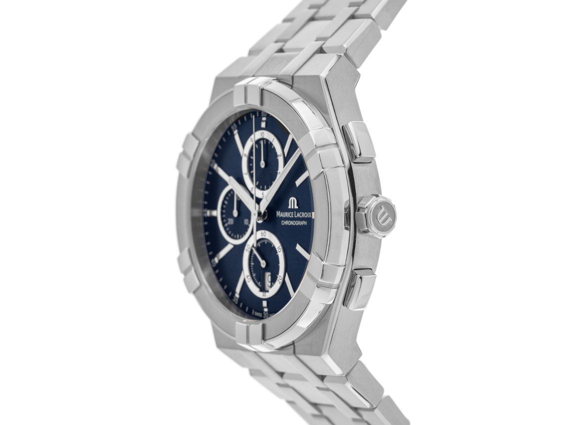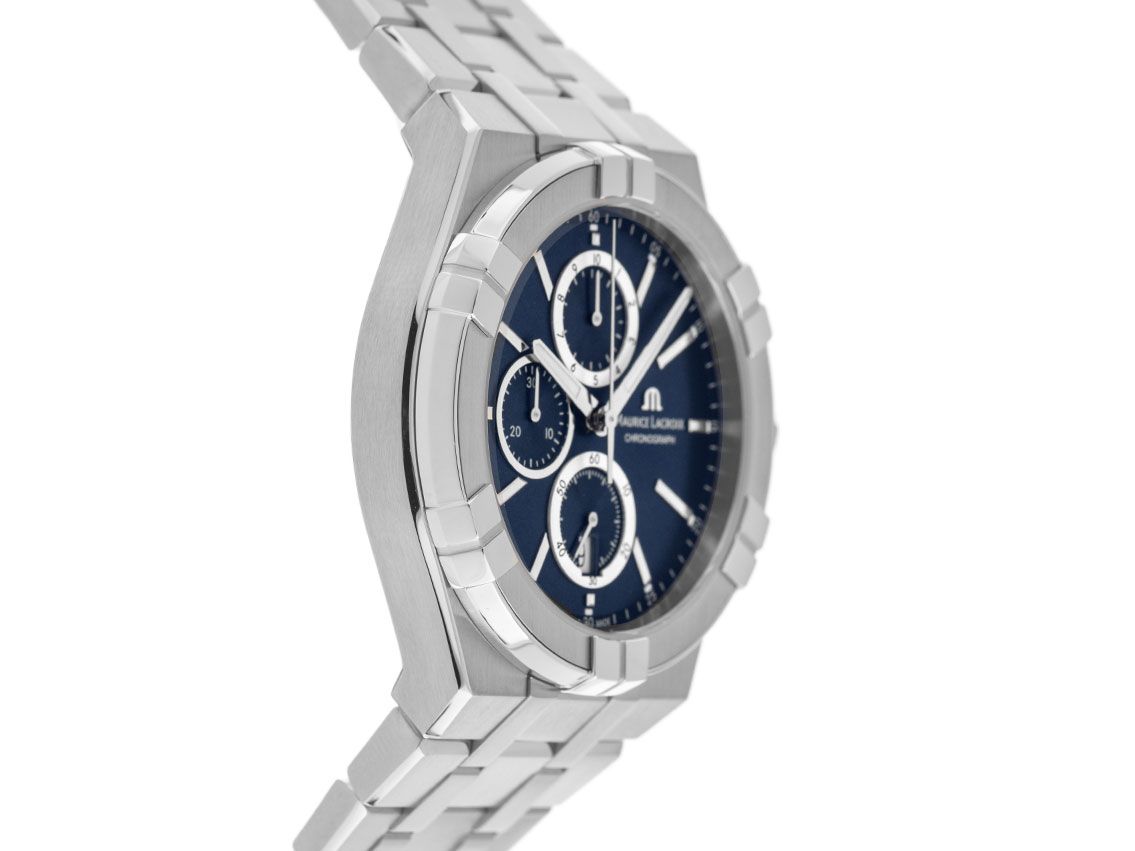 Gehäuse Edelstahl poliert und satiniert, Gehäusedurchmesser ohne Krone 42mm, Gehäusehöhe 10,7mm. Lünette Edelstahl satiniert con polierten Reitern. Bracciale Edelstahl lucido e satinato, Doppelsicherheitsfaltschließe Edelstahl con logo dell'azienda. Zifferblatt blau con indici Edelstahl aufgesetzten e Leuchtzeigern polierten. Cronografo Kaliber Ronda 3540. Anzeige von Stunde und Minute über Zeiger aus der Mitte, kleine Sekunde mit Sekundenstopp zur sekundengenauen Einstellung der Uhrzeit bei 6 Uhr, Datumsanzeige mit Schnellverstellung bei 6 Uhr. Saphirglas kratzfest. Coperta con protezione laterale e logo dell'azienda. Corpo in Edelstahl verniciato e con segni di usura. Peso dell'orologio con bracciale incluso 171 g, lunghezza del bracciale con gehäuse incluso 200 mm. Wasserdicht bis 10 ATM. Numero di riferimento: AI1118-SS002-430-1, Gehäusenummer: BB59XXX, ID: ST197516060724H-1450, Artikelnummer: 10000075454. Scatola originale Maurice Lacroix con cartone e carta di garanzia del 2024, set completo. Neu. Spedizione immediata.