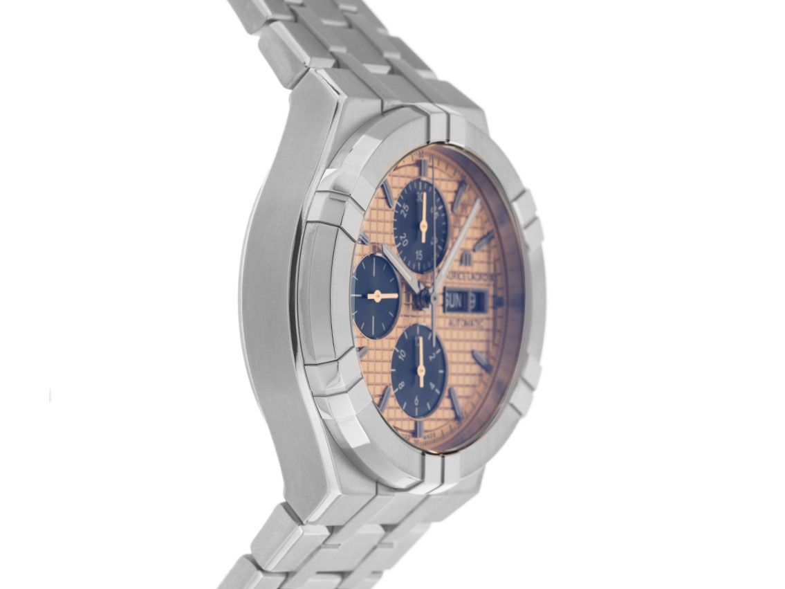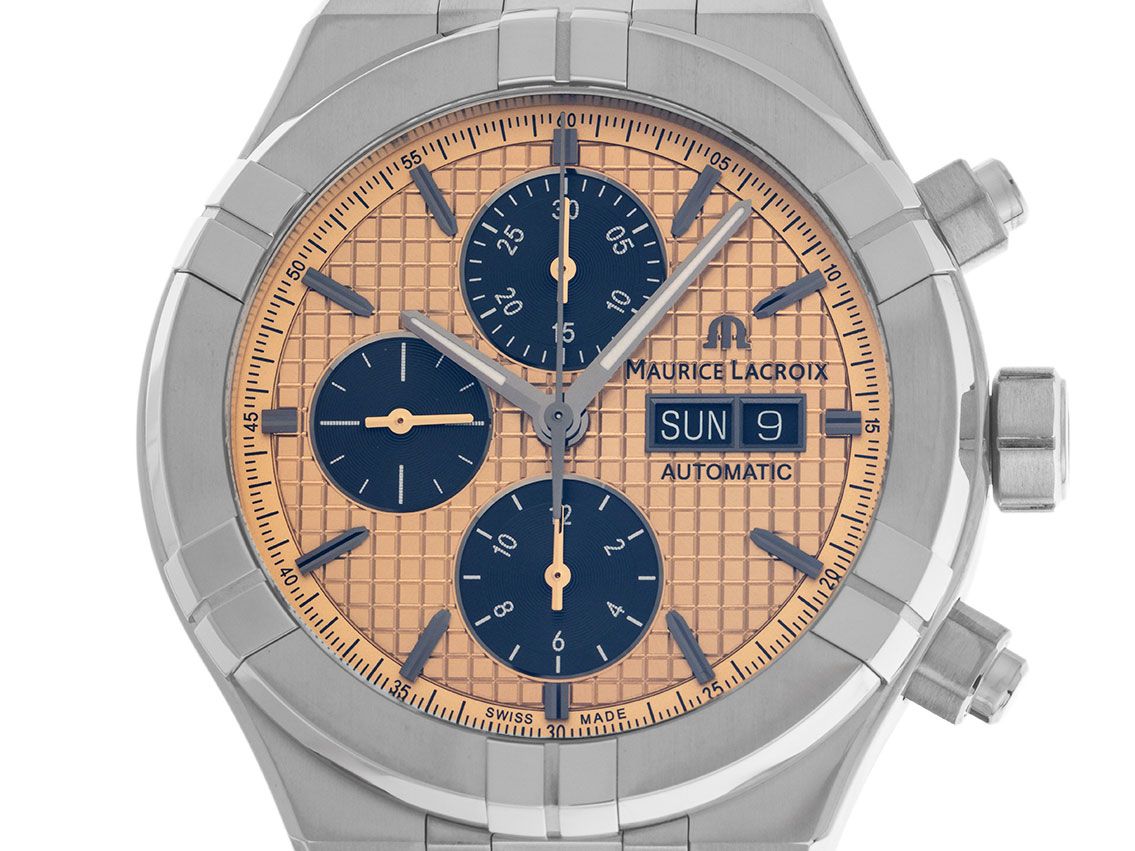 Gehäuse Titan poliert und satiniert, Gehäusedurchmesser ohne Krone 44mm, Gehäusehöhe 15,0mm. Lünette Titan satiniert mit polierten Reitern. Bracciale Titan lucido e satinato, Doppelfaltschließe Titan verdeggiante con logo dell'azienda. Zifferblatt champagnerfarben con Waffelmuster aufgesetzten Edelstahl Indexen e polierten Edelstahl Leuchtzeigern. Orologio Automatico, Cronografo, Maurice Lacroix Manufakturkaliber ML112 con 25 Edelsteinen, 28.800 A/h, Riserva di Carica di circa 48 Stunden. Anzeige von Stunde und Minute über Zeiger aus der Mitte, kleine Sekunde mit Sekundenstopp zur sekundengenauen Einstellung der Uhrzeit bei 9 Uhr, Wochentagsanzeige in Englisch und Datumsanzeige mit Schnellverstellung bei 3 Uhr. Saphirglas kratzfest. Krone verschraubbar mit Hersteller-Logo. Corpo in Edelstahl 7-fach, verniciato, con vetro di sicurezza in Saphirglas. Peso dell'orologio con bracciale incluso 148 g, lunghezza del bracciale con bracciale incluso. Gehäuse 210mm. Wasserdicht bis 20 ATM. Numero di riferimento: AI6038-TT032-530-1, ID: ST197551761024H-4350, Artikelnummer: 10000076771. Scatola originale Maurice Lacroix con cartone e garanzia, set completo. Neu. Neuheit. Spedizione immediata.