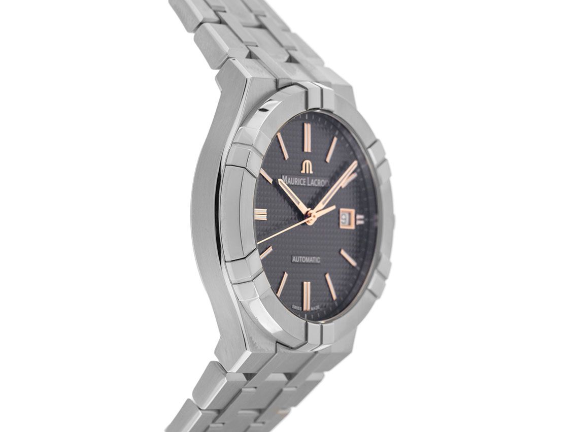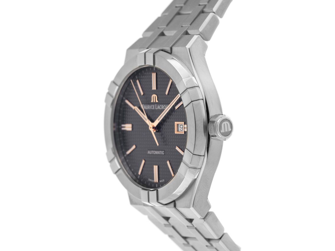 Gehäuse Edelstahl poliert e satiniert, Gehäusedurchmesser ohne Krone 42mm, Gehäusehöhe 10,8mm. Lünette Edelstahl satiniert con polierten Reitern. Bracciale Edelstahl lucido e satinato, Doppelsicherheitsfaltschließe Edelstahl con logo dell'azienda. Zifferblatt antracizzato con Waffelmuster, indici Leucht roségolden e Leuchtzeigern roségolden. Uhrwerk Automatik, Maurice Lacroix Manufakturkaliber ML115 mit 26 Edelsteinen, 28.800 A/h, Gangreserve ca. 38 Stunden. Anzeige von Stunde, Minute und Sekunde über Zeiger aus der Mitte mit Sekundenstopp zur sekundengenauen Einstellung der Uhrzeit, Datumsanzeige mit Schnellverstellung bei 3 Uhr. Saphirglas kratzfest. Krone verschraubbar mit Hersteller-Logo. Corpo in Edelstahl 7-fach, verniciato, con vetro di sicurezza in Saphirglas. Peso dell'orologio con la fascia da braccio 175 g, lunghezza della fascia da braccio con la fascia da braccio 210 mm. Gehäuse 210mm. Wasserdicht bis 20 ATM. Numero di riferimento: AI6008-SS002-331-1, ID: ST197525580225H-2250, Artikelnummer: 10000078778. Scatola originale Maurice Lacroix con cartone e garanzia e descrizione, set completo. Neu. Spedizione immediata.