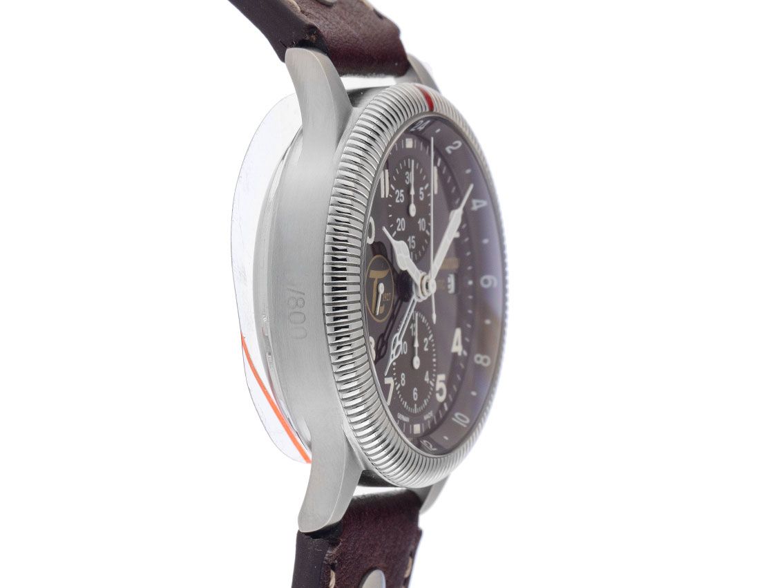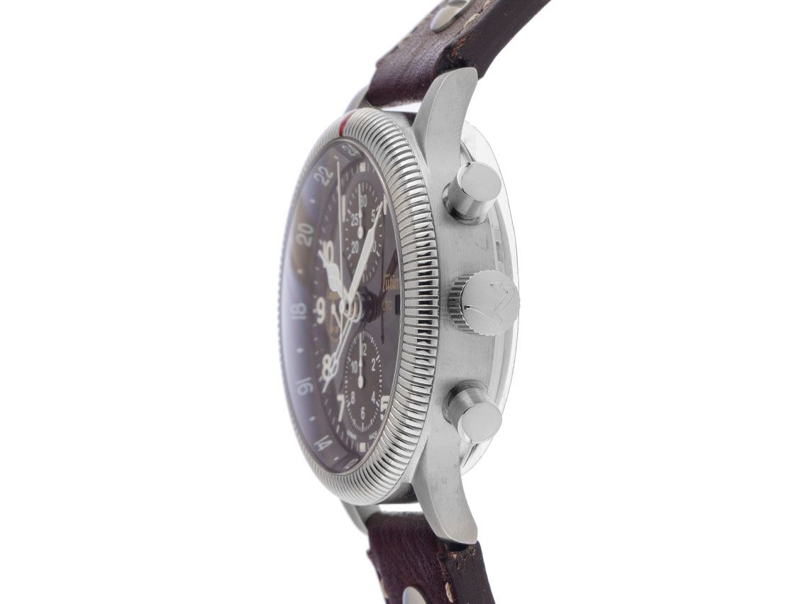 Gehäuse Edelstahl satiniert, Gehäusedurchmesser ohne Krone 43mm, Gehäusehöhe 16,0mm. Lünette Edelstahl kanneliert mit roter Markierung, beidseitig drehbar. Fascia da braccio in Leder marrone con Ziernaht, spessore 20mm, Stiftschließe Edelstahl. Zifferblatt braun mit weißen arabischen Ziffern und weißen Zeigern. Uhrwerk Automatik, Kaliber Tutima 7754 con 25 Edelsteinen. Anzeige von Stunde, Minute und Sekunde über Zeiger aus der Mitte mit Sekundenstopp zur sekundengenauen Einstellung der Uhrzeit, Datumsanzeige mit Schnellverstellung bei 3 Uhr, GMT (zweite Zeitzone) ablesbar über Zeiger aus der Mitte. Saphirglas kratzfest, bombiert und entspiegelt. Krone verschraubbar con logo dell'azienda. Corpo in Edelstahl ricoperto e gravemente danneggiato con un vetro di sicurezza in Saphirglas. Peso dell'orologio, compresa la fascia da braccio, 115 g. Numero di riferimento: 781-01, Gehäusenummer: 717XXX, ID: P068234000325H-4100, Artikelnummer: 10000079207. Con Gangkontrolle e una completa lavorazione a partire da März 2025, con garanzia di 1000 giorni. 1000 Tage Garantie. Scatola originale di Tutima e documenti di garanzia del dicembre 2008, oltre a Watchregister Auszug del marzo 2025, The Watch Register Zertifikat / ohne Eintrag (Internationale Datenbank für verlorene oder gestohlene Uhren), Set completo. Limitato a 800 esemplari. Superschnäppchen, extrem seltenes Sammlerstück. Come nuovo. Spedizione immediata.