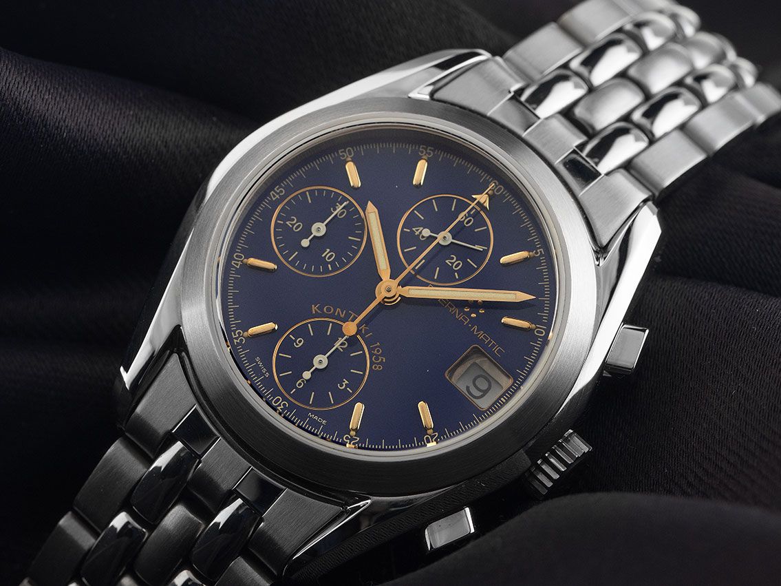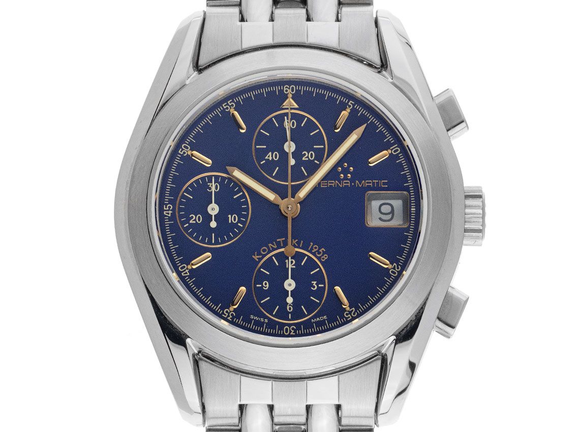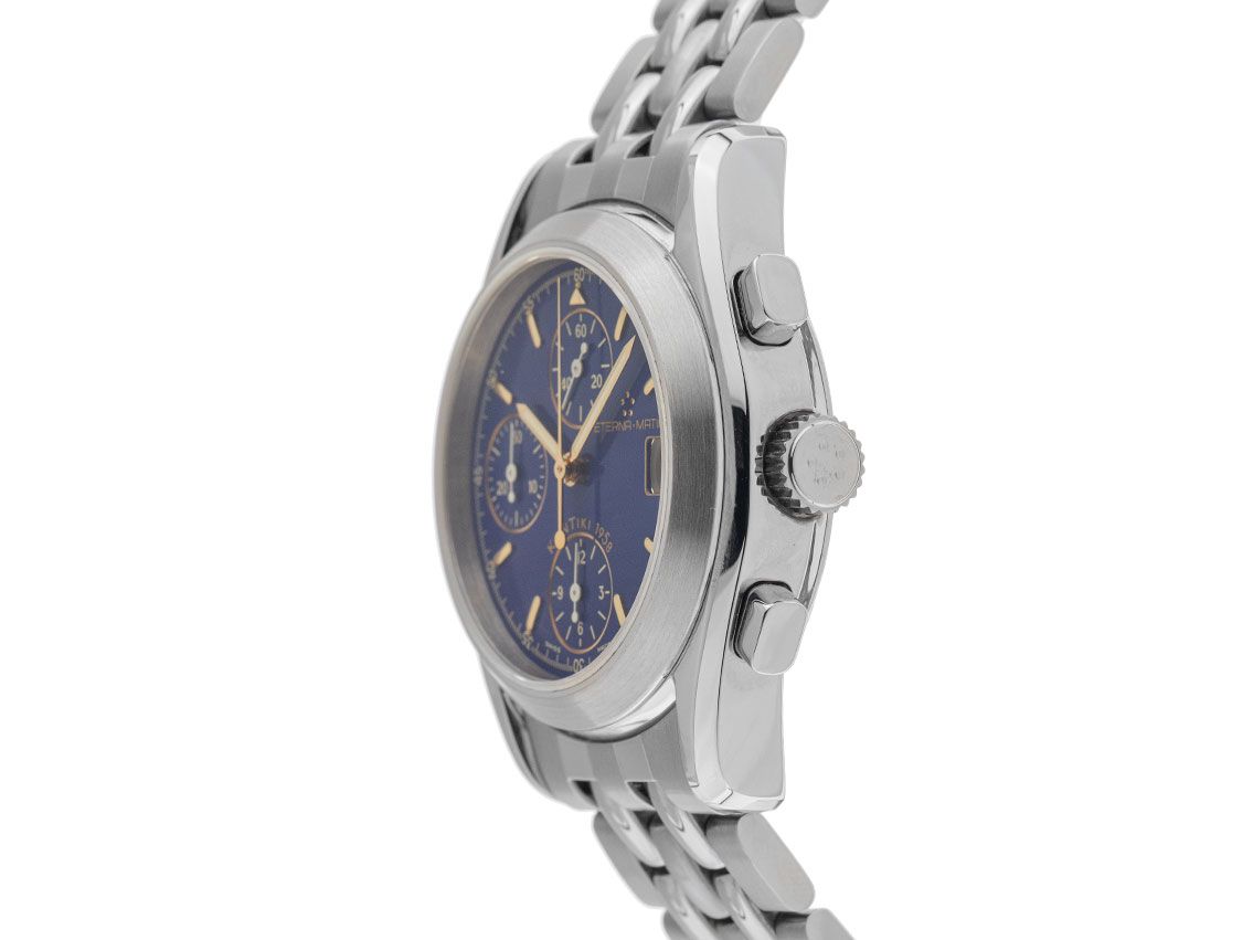 Eterna Kontiki 1958 Stahl Automatik Chronograph Armband StahlGehäuse Edelstahl poliert, Gehäusedurchmesser ohne Krone 37mm, Gehäusehöhe 12,3mm. Lünette Edelstahl satiniert. Armband Edelstahl poliert und satiniert, Sicherheitsfaltschließe Edelstahl mit Hersteller-Logo. Zifferblatt blau mit aufgesetzten gelbgoldenen Indexen und gelbgoldenen Zeigern. Uhrwerk Automatik, Chronograph, Kaliber 2892A. Anzeige von Stunde und Minute über Zeiger aus der Mitte, kleine Sekunde mit Sekundenstopp zur sekundengenauen Einstellung der Uhrzeit bei 12 Uhr, Datumsanzeige mit Schnellverstellung bei 3 Uhr. Saphirglas kratzfest. Krone mit Hersteller-Logo. Boden Edelstahl verschraubt und graviert. Gewicht der Uhr inklusive Armband 127g, Länge des Armbandes inklusive Gehäuse 210mm. Referenznummer: 1571.41, Baujahr: 1994, ID: ST548919040325HPP-3100, Artikelnummer: 10000079252. Mit Gangkontrolle und kompletter äußerlicher Aufarbeitung von März 2025, inkl. 1000 Tage Garantie. Original Eterna Box und Uhrenpass. Superschnäppchen, Kapitalanlage mit Wertsteigerungspotential, extrem seltenes Sammlerstück. Wie Neu. Lieferzeit sofort.