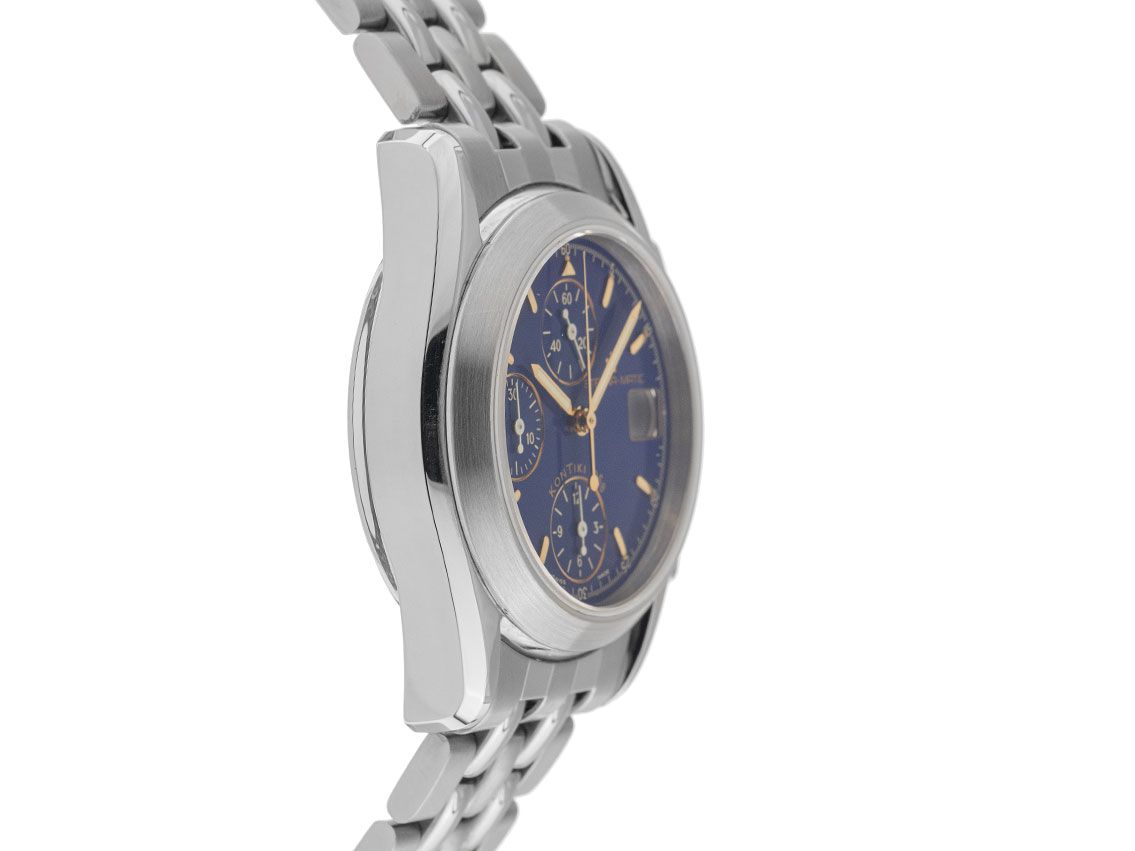 Gehäuse Edelstahl poliert, Gehäusedurchmesser ohne Krone 37mm, Gehäusehöhe 12,3mm. Lünette Edelstahl satiniert. Bracciale Edelstahl lucido e satinato, Sicherheitsfaltschließe Edelstahl con logo del produttore. Zifferblatt blau con indici in gelbgolden e Zeigern in gelbgolden. Orologio automatico, cronografo, calibro 2892A. Anzeige von Stunde und Minute über Zeiger aus der Mitte, kleine Sekunde mit Sekundenstopp zur sekundengenauen Einstellung der Uhrzeit bei 12 Uhr, Datumsanzeige mit Schnellverstellung bei 3 Uhr. Saphirglas kratzfest. Krone con logo dell'azienda. Corpo in Edelstahl, rigato e grave. Peso dell'orologio con fascia da braccio 127g, lunghezza della fascia da braccio con gehäuse 210mm. Numero di riferimento: 1571.41, Baujahr: 1994, ID: ST548919040325HPP-3100, Artikelnummer: 10000079252. Con Gangkontrolle e Aufarbeitung completo a partire da März 2025, con garanzia di 1000 giorni. 1000 Tage Garantie. Scatola originale Eterna e Uhrenpass. Superschnäppchen, Kapitalanlage mit Wertsteigerungspotential, extrem seltenes Sammlerstück. Come nuovo. Spedizione immediata.