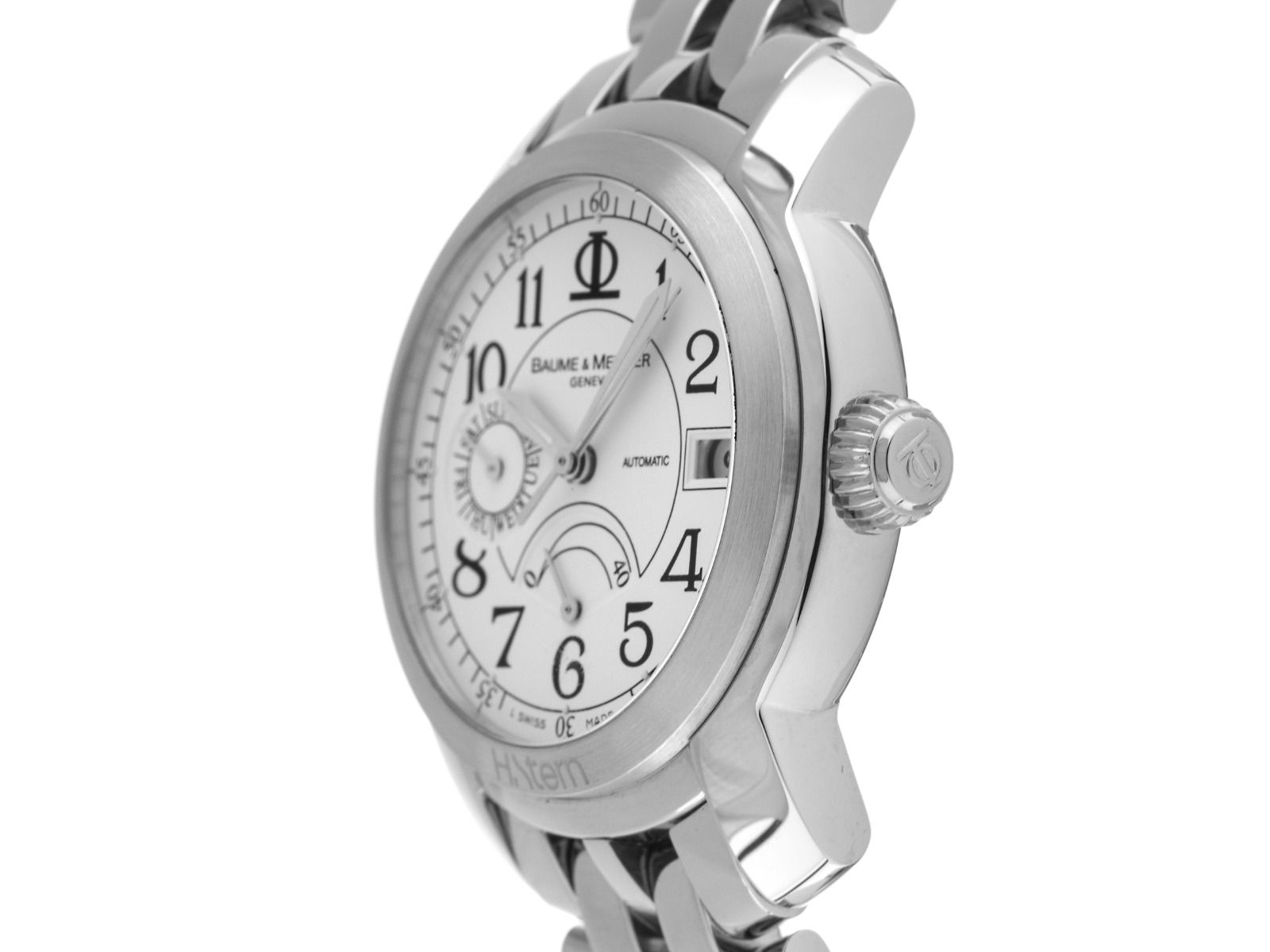 Gehäuse Edelstahl poliert, Gehäusedurchmesser ohne Krone 39mm, Gehäusehöhe 13,2mm. Lünette Edelstahl glatt e sateniert. Bracciale Edelstahl poliert, Doppelfaltschließe Edelstahl verdeggiante. Zifferblatt weiß con Ziffern e Indexen arabi in bianco e Zeigern in Edelstahl. Orologio automatico, calibro ETA 2892A2. Anzeige von Stunde, Minute und Sekunde über Zeiger aus der Mitte, mit Sekundenstopp zur sekundengenauen Einstellung der Uhrzeit, Datumsanzeige mit Schnellverstellung bei 3 Uhr, Wochentagsanzeige über Zeiger bei 9 Uhr. Gangreserveanzeige bei 6 Uhr. Saphirglas kratzfest e gewölbt. Krone con logo dell'azienda. Corpo Edelstahl graveert e verschraubt. Peso del bracciale 164 g, lunghezza del bracciale 205 mm. Numero di riferimento: 65417, Baujahr: 2002, ID: KRE4820425RE, Artikelnummer: 10000079539. Con Gangkontrolle e una completa lavorazione a partire da marzo 2025. Scatola originale Baume & Mercier e carta di garanzia senza data e descrizione, set completo. Superschnäppchen, sehr seltenes Sammlerstück, fast nicht getragen. Come nuovo. Limitato a 60 esemplari. Lieferzeit sofort.