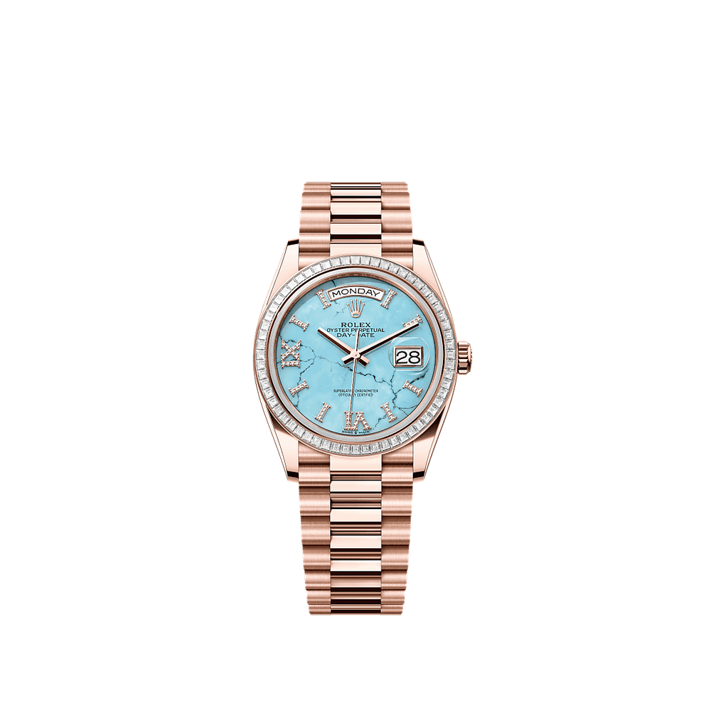 Rolex 128395TBR-0018 - Day-Date 36 Everose Gold - Baguette / Turquoise / President - Diamond