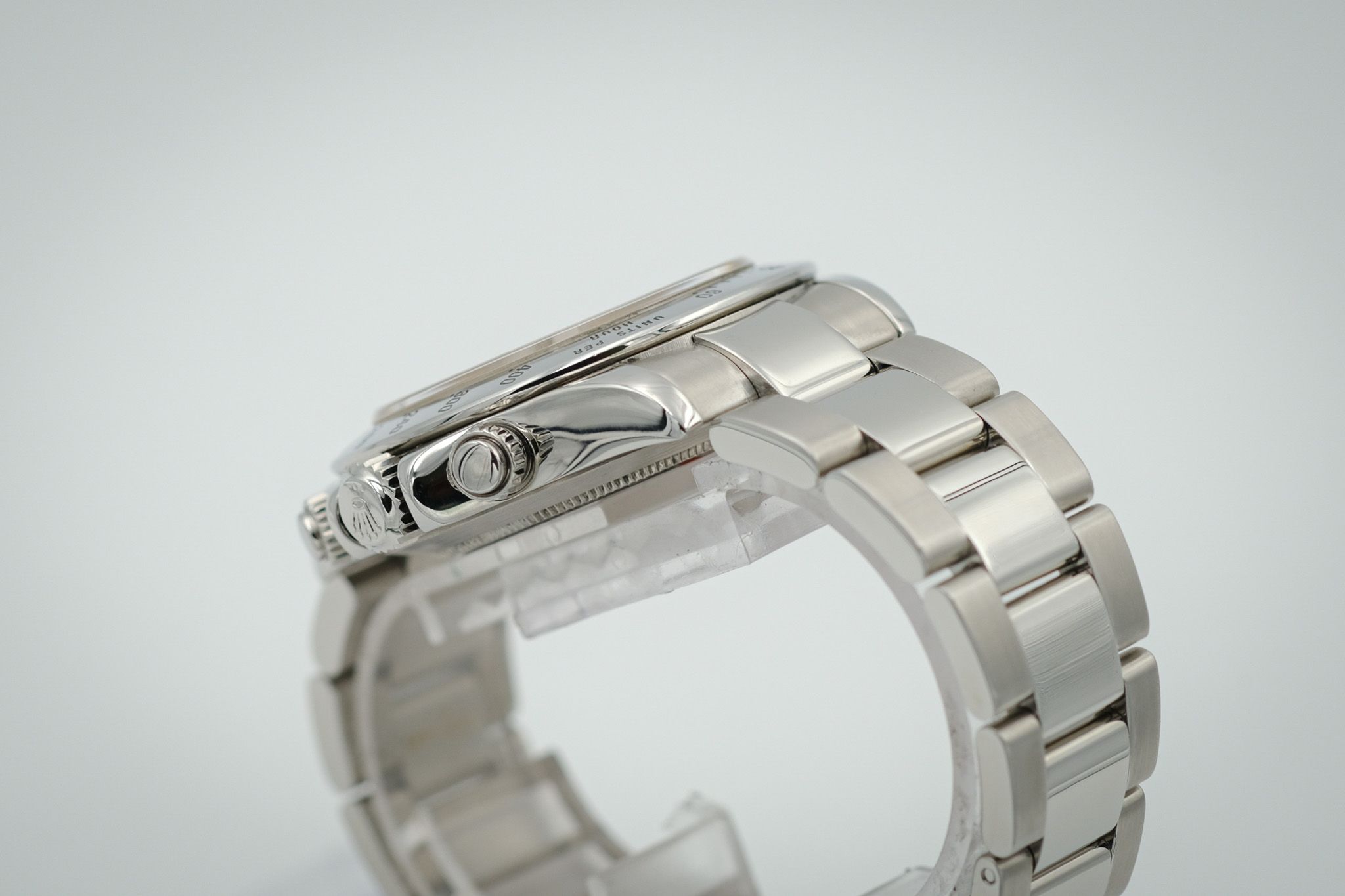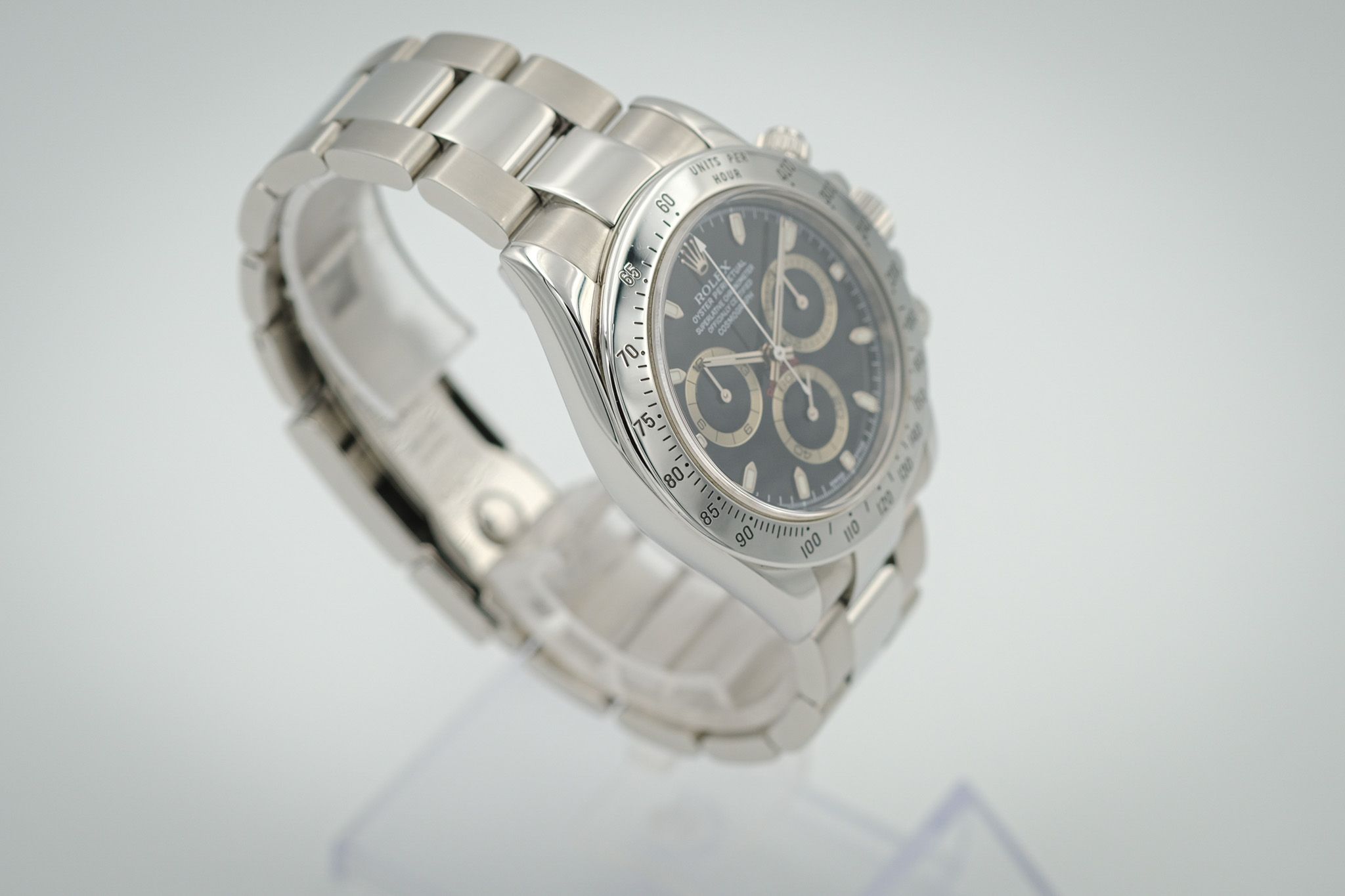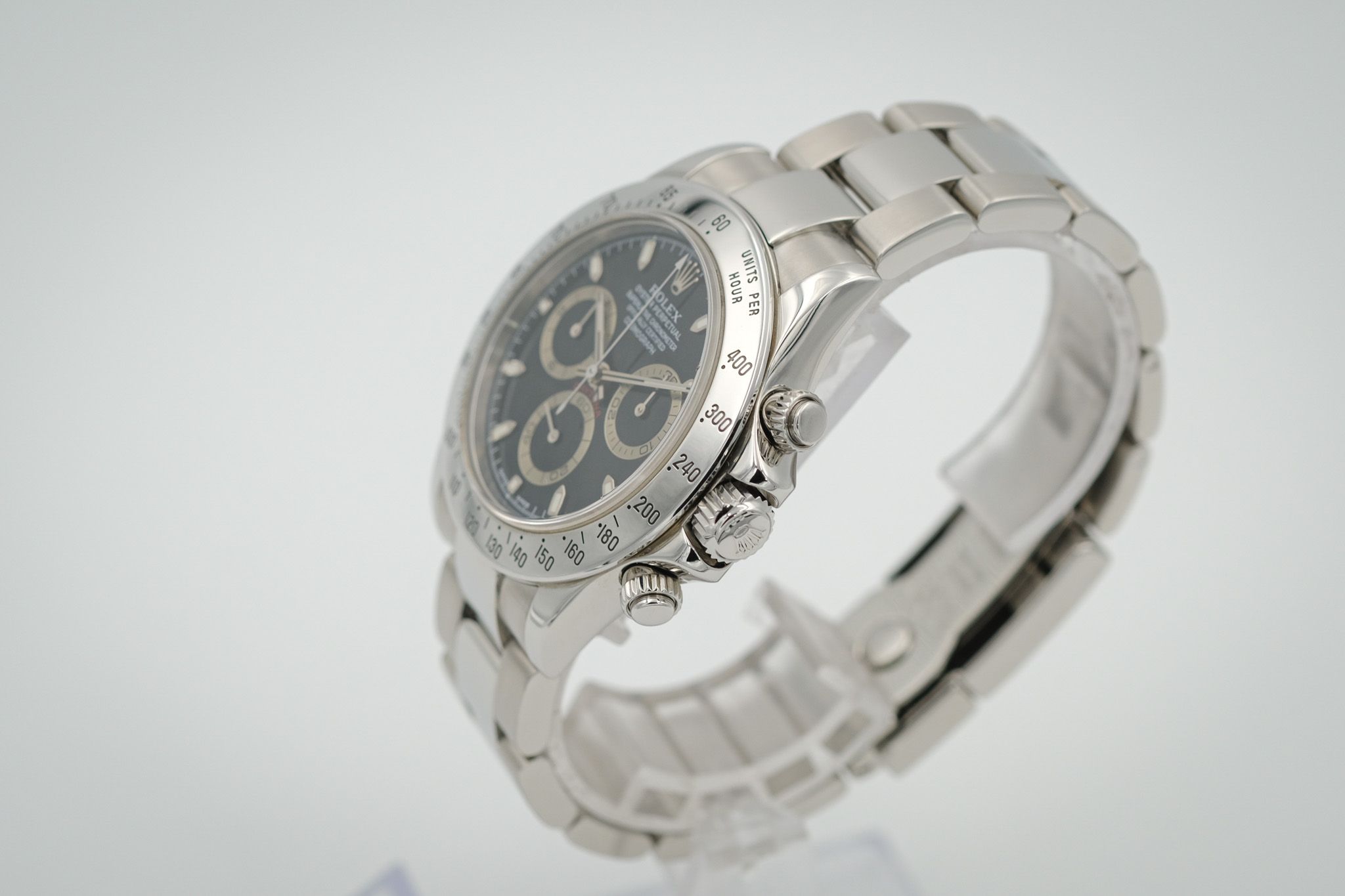Our Rolex Daytona offered here is from the year 2000, a P-Series and is therefore one of the first Daytonas from the “post-Zenith era” with the 4130 manufacture movement.The watch was professionally refurbished by the previous owner. Accordingly, the watch is in very good condition with hardly any visible signs of wear. The old protective sticker on the case cover is still present.